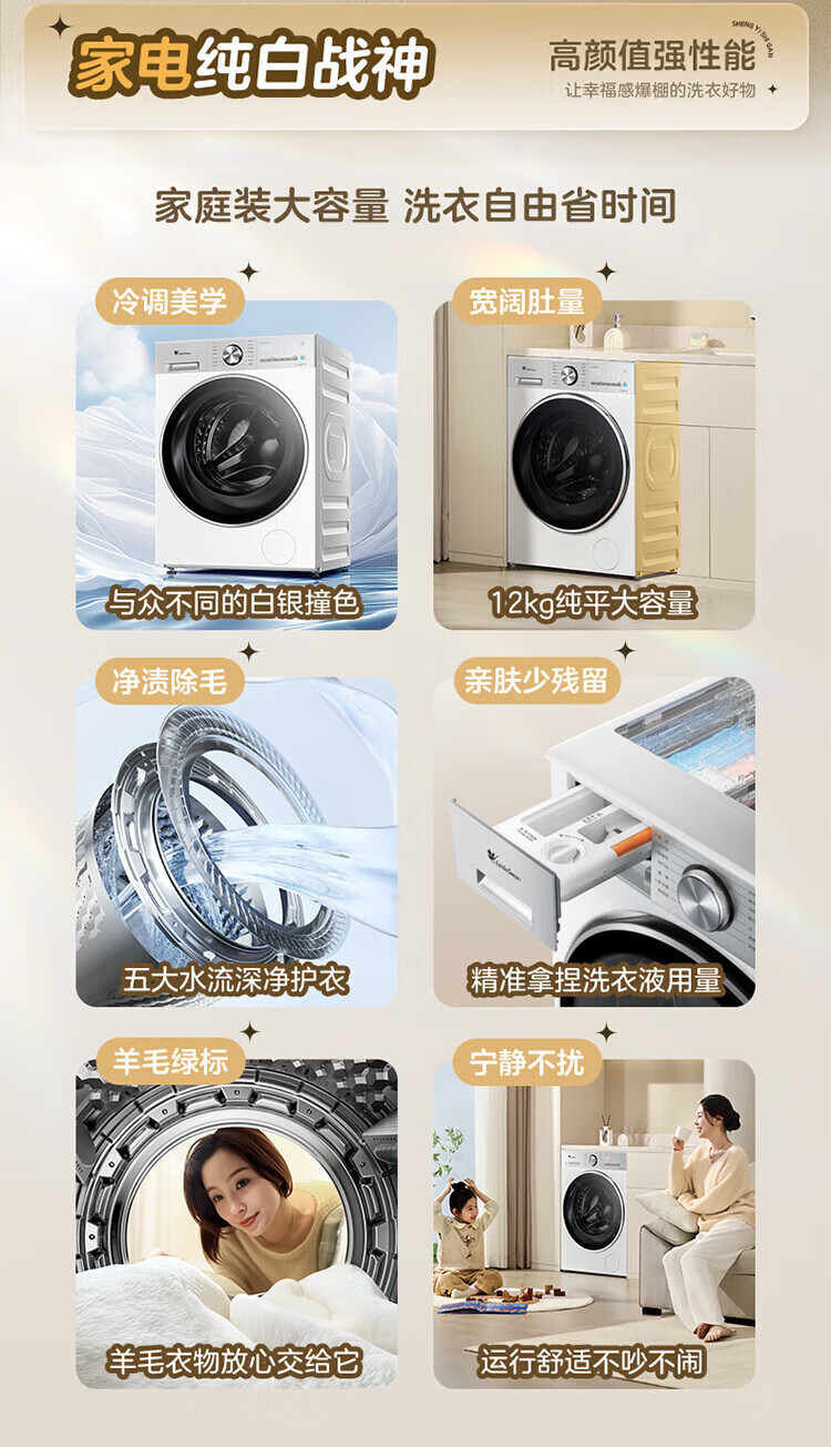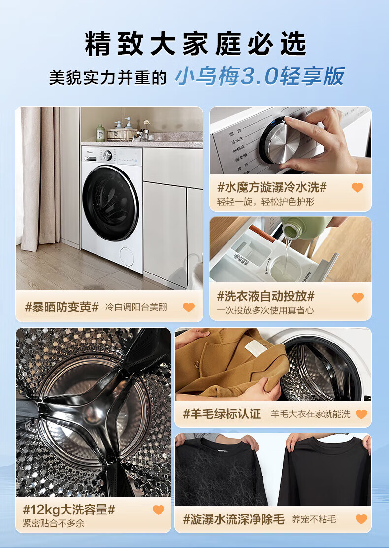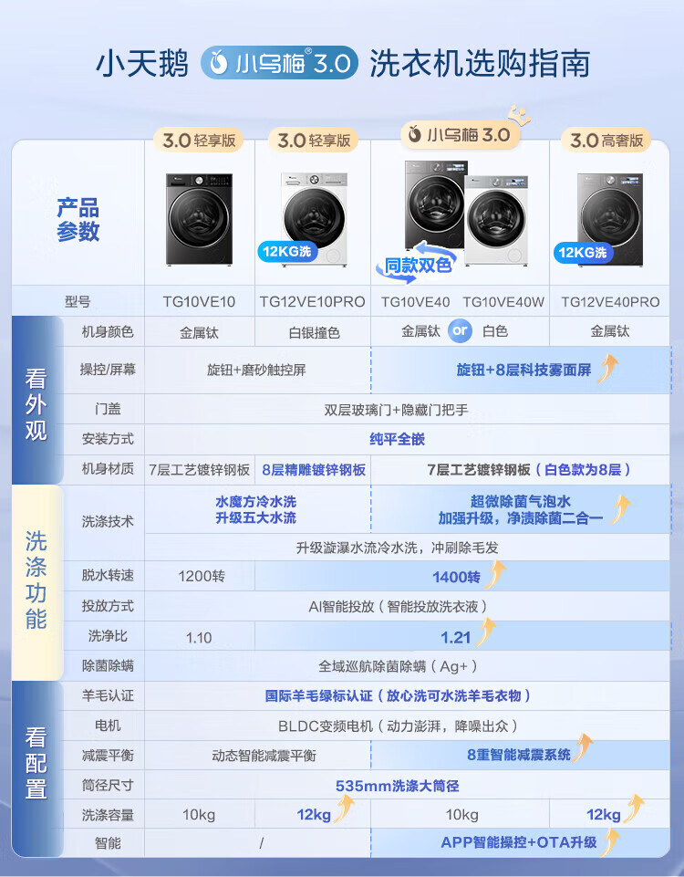 小天鹅(LittleSwan)12公斤滚筒洗衣机全自动家用纯平全嵌大容量洗脱/洗烘一体高洗净比小乌梅3.0轻享版VE10PRO 12KG【小乌梅3.0轻享版】VE10PRO 单洗