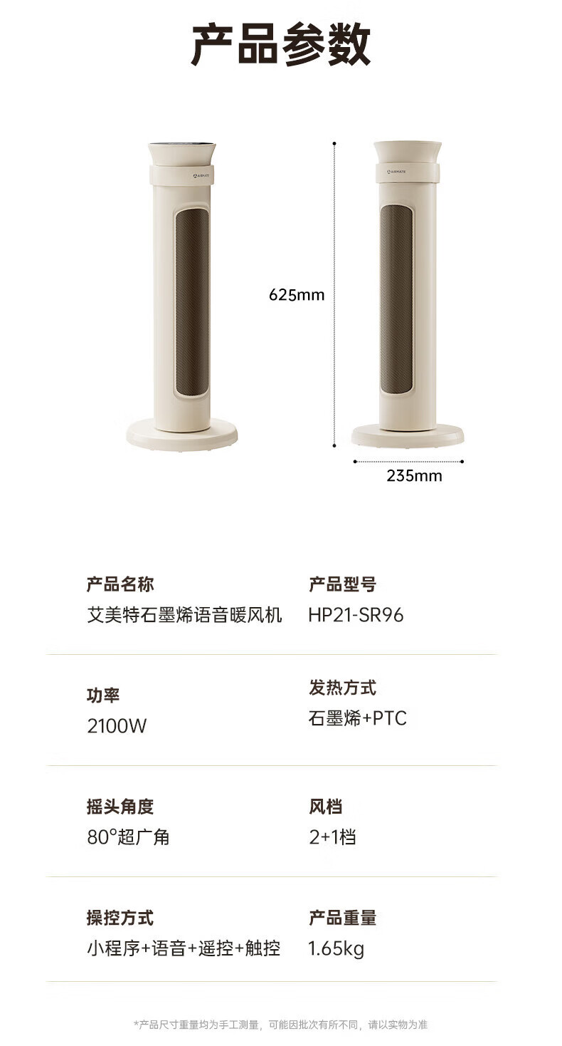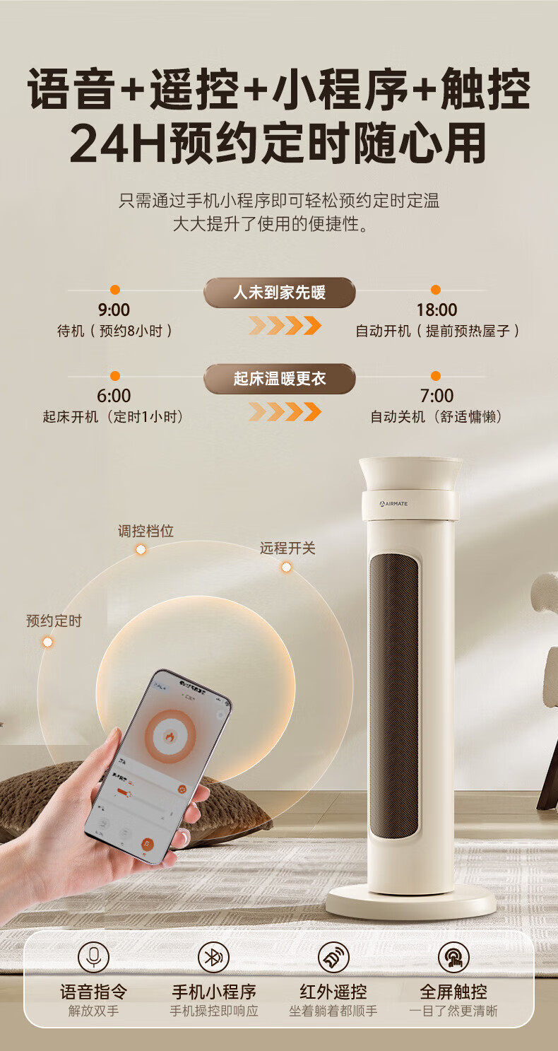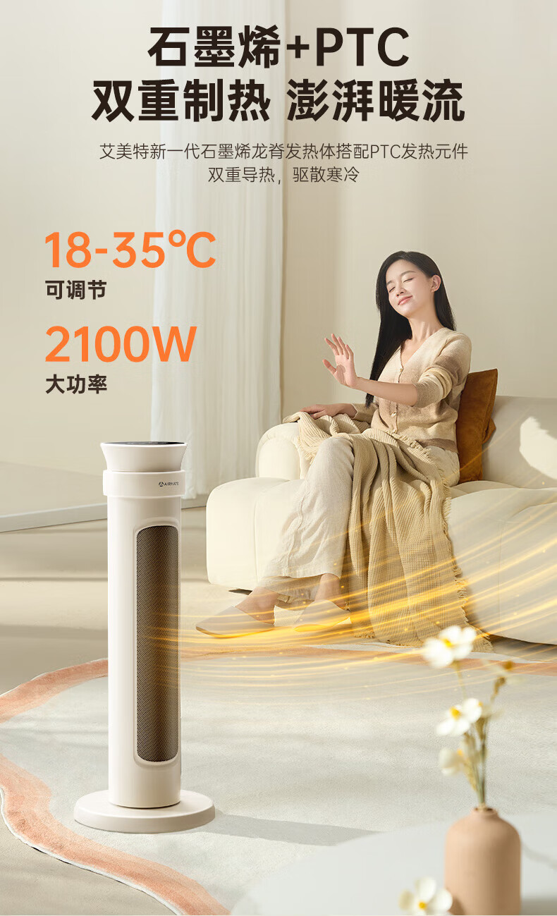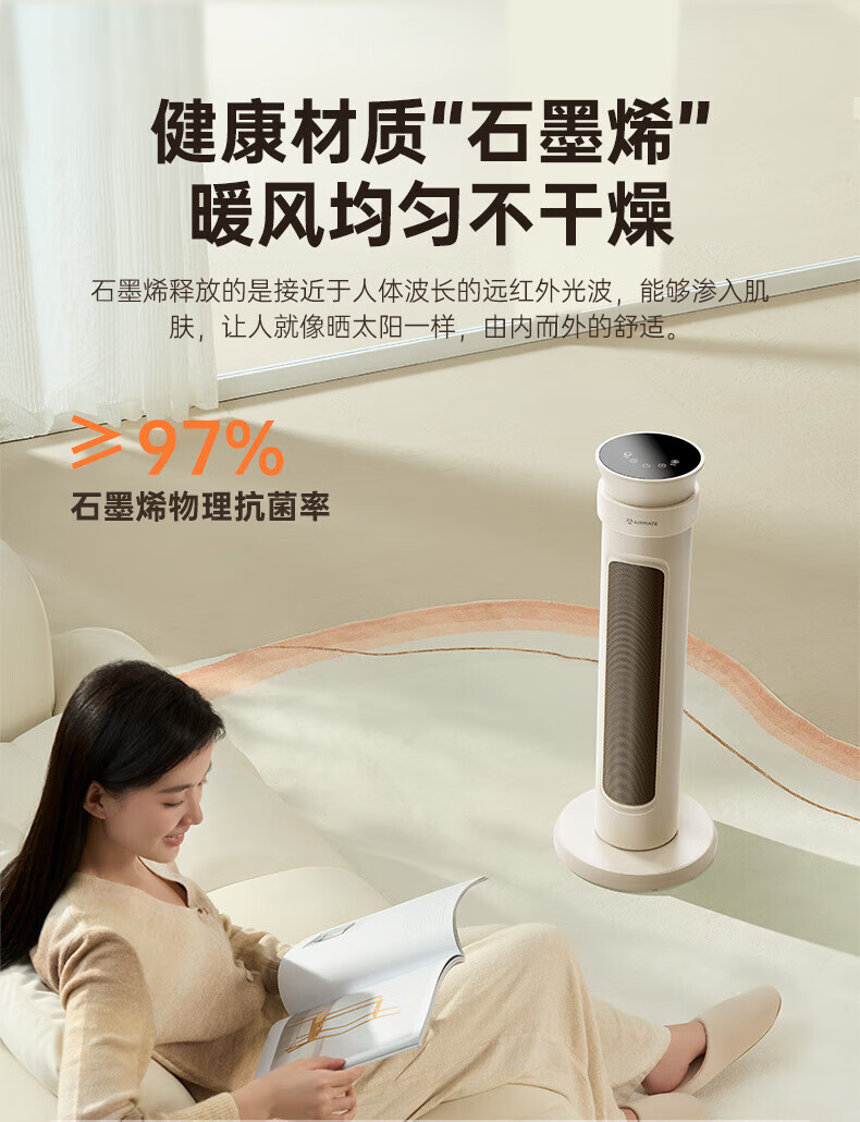 艾美特(AIRMATE)石墨烯暖风机家用节能取暖器语音智控大功率摇头塔式电暖风速热风机宿舍卧室取暖神器办公室电暖气 【远程遥控款】石墨烯3S速热