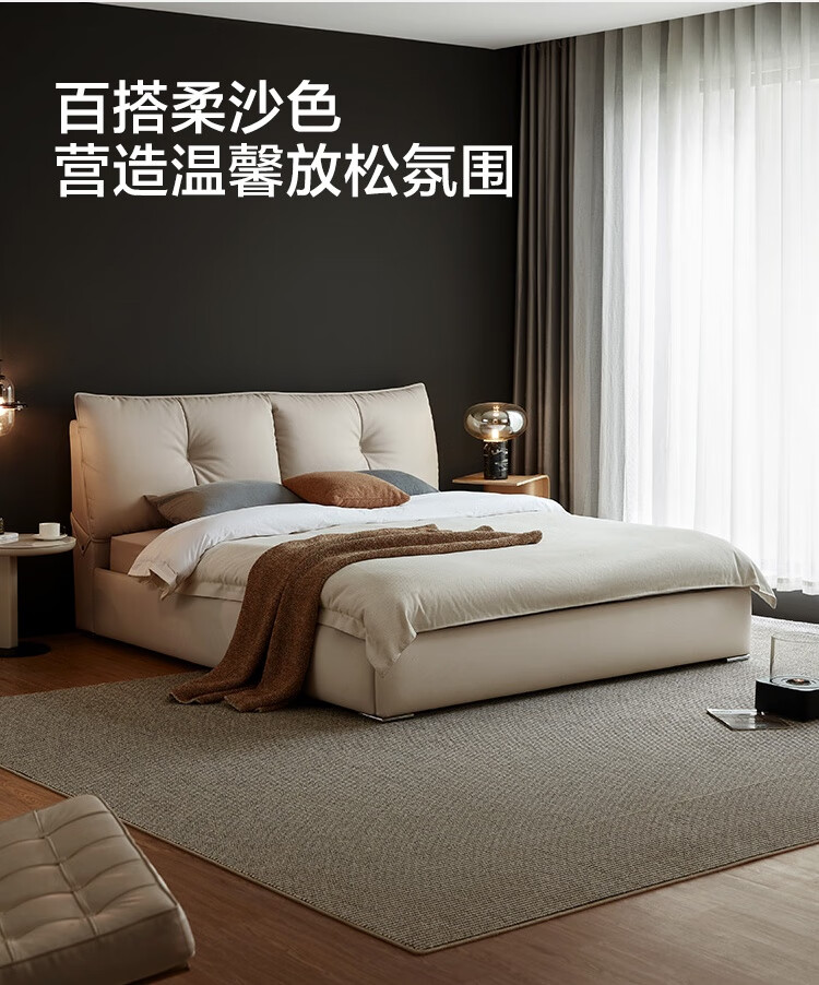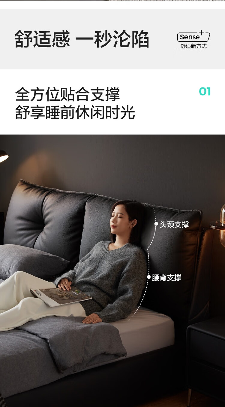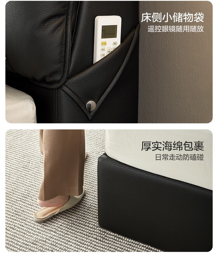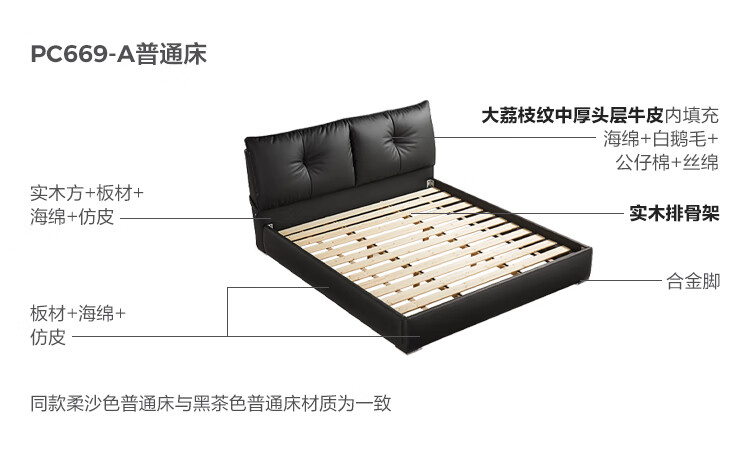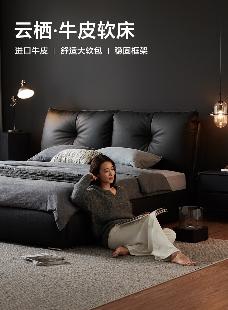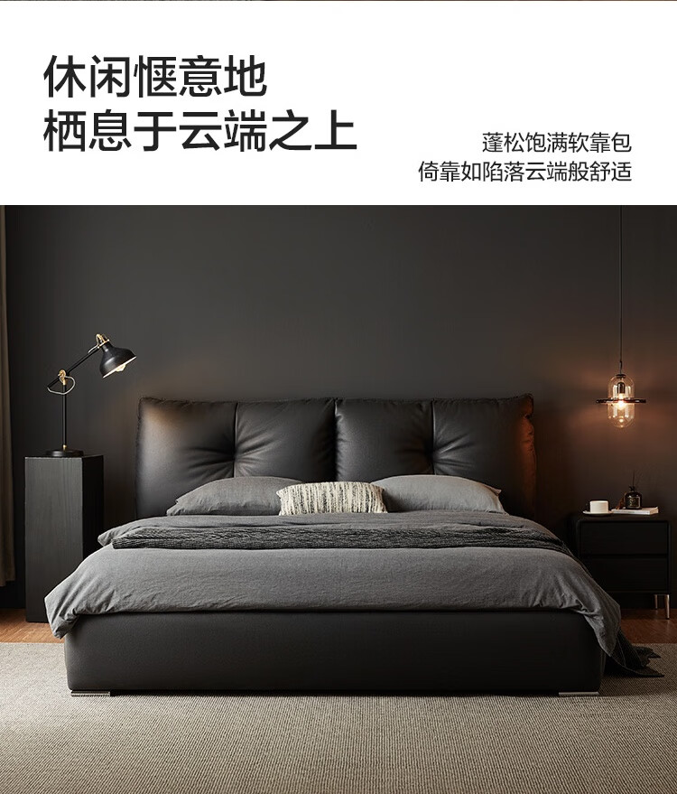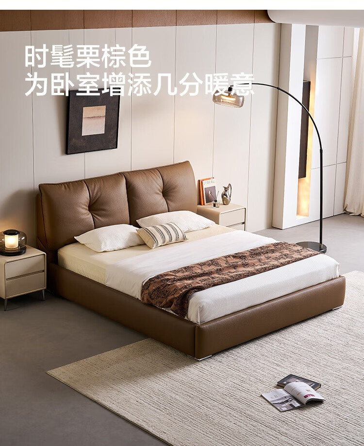 林氏家居双人床1.8米大黑牛意式极简床落地真皮高端大气主卧软包床PC669 黑茶色【落地床】可选净味棕垫 1.5x2.0米 组合样式 单床