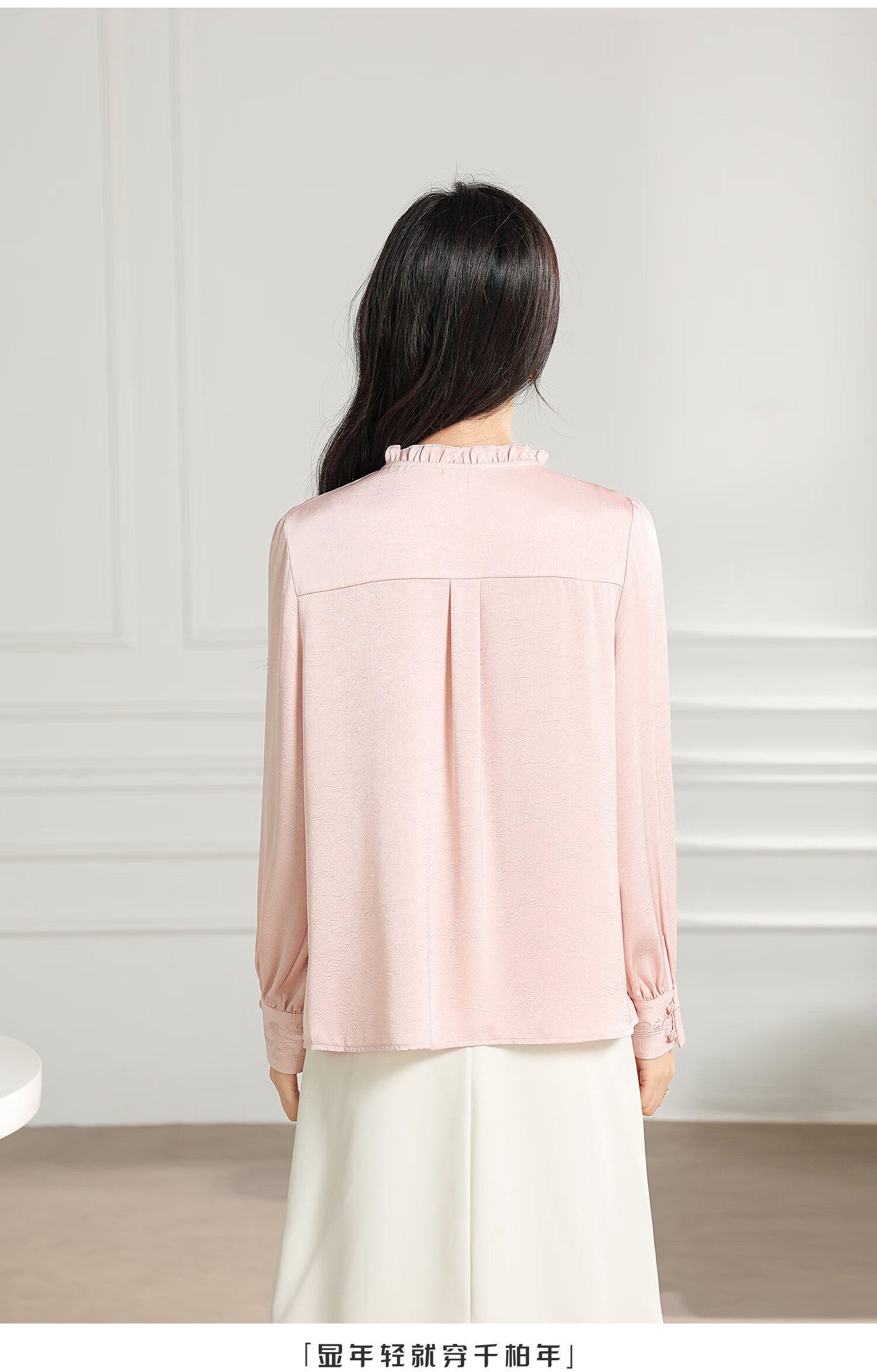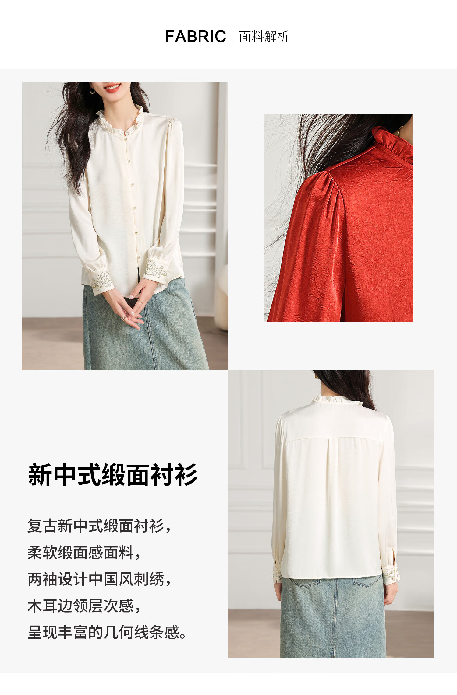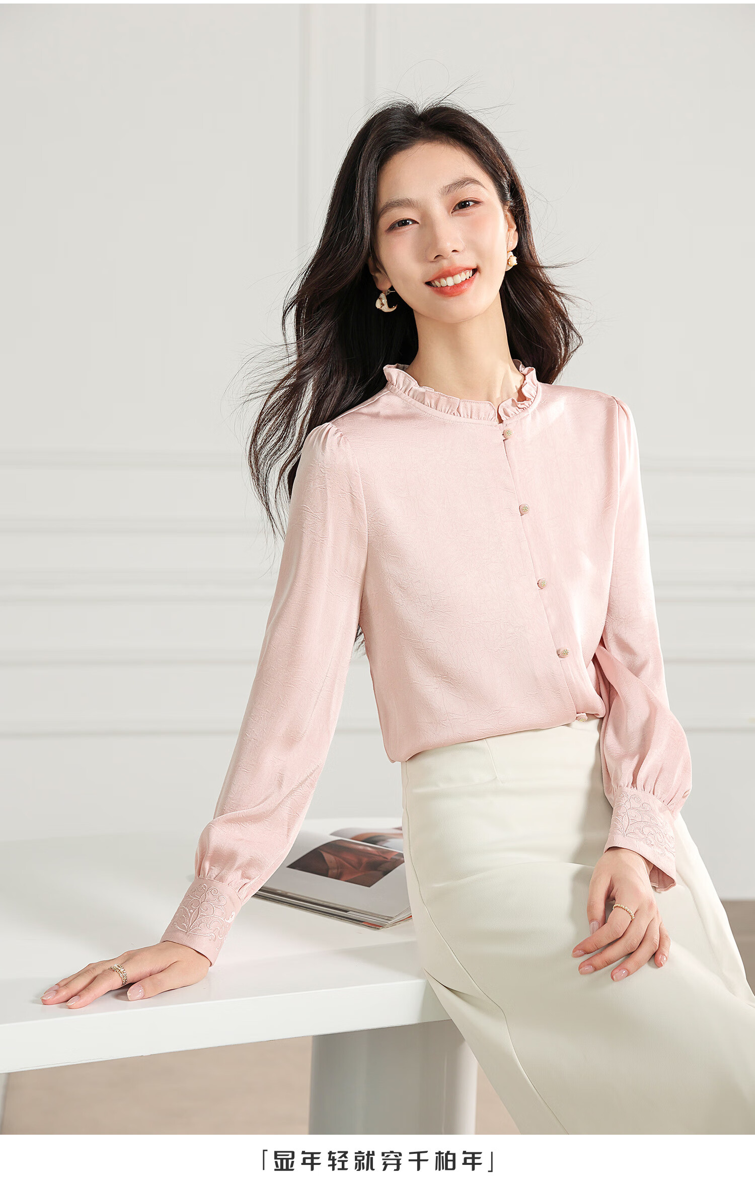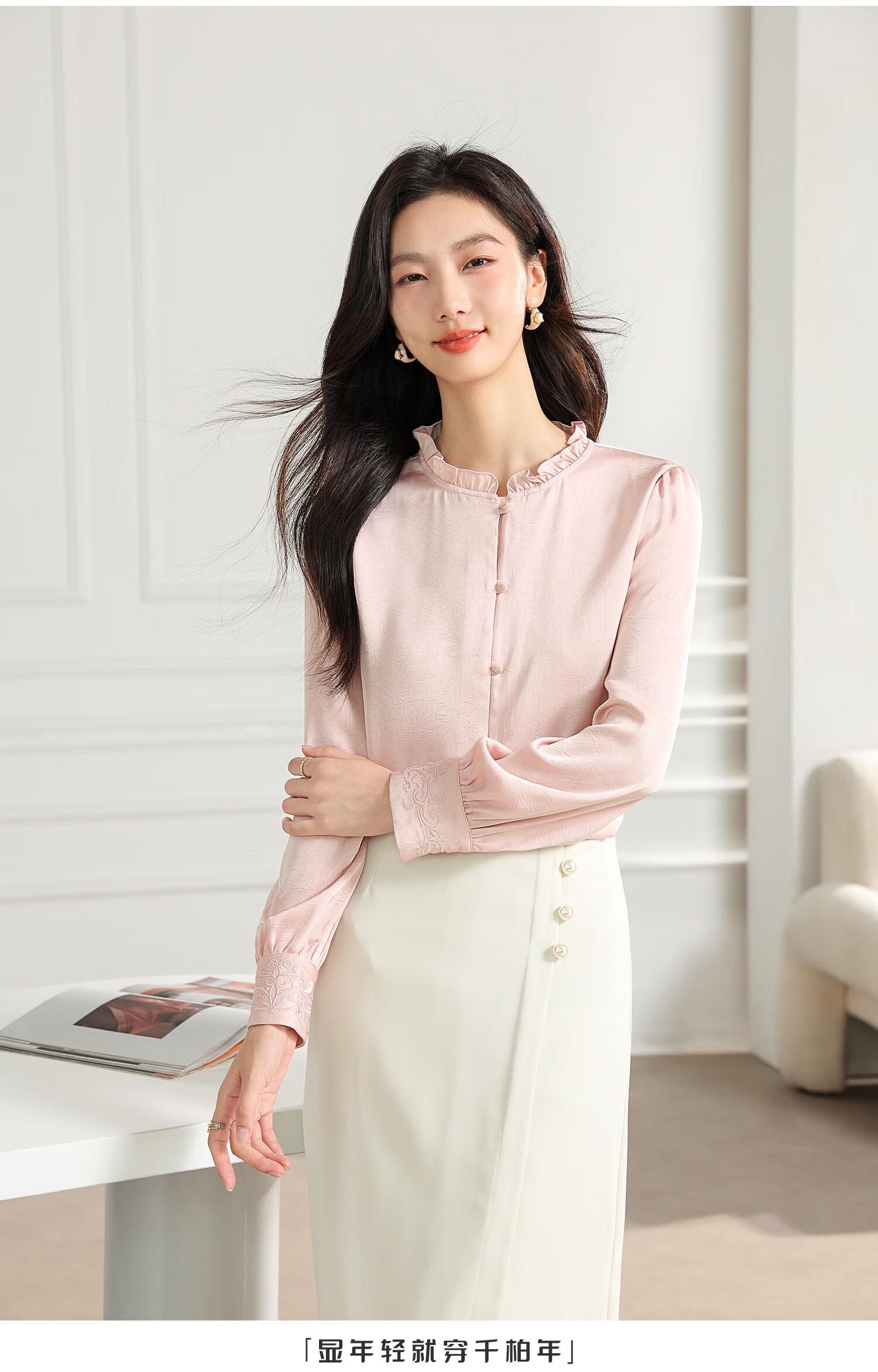 千柏年复古新中式刺绣缎面气质衬衫女25年春秋新款立领木耳边高级上衣 樱花粉(光泽缎面) 3XL 140-150斤