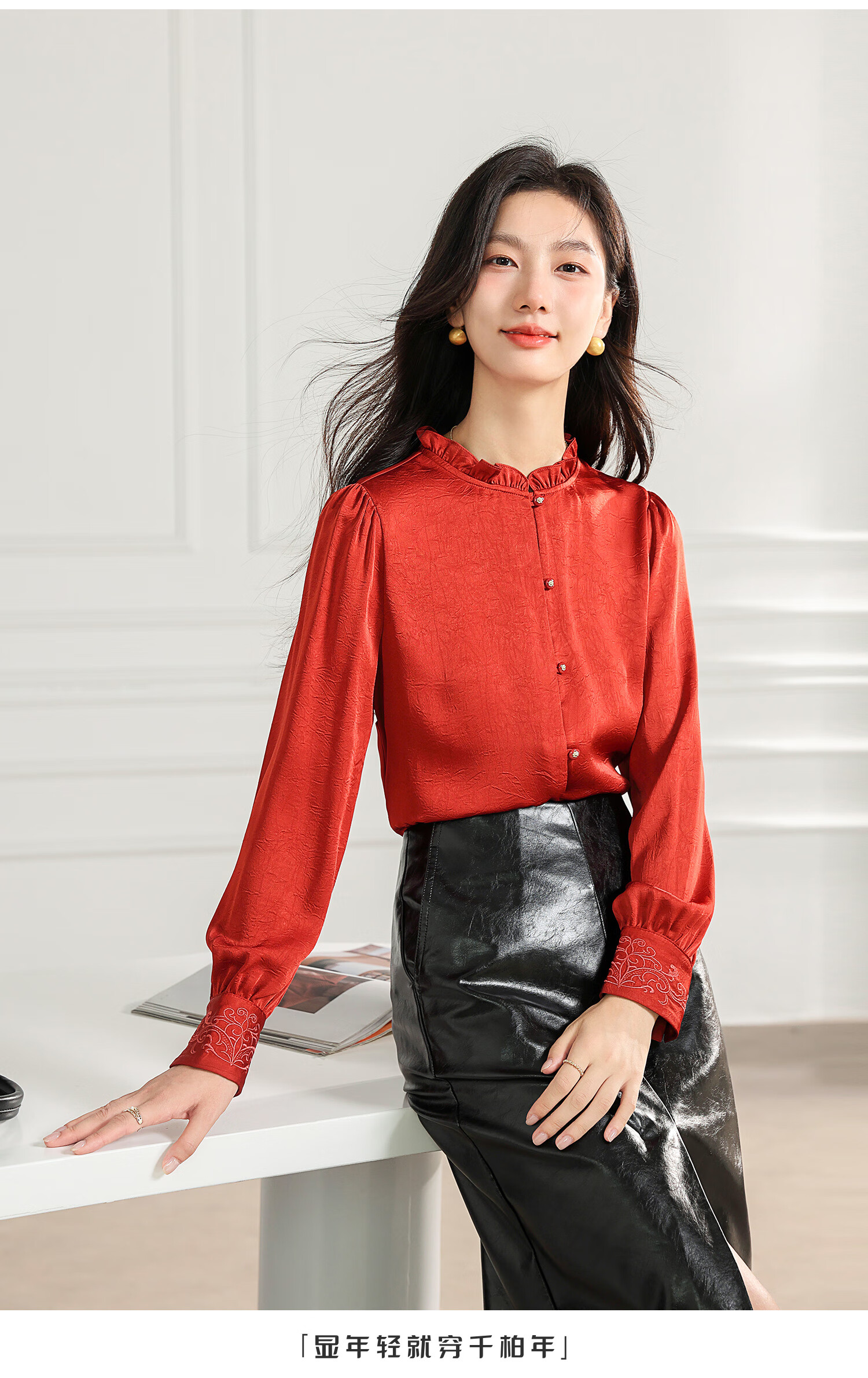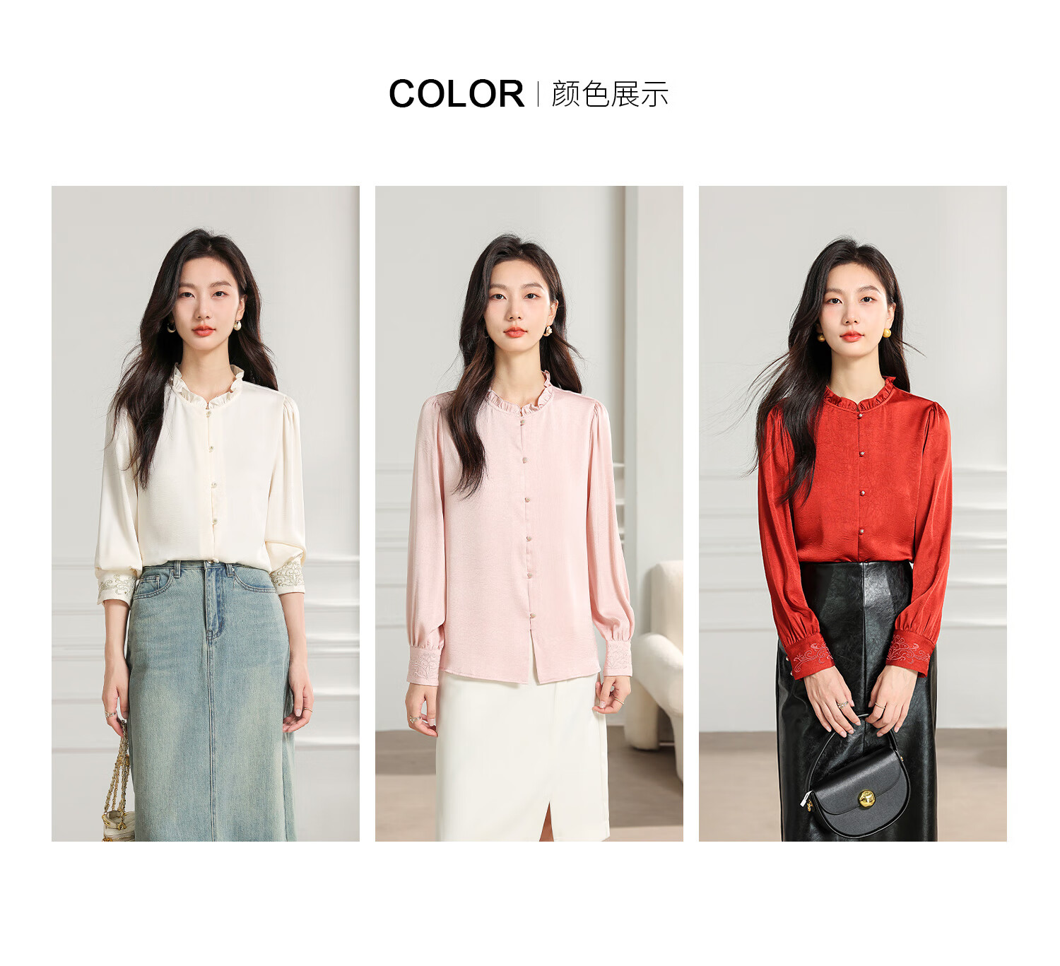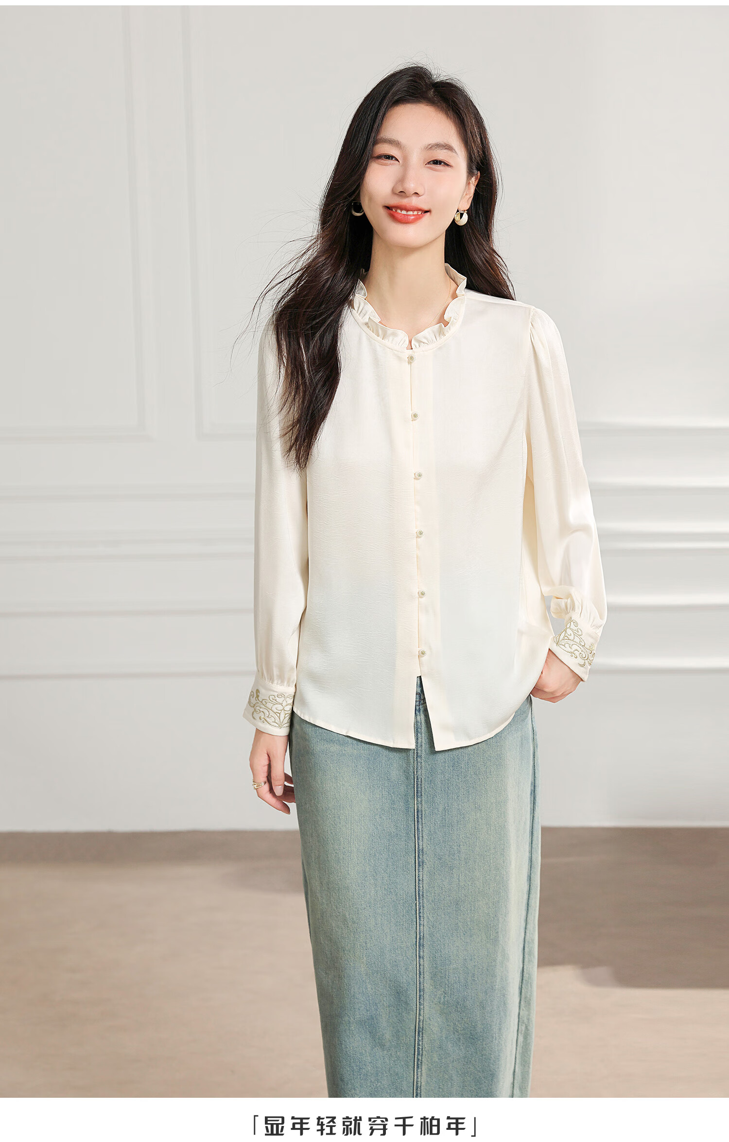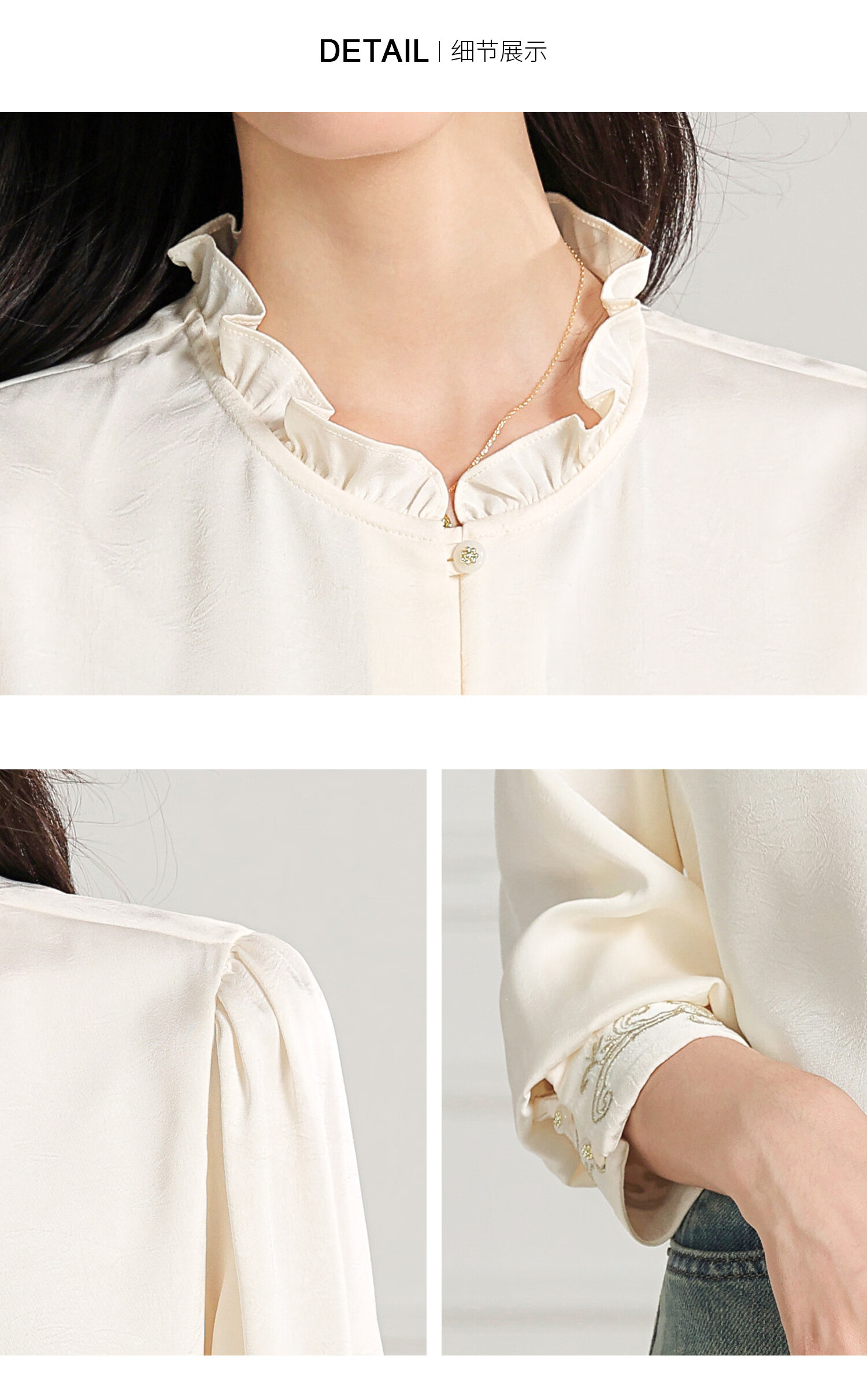 千柏年复古新中式刺绣缎面气质衬衫女25年春秋新款立领木耳边高级上衣 樱花粉(光泽缎面) 3XL 140-150斤