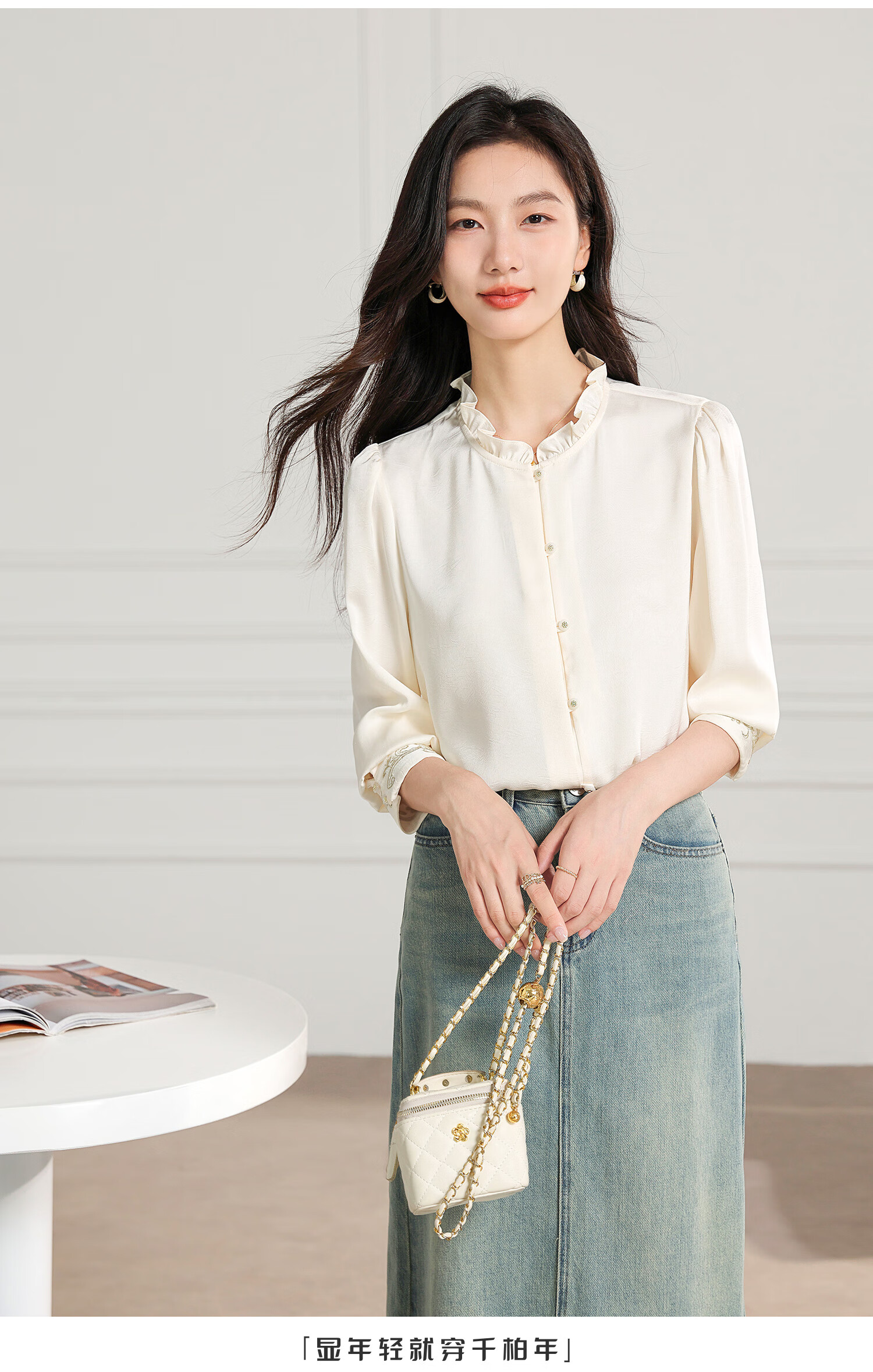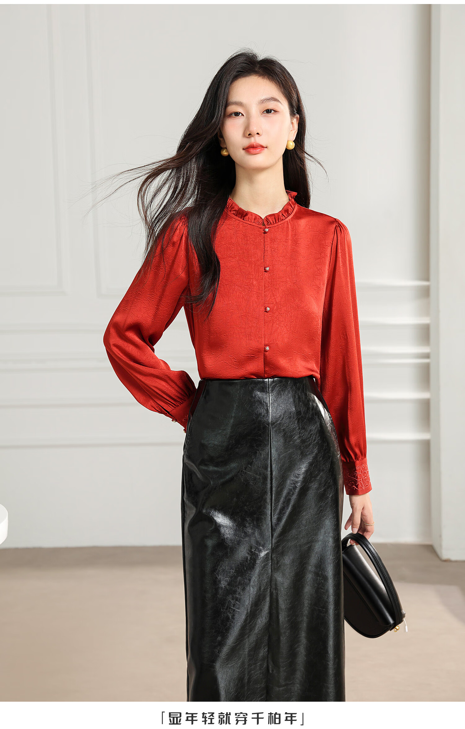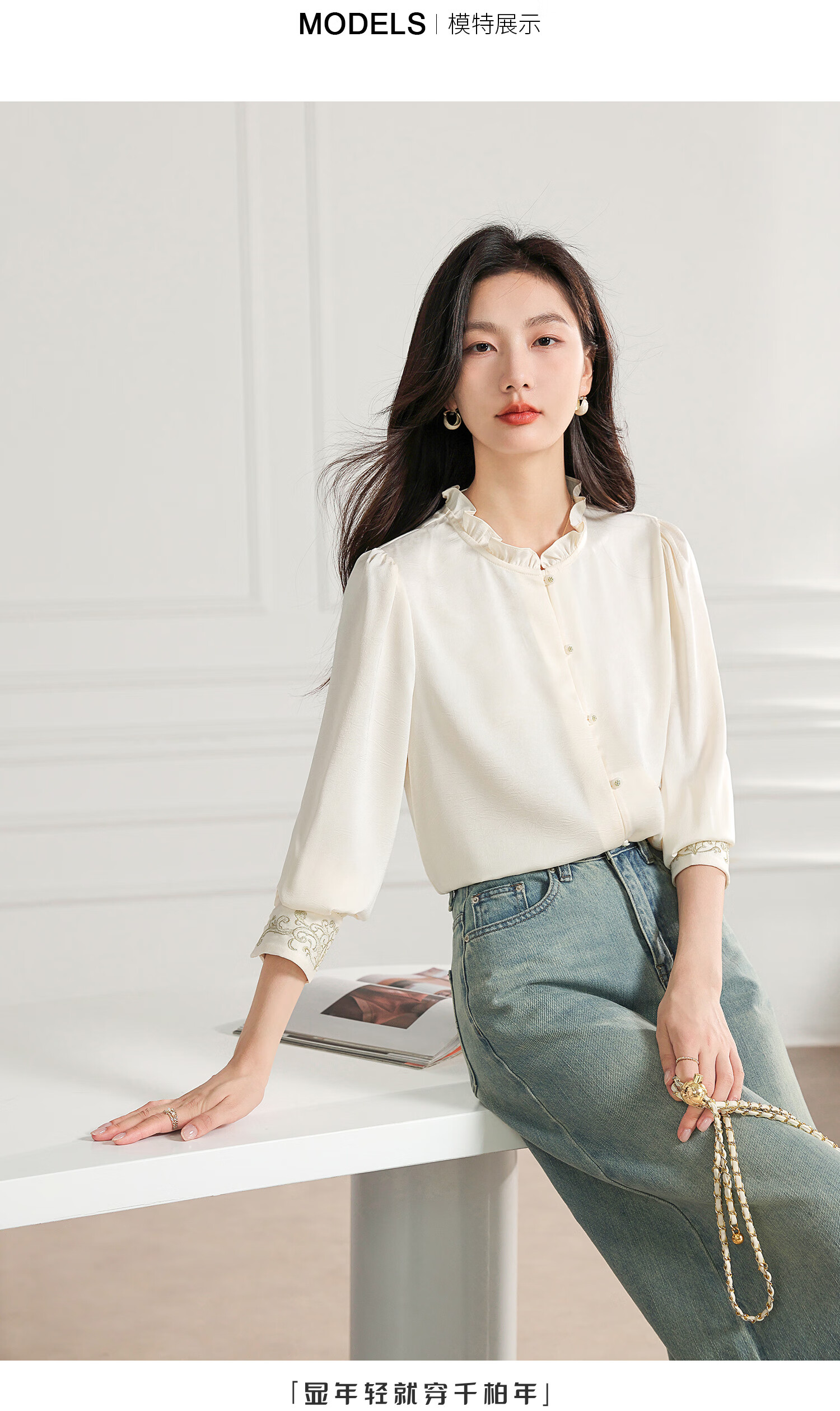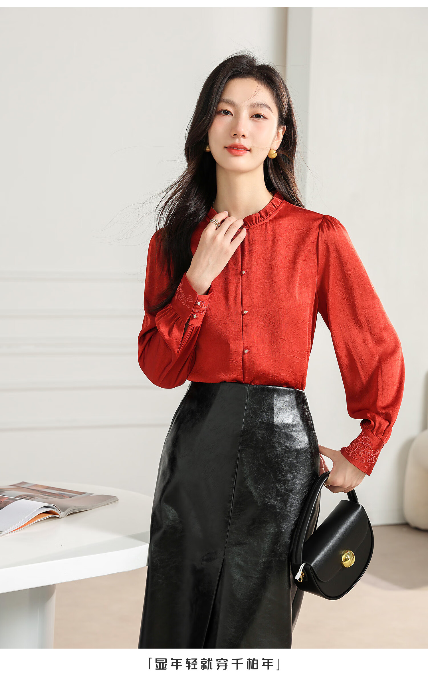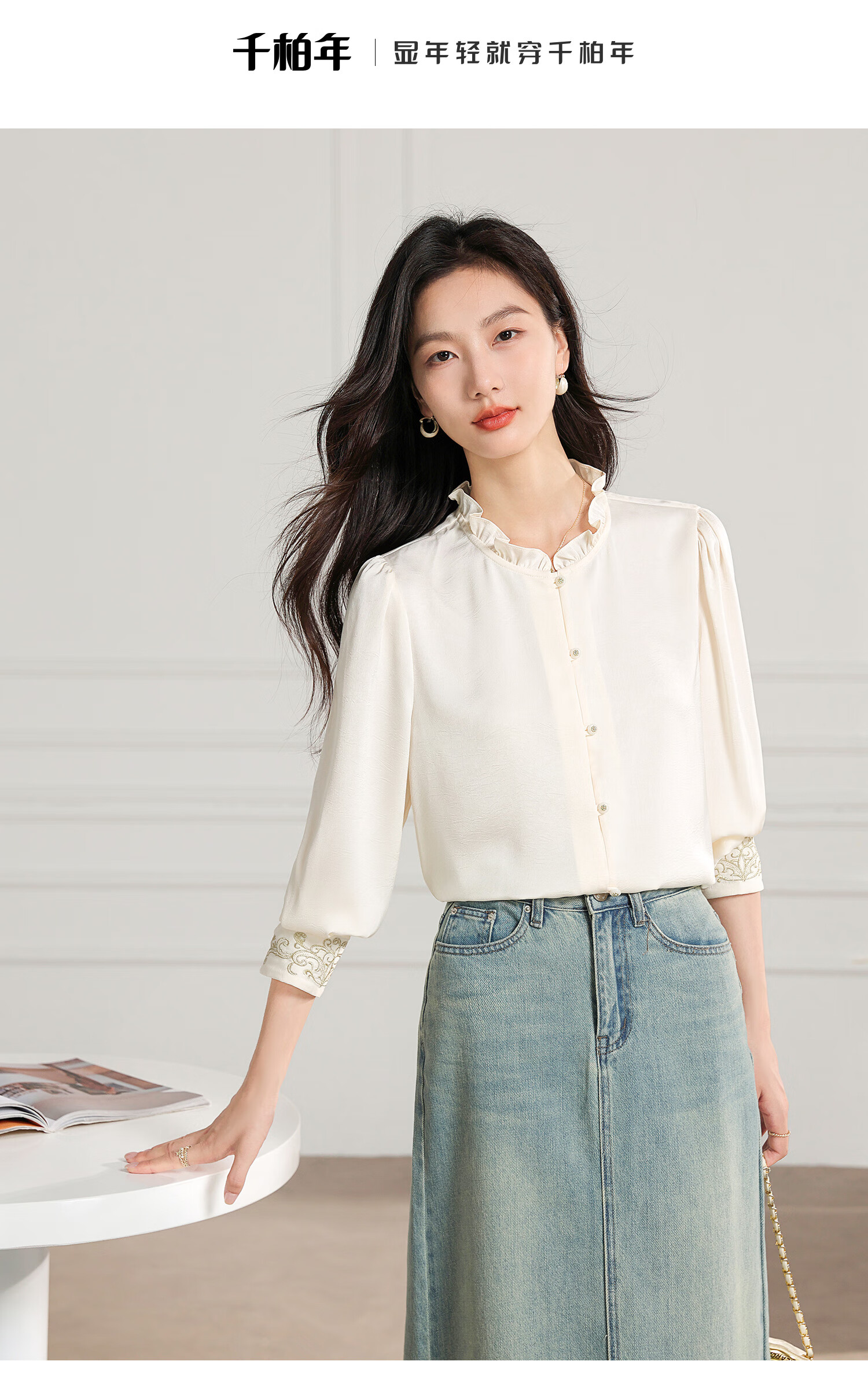 千柏年复古新中式刺绣缎面气质衬衫女25年春秋新款立领木耳边高级上衣 樱花粉(光泽缎面) 3XL 140-150斤