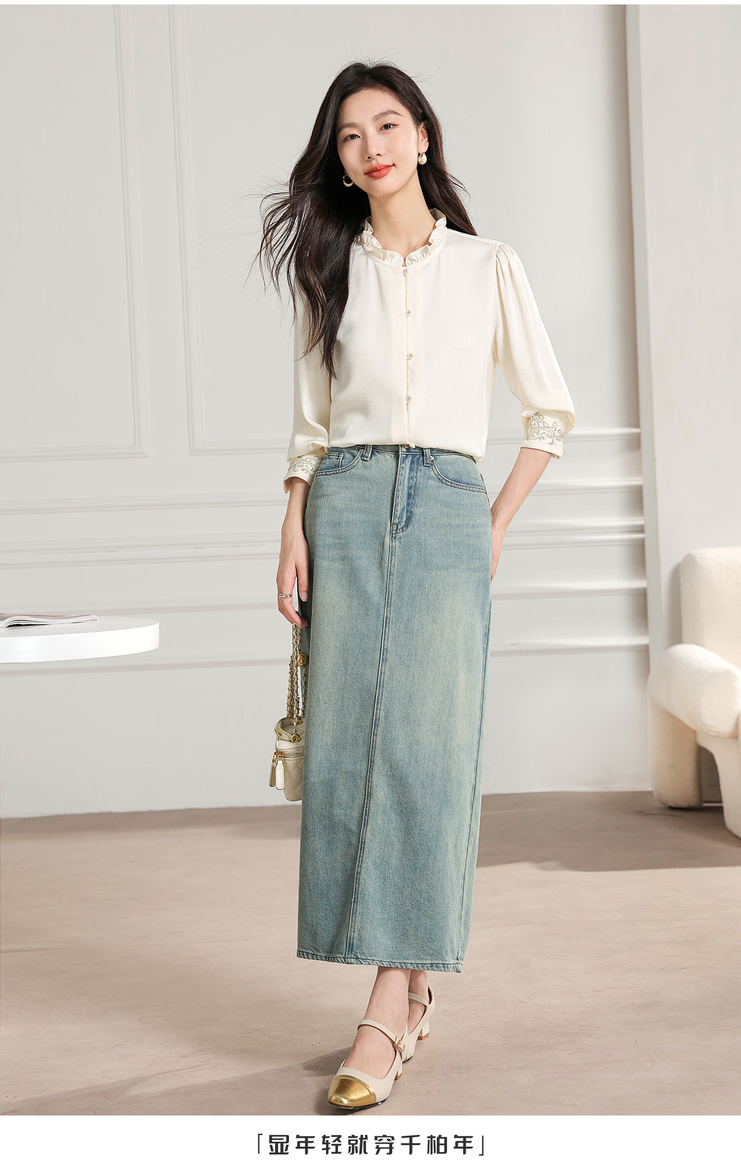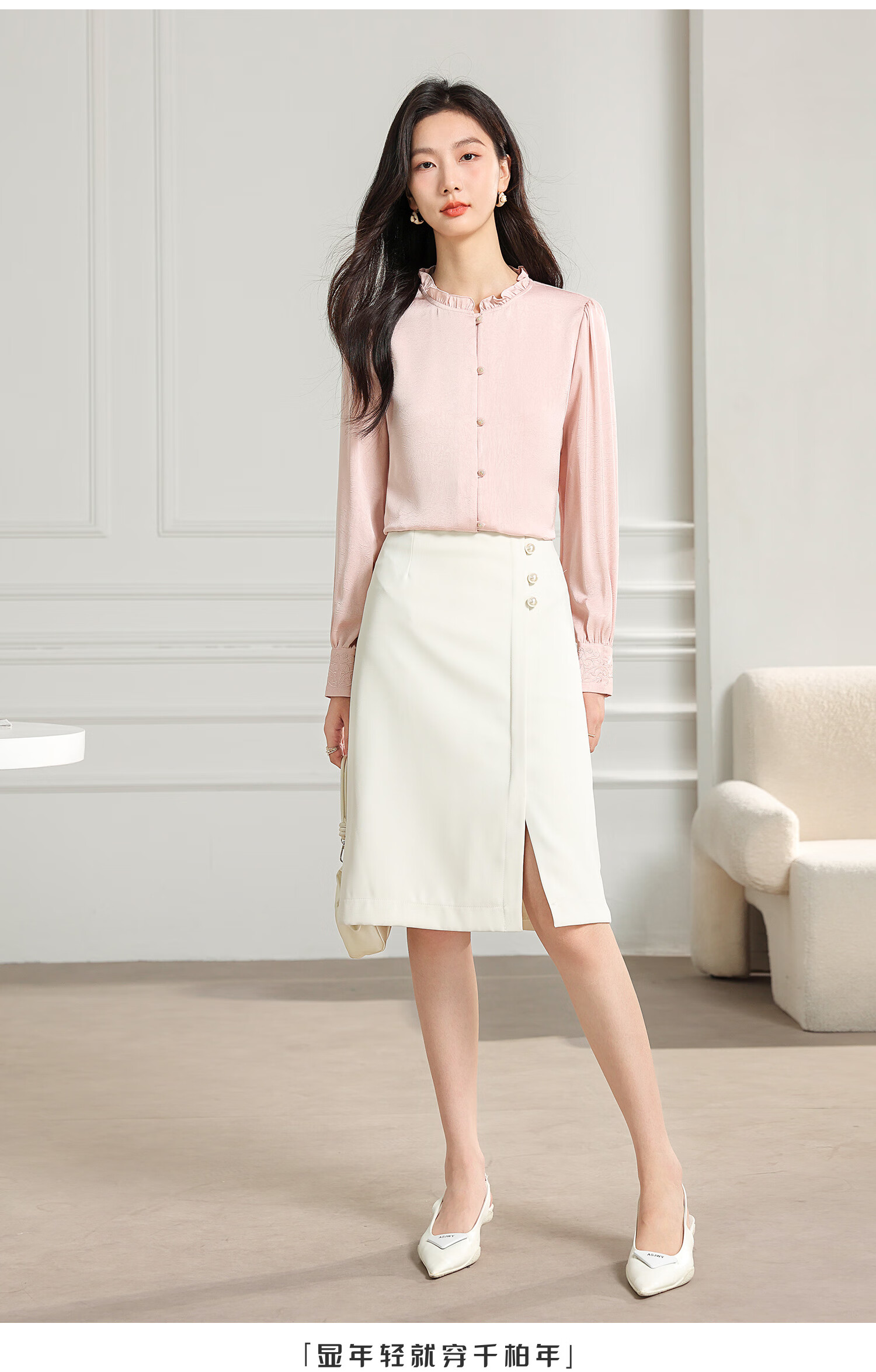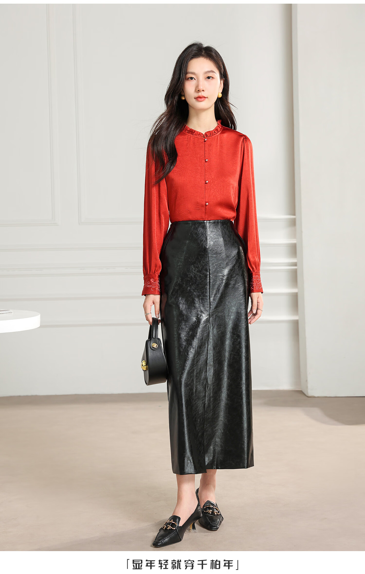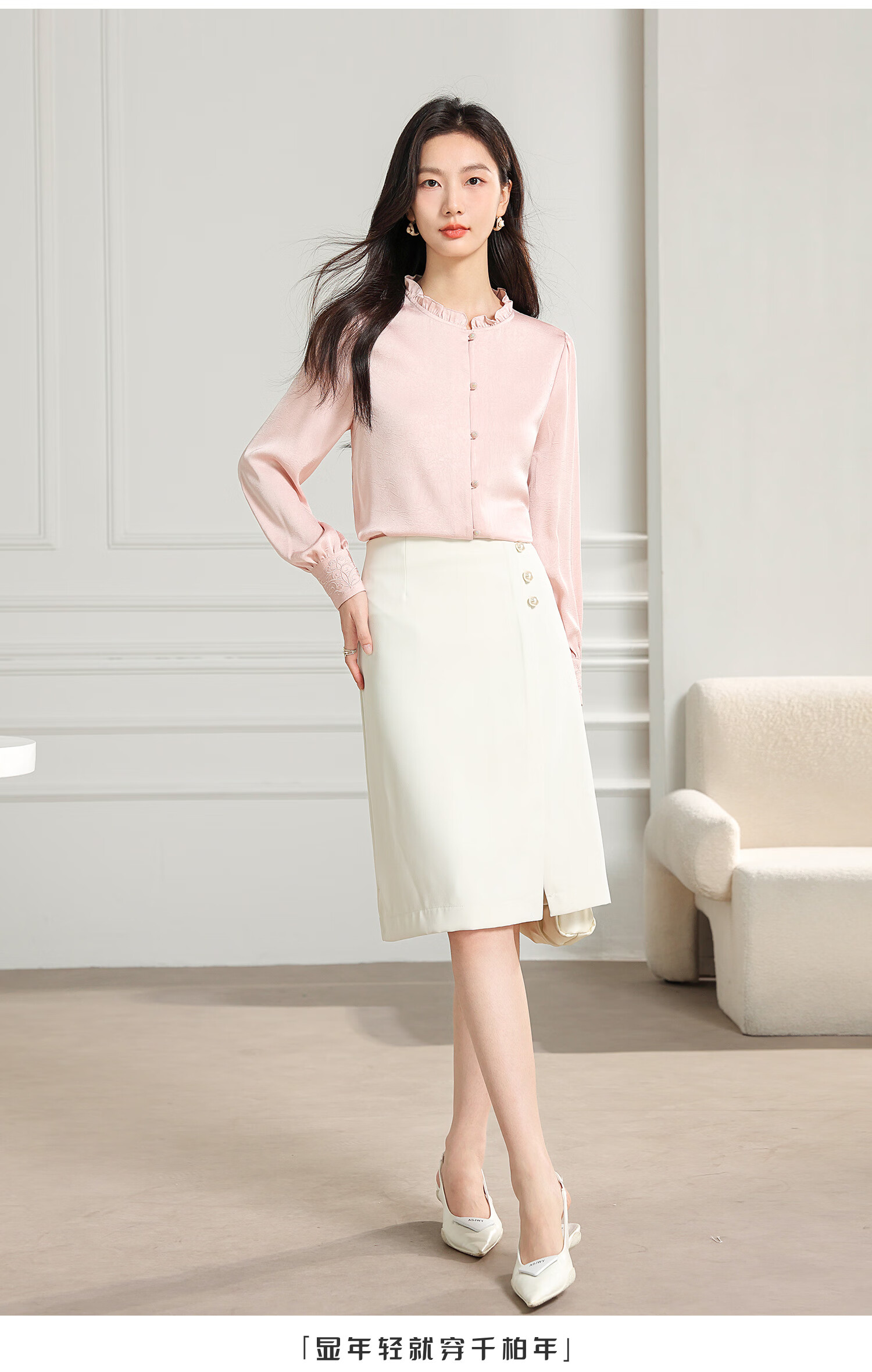千柏年复古新中式刺绣缎面气质衬衫女25年春秋新款立领木耳边高级上衣 樱花粉(光泽缎面) 3XL 140-150斤