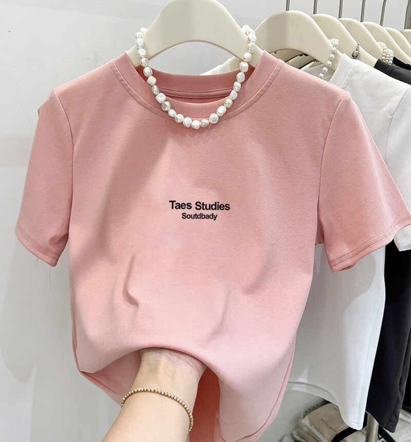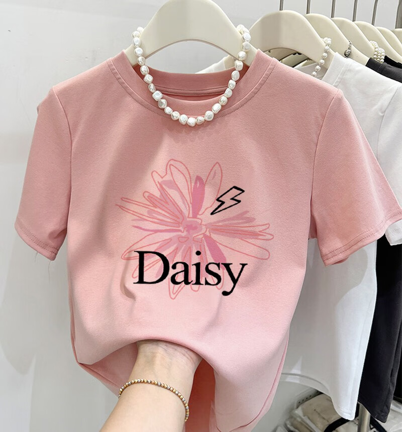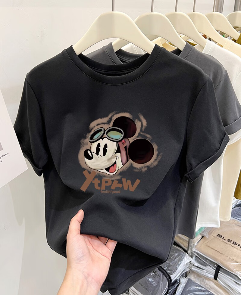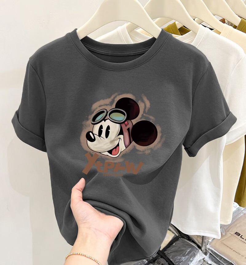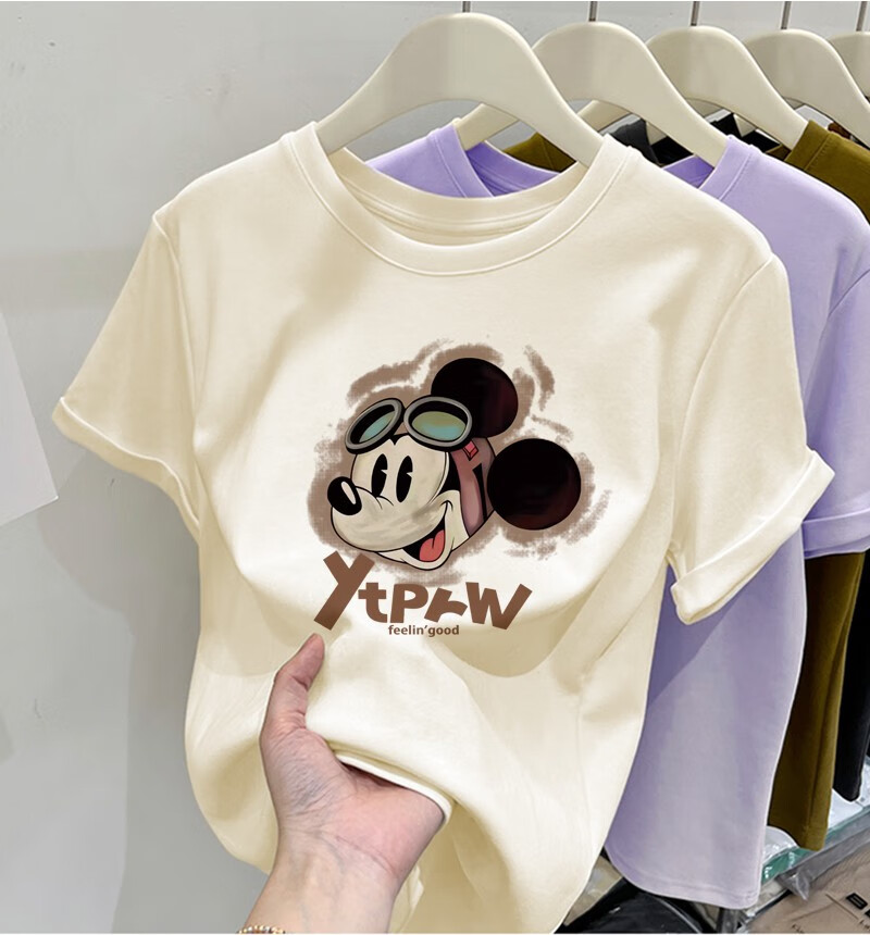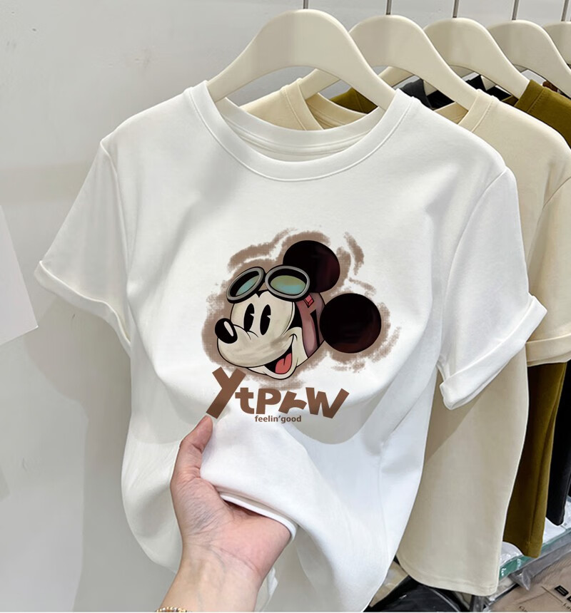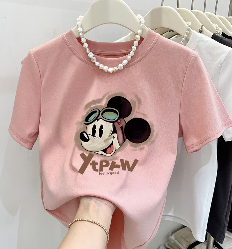 正肩纯棉短袖T恤女2025早秋新款ins风潮流宽松休闲百搭打底衫半袖 粉色(眼镜米奇款) 2XL