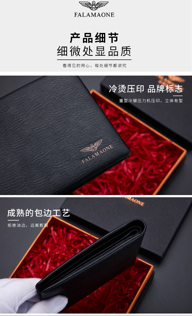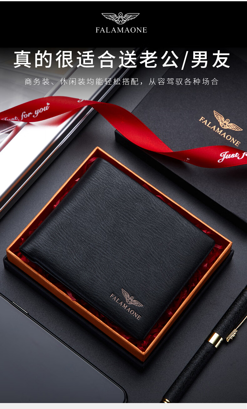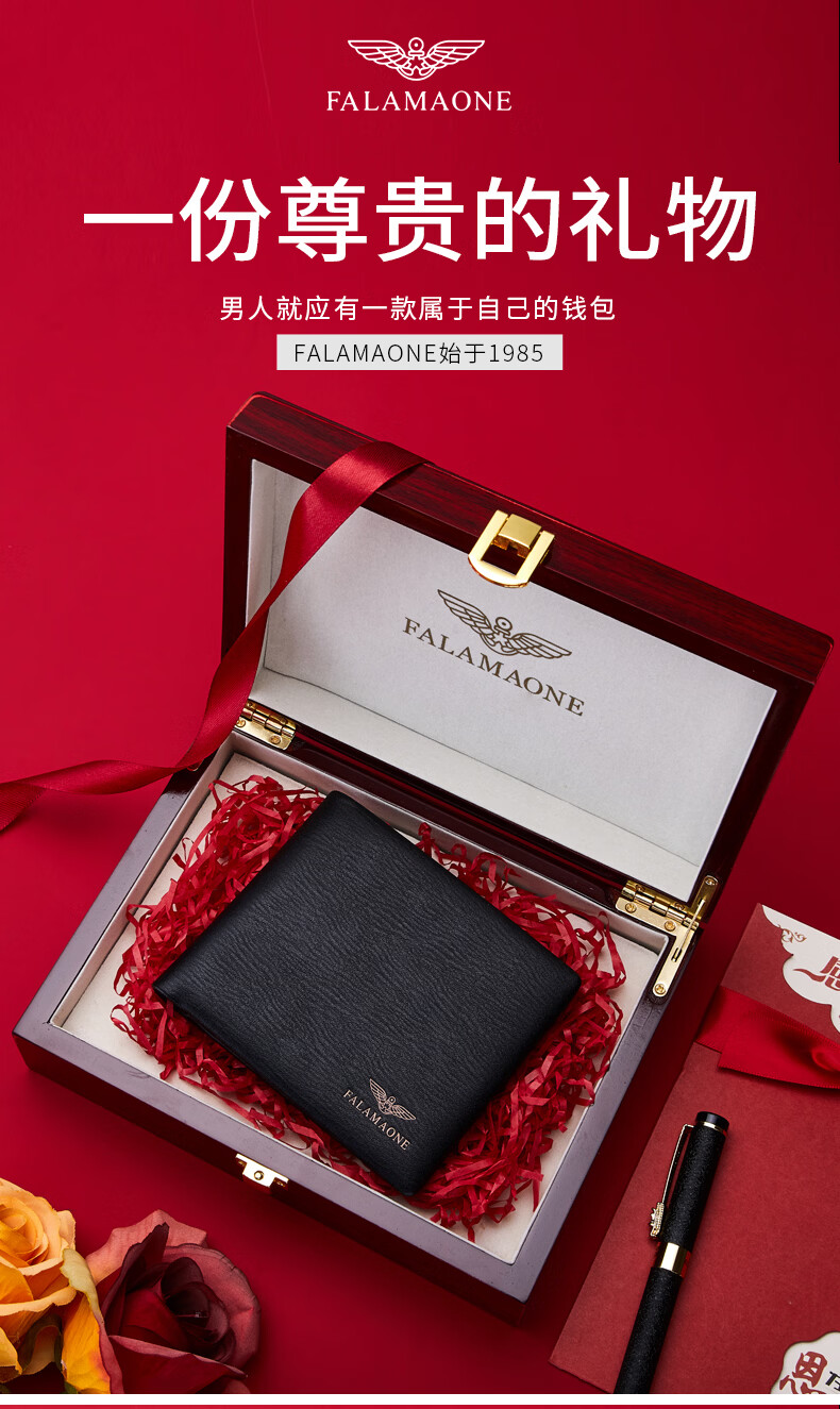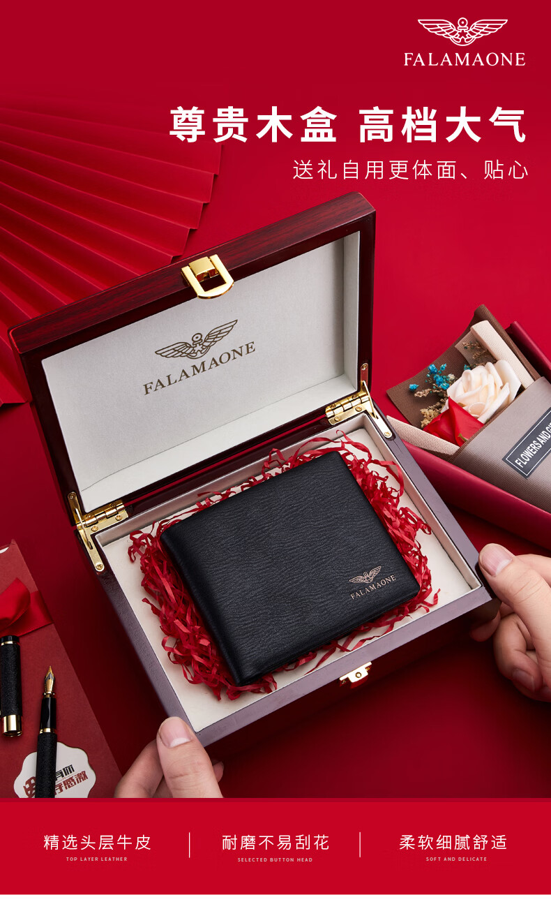 FALAMAONE法莱阿玛尼钱包男士短款真皮多功能钱夹时尚皮夹礼物送男友老公 黑色【实木礼盒】