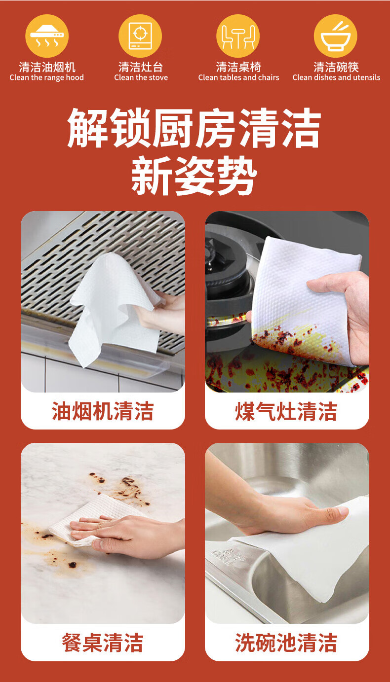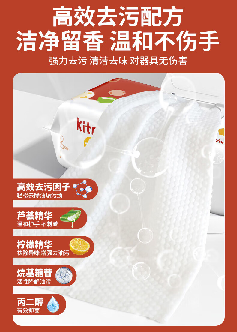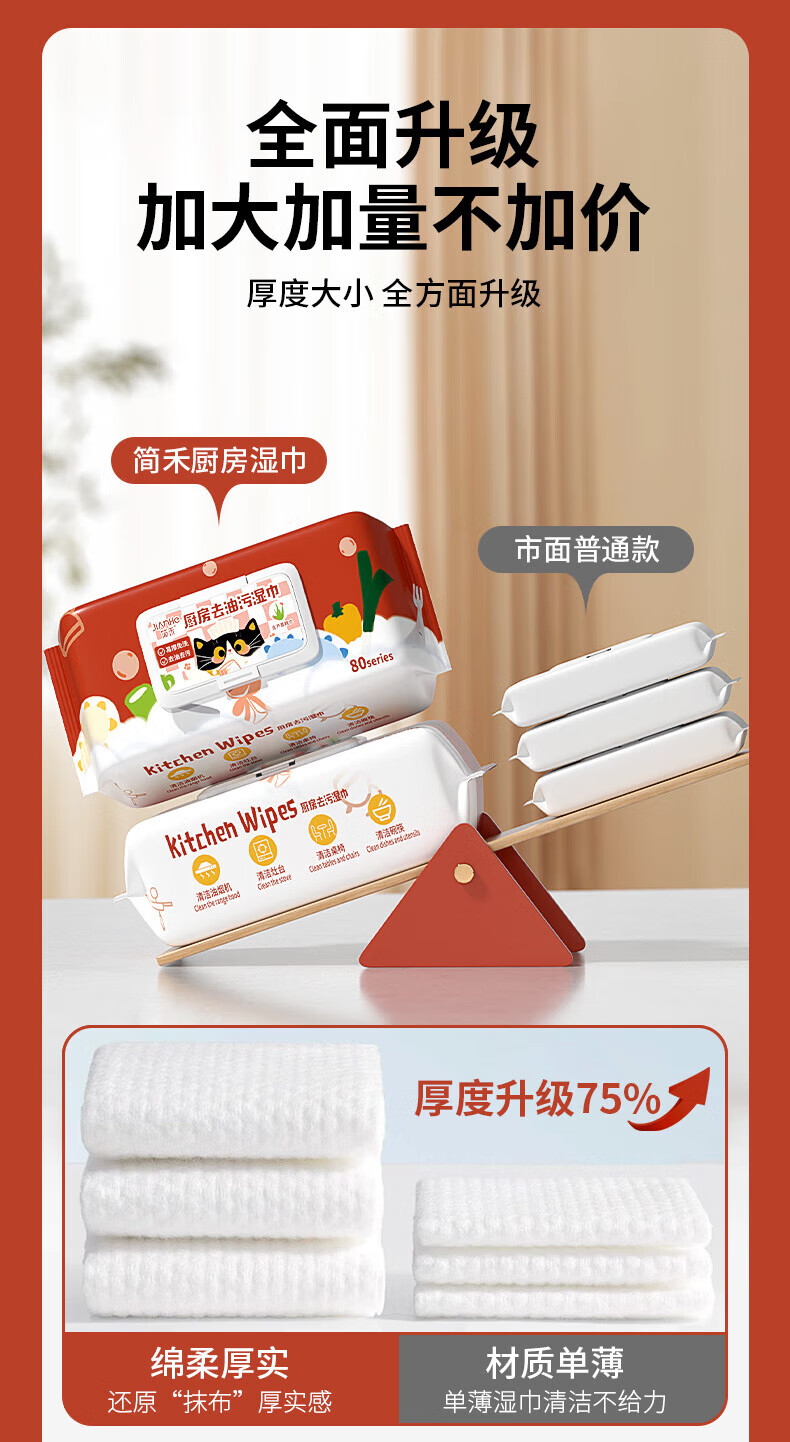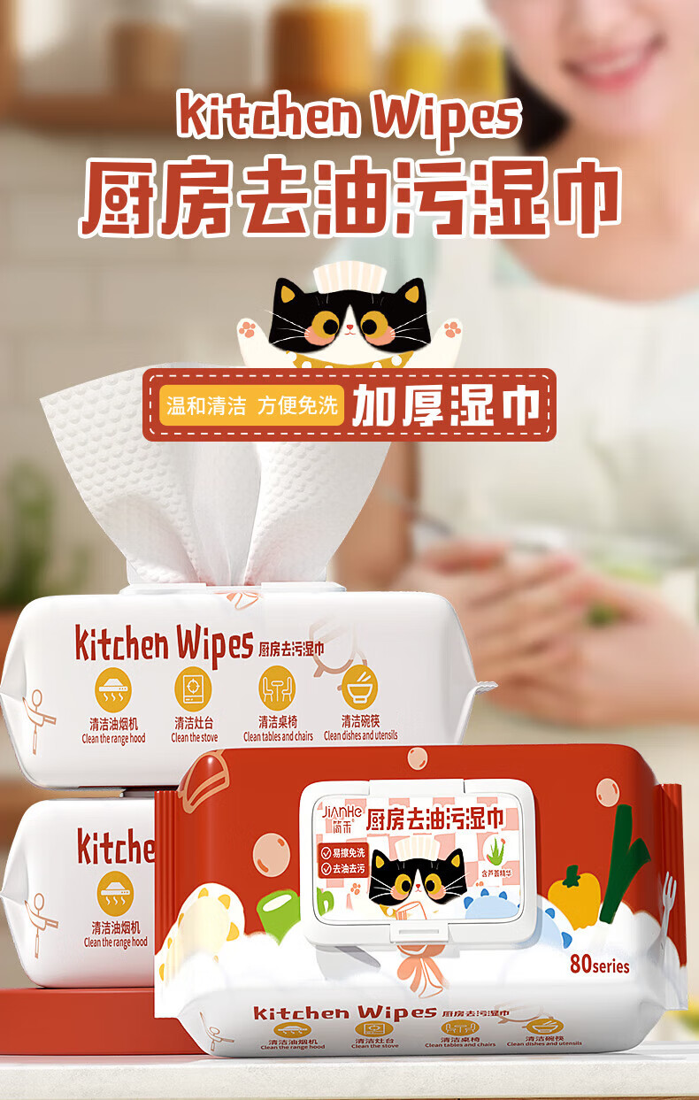 简禾厨房用湿纸巾去油污一次性洗碗布加大加厚可水洗懒人抹布80抽 【3大包240抽】20cm*18cm猫咪红