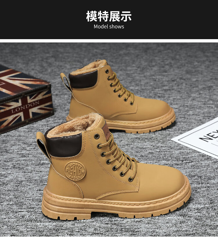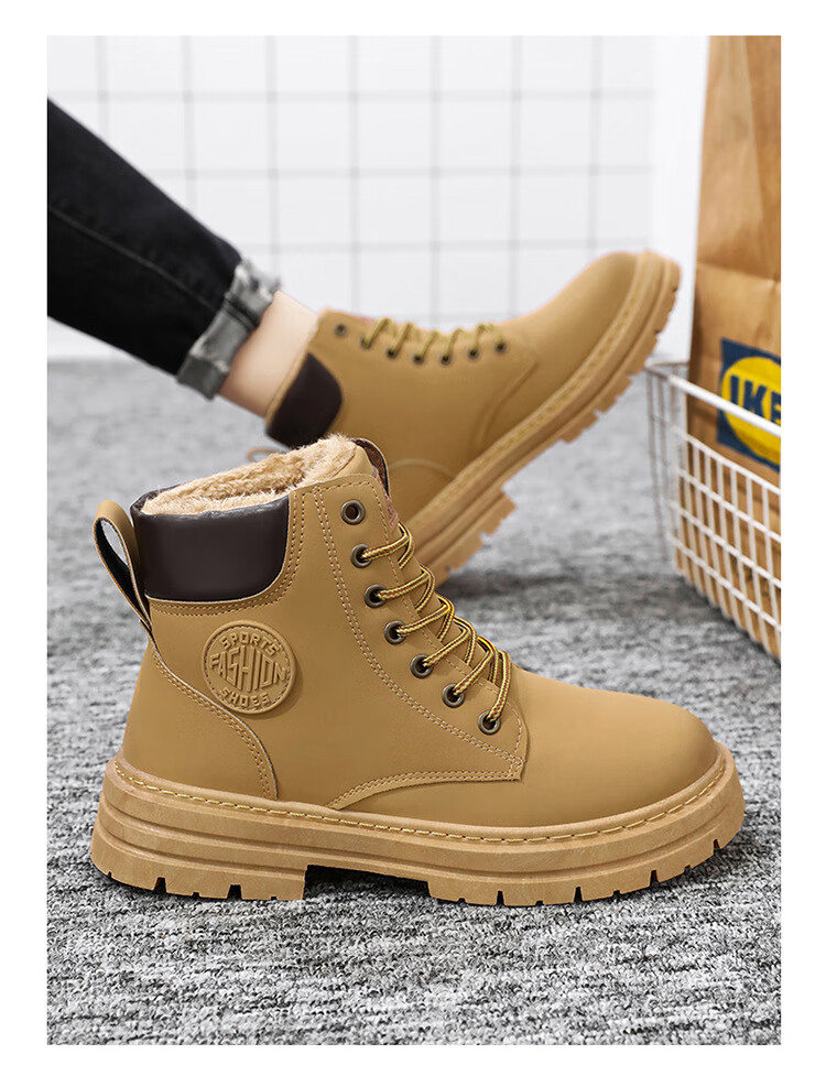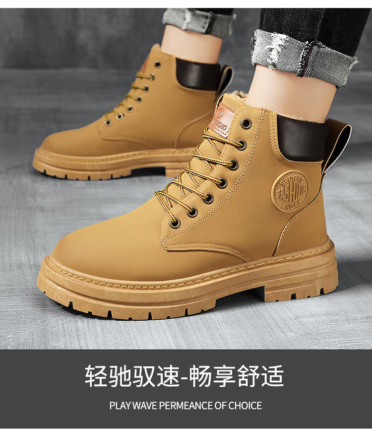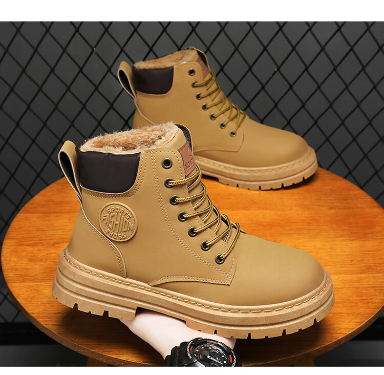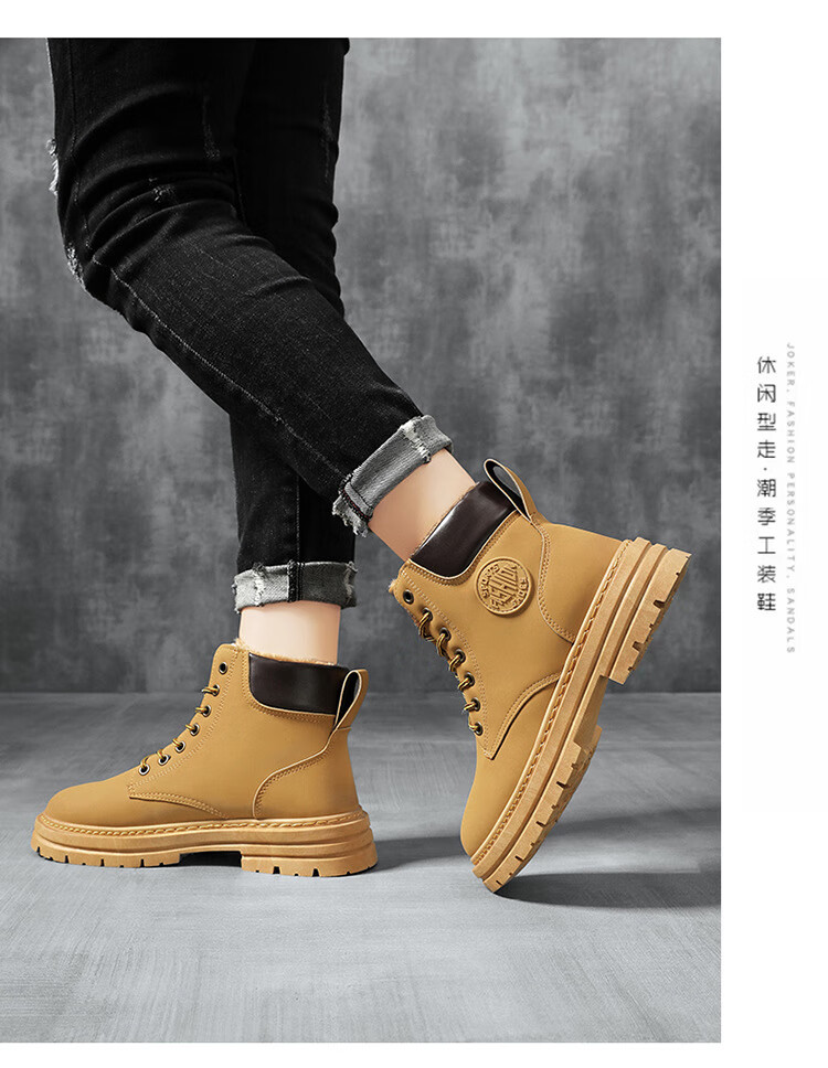 稻草人(MEXICAN)真皮牛皮冬季加绒马丁靴男士高帮工装鞋潮流百搭厚底加厚保暖棉鞋 黄色加绒【真牛皮 送运费险】 41