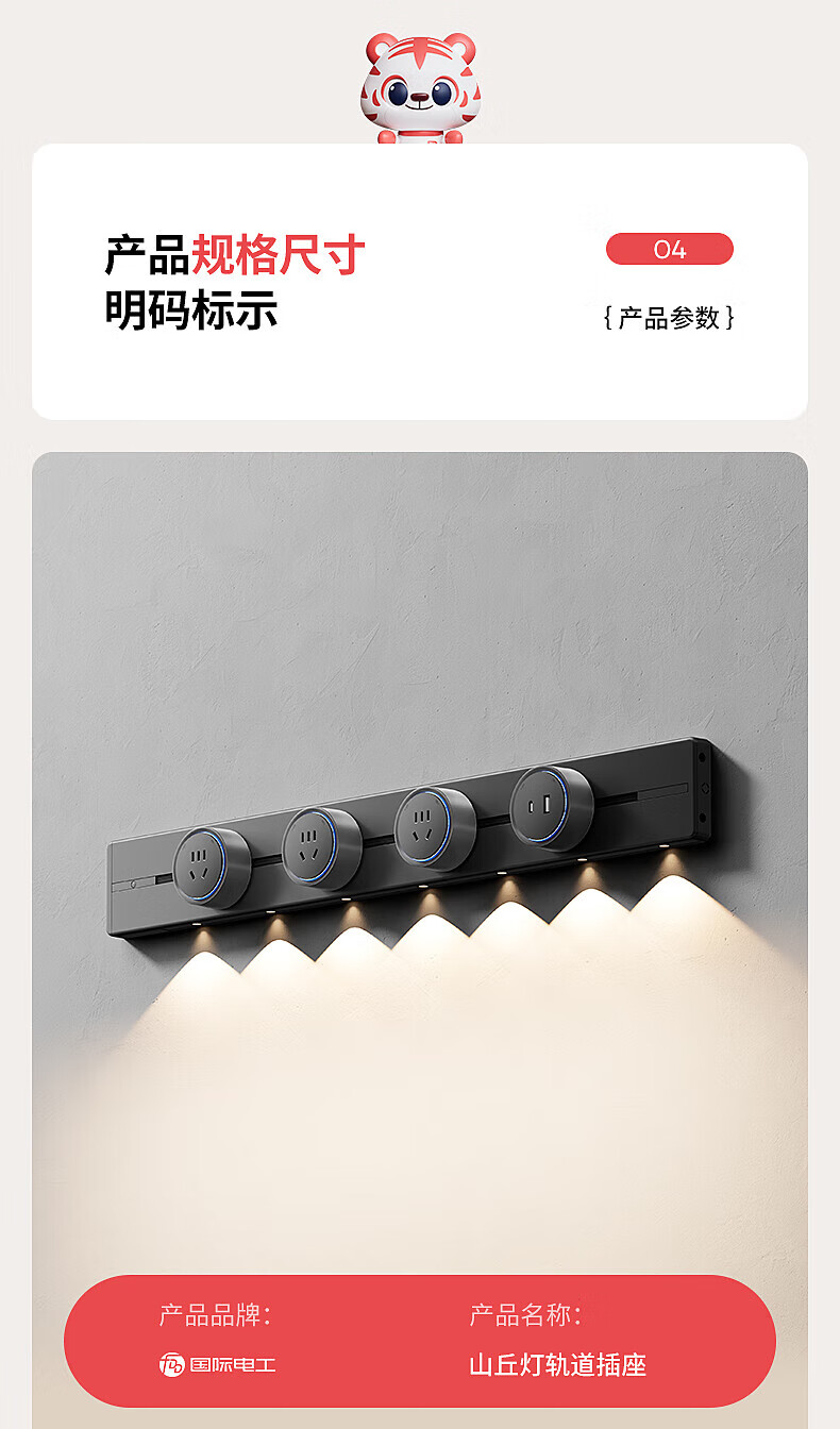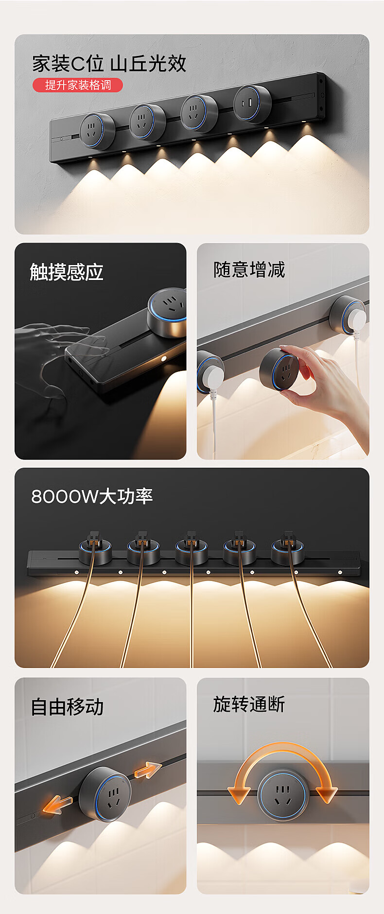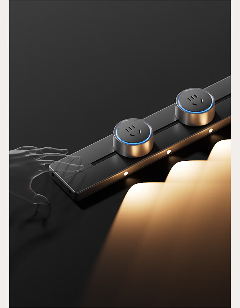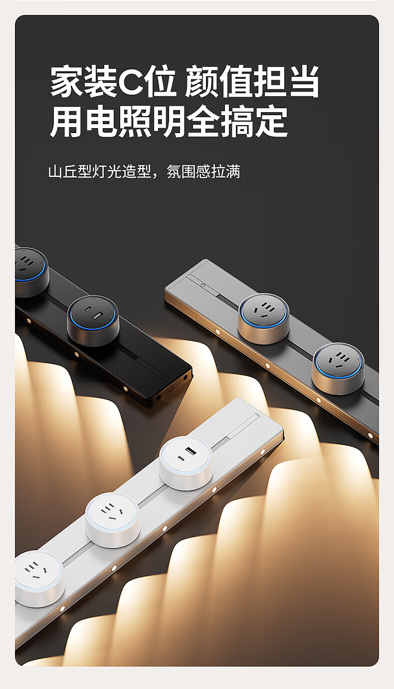 国际电工明装山丘感应灯轨道插座可移动壁挂式电力导轨玄关餐边柜滑动电源 黑色(感应+山丘灯)50cm+3个五孔