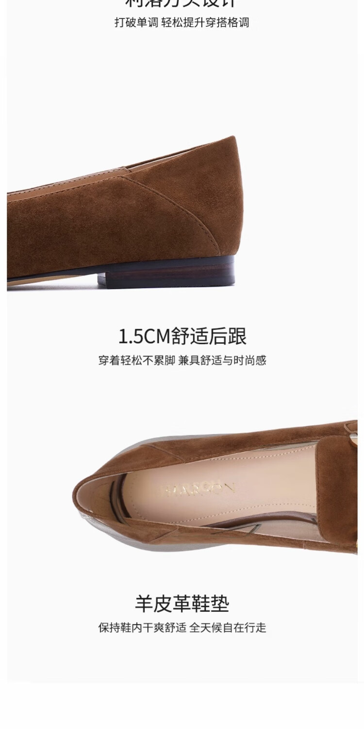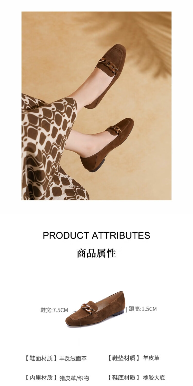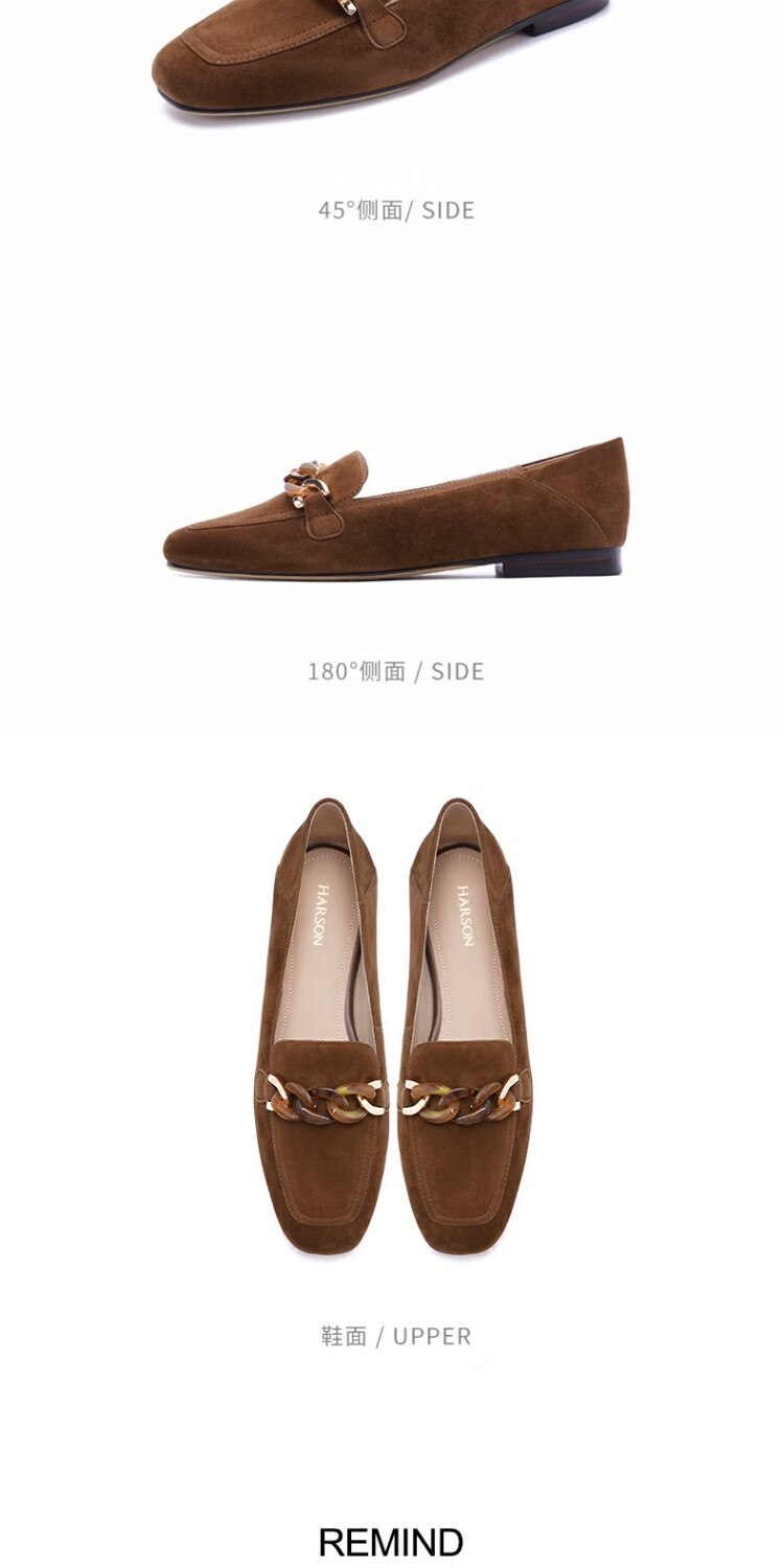 哈森时尚低跟棕色乐福鞋通勤上班方头豆豆鞋2025秋季新品HL257126 深棕色 羊反绒面革 34