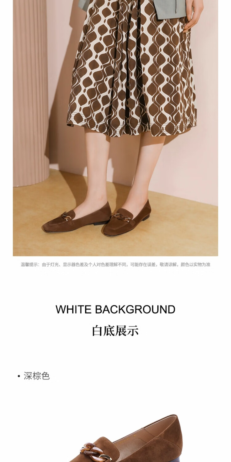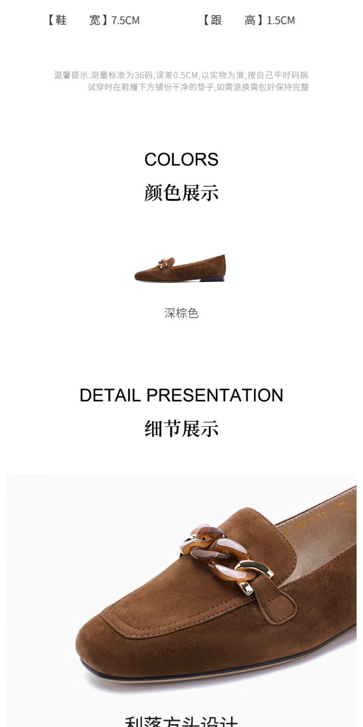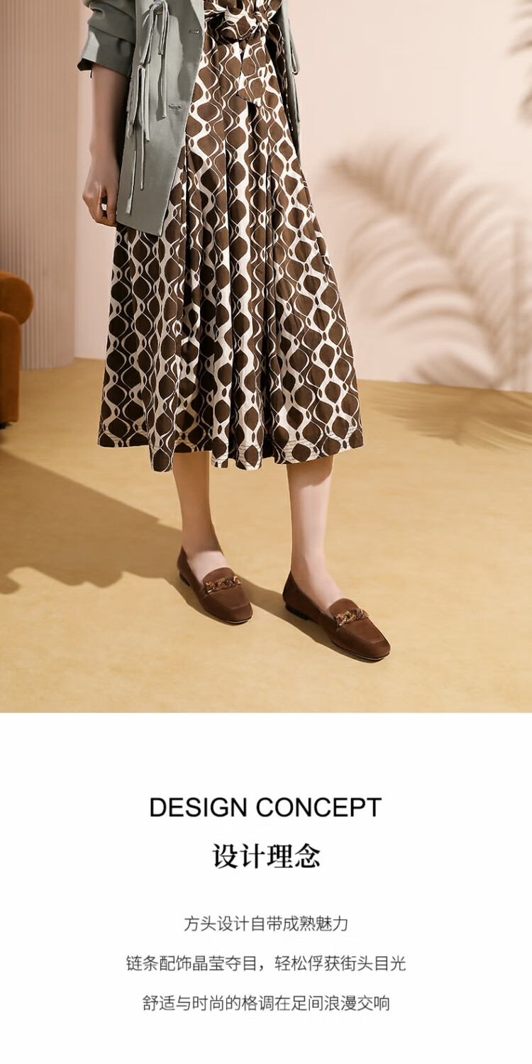 哈森时尚低跟棕色乐福鞋通勤上班方头豆豆鞋2025秋季新品HL257126 深棕色 羊反绒面革 34