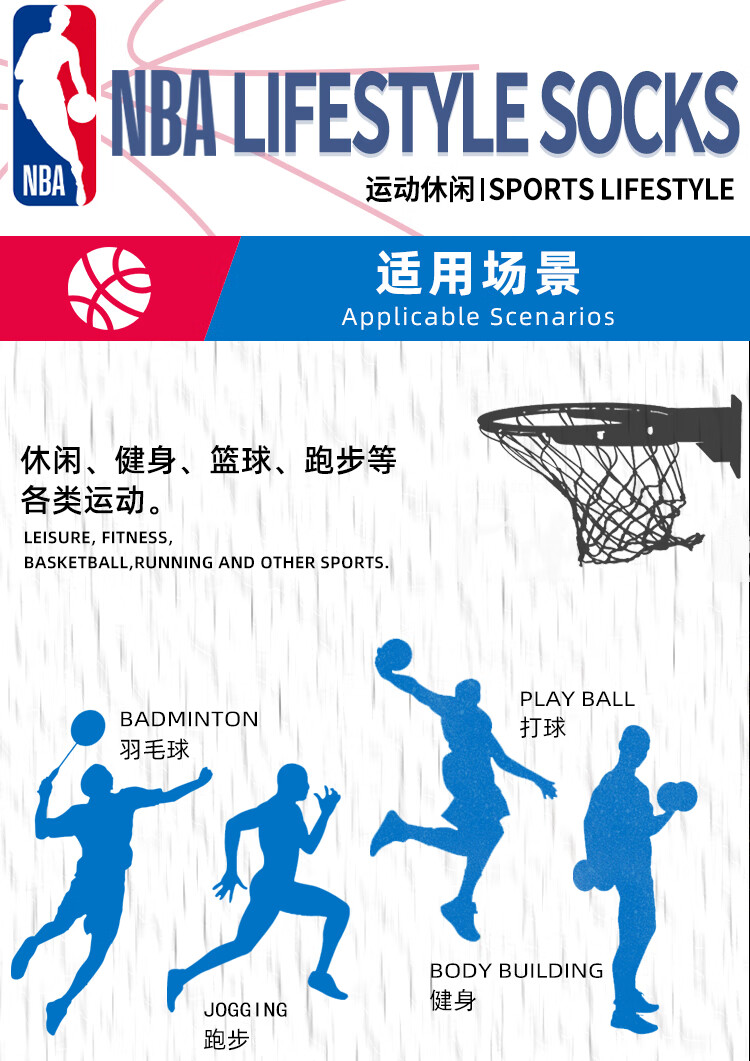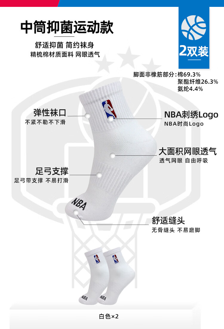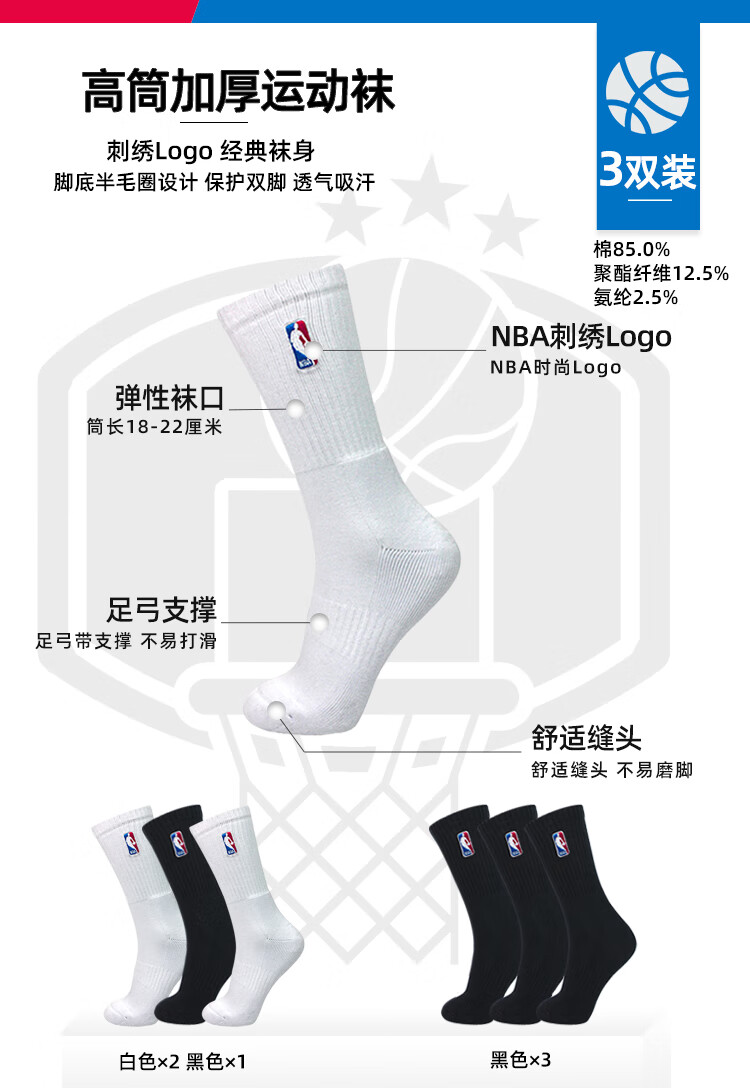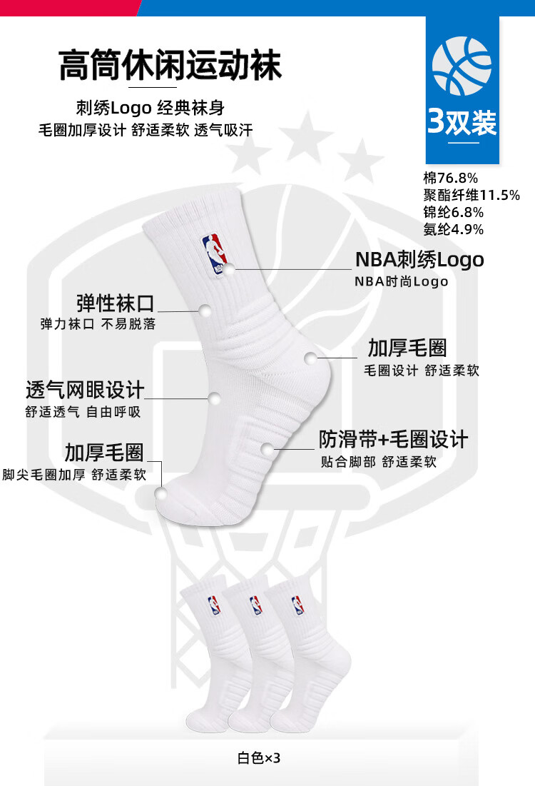 NBA袜子男士秋冬运动袜抗菌防臭消臭吸汗无骨棉袜跑步中筒篮球袜3双