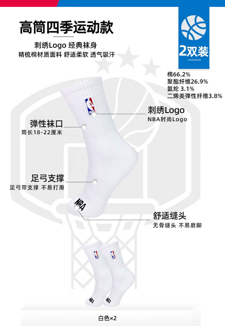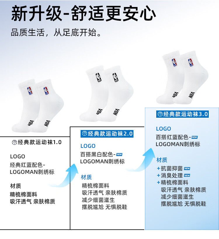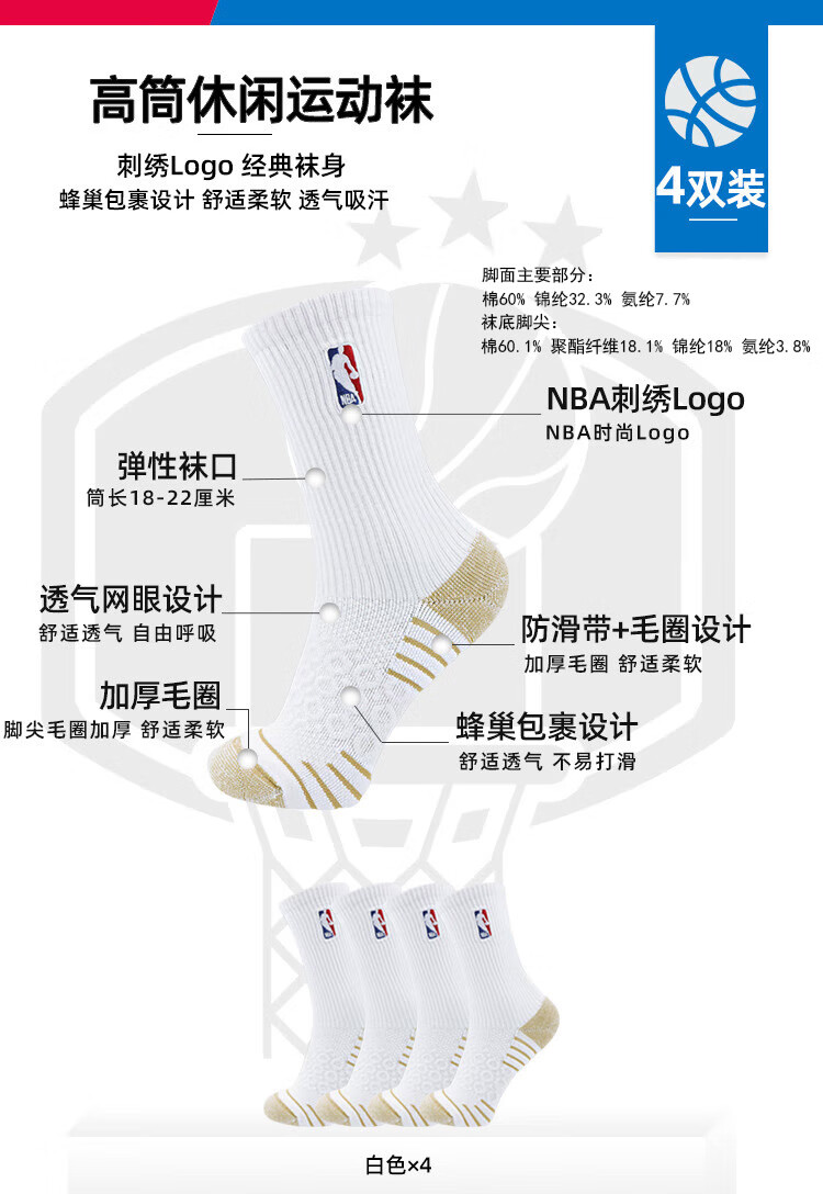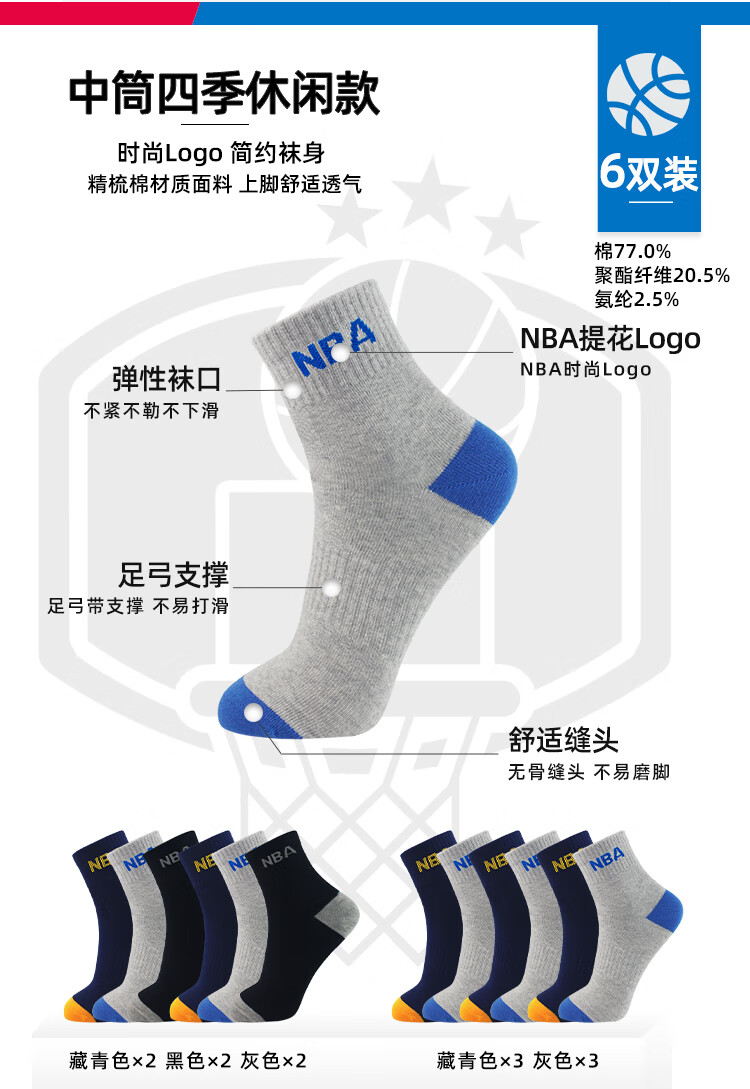 NBA袜子男士秋冬运动袜抗菌防臭消臭吸汗无骨棉袜跑步中筒篮球袜3双