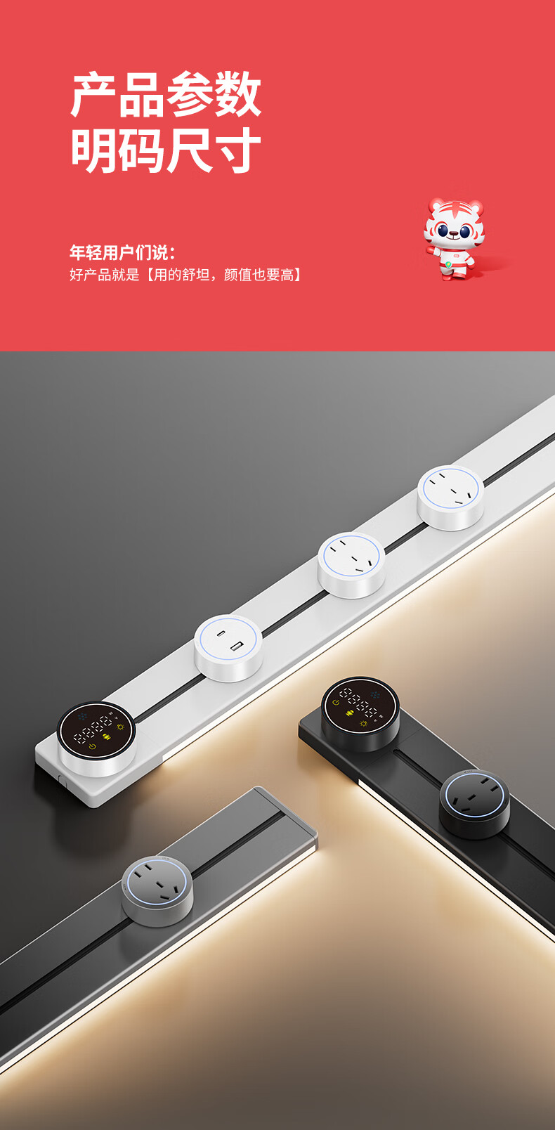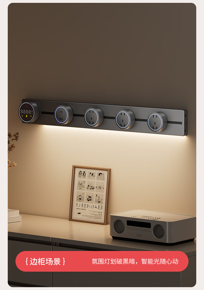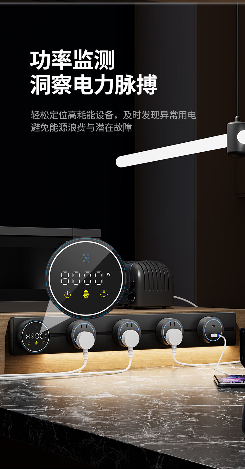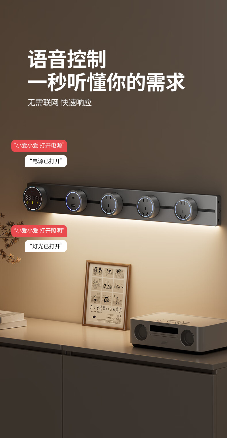 国际电工智能语音数显屏轨道插座带触摸感应灯可移动滑轨家用明装电力导轨 极夜黑 40厘米数显语音款导轨+2个大五孔