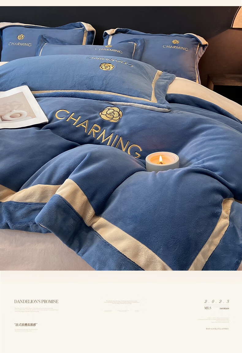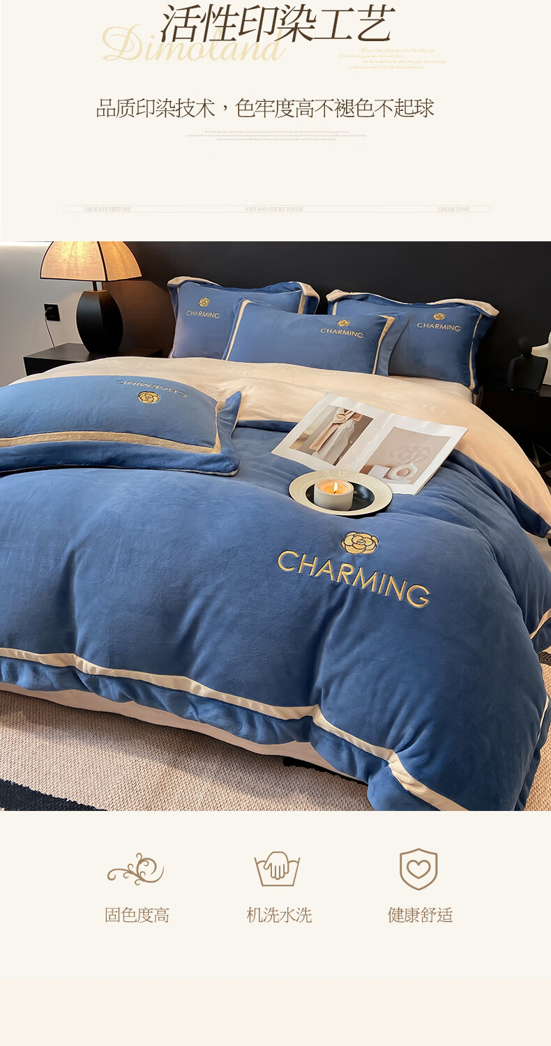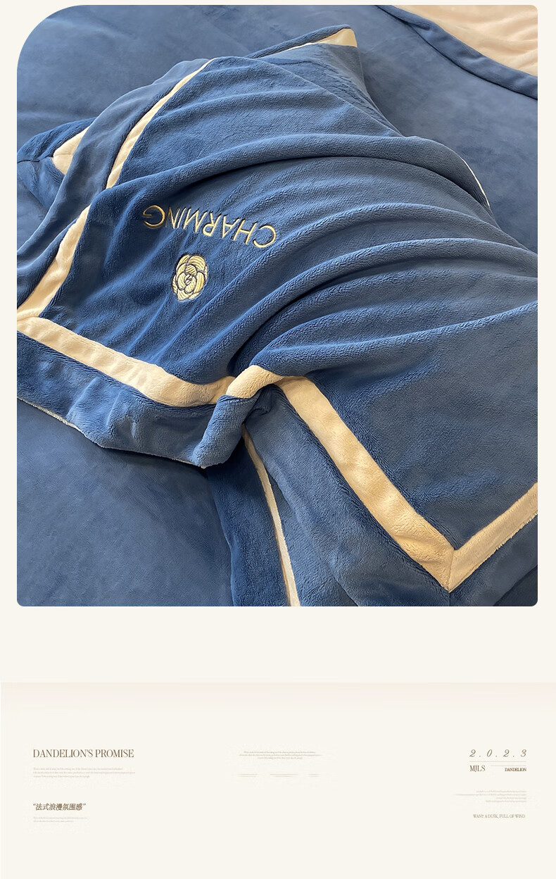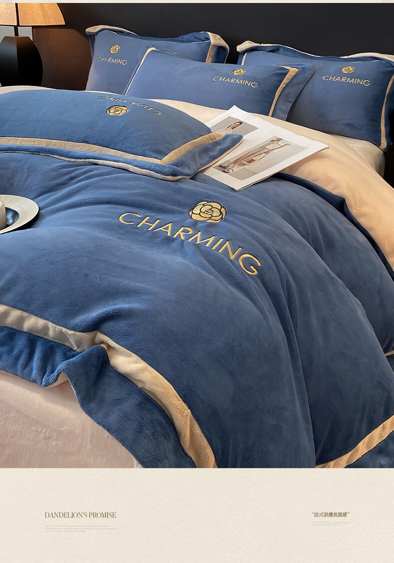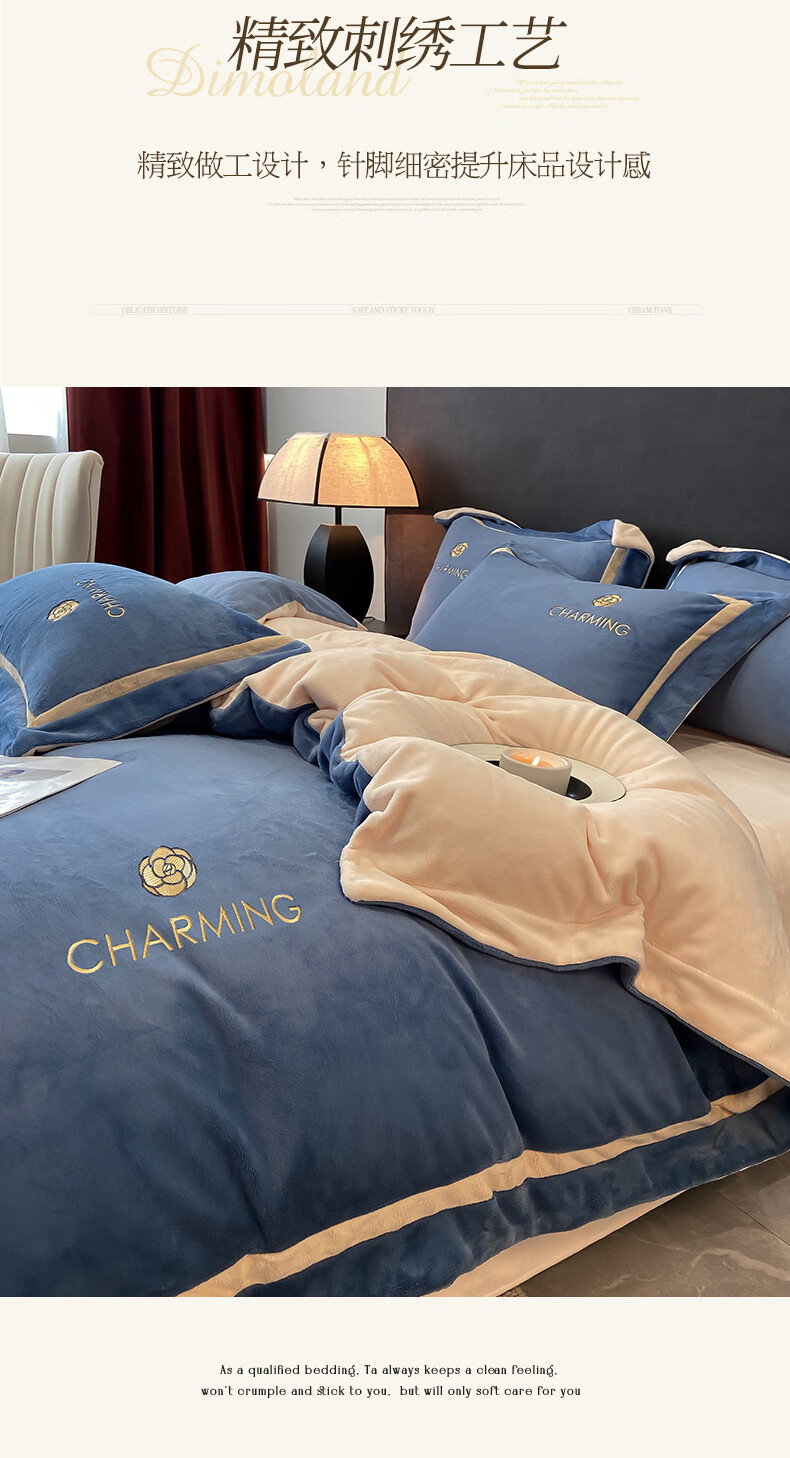 VJE高克重牛奶绒四件套冬季加厚保暖床单被套轻奢双面绒床上用品 查伦-宝石蓝+香槟色 三件套1.2m 床单款 -被套150*200cm