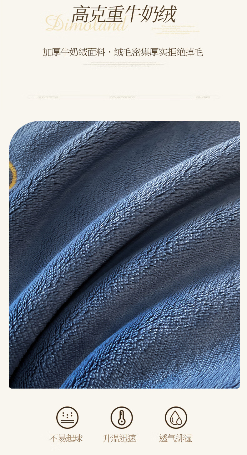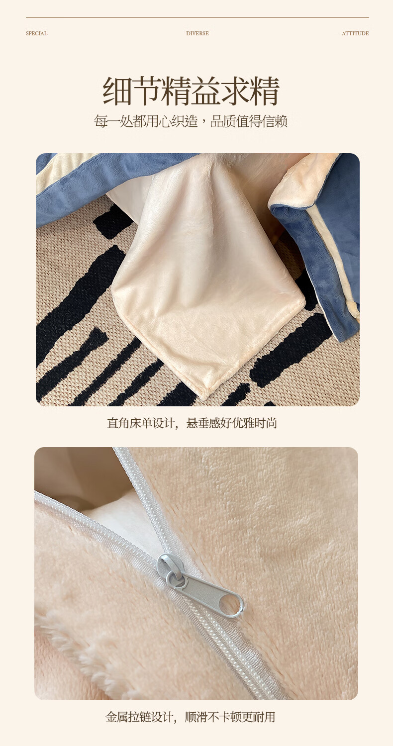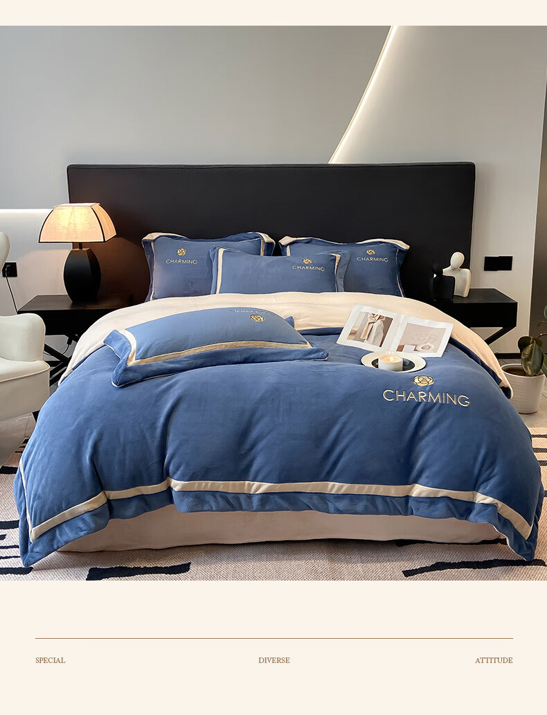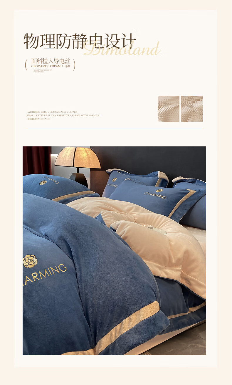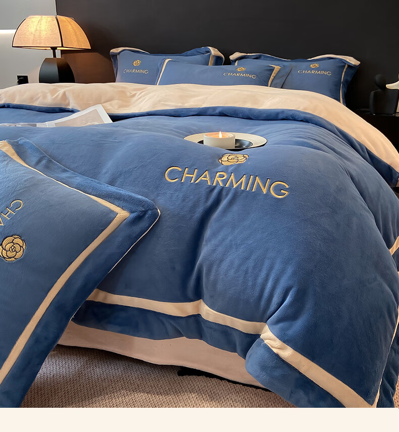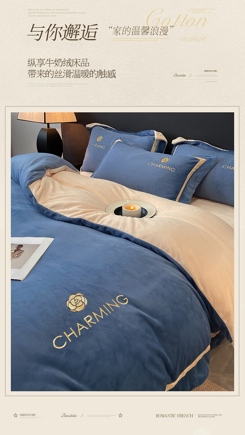 VJE高克重牛奶绒四件套冬季加厚保暖床单被套轻奢双面绒床上用品 查伦-宝石蓝+香槟色 三件套1.2m 床单款 -被套150*200cm