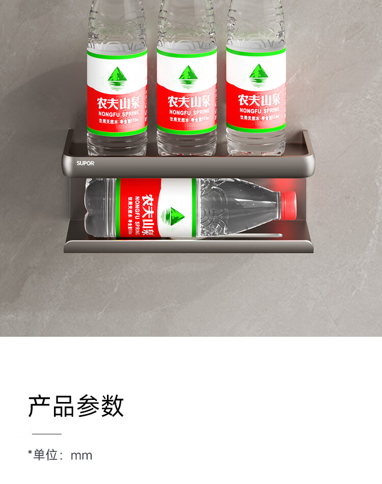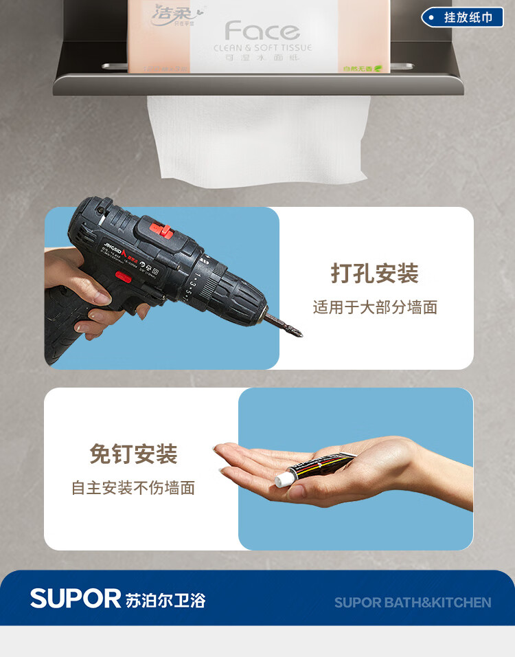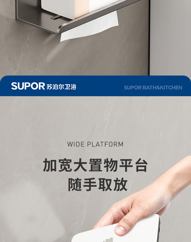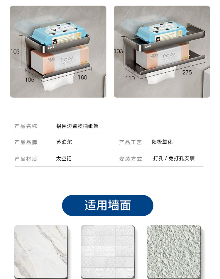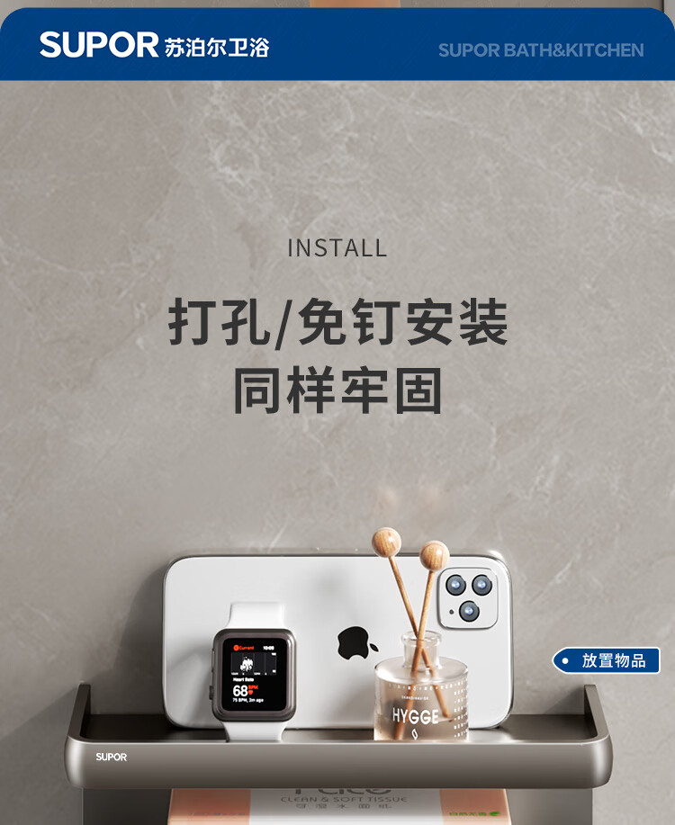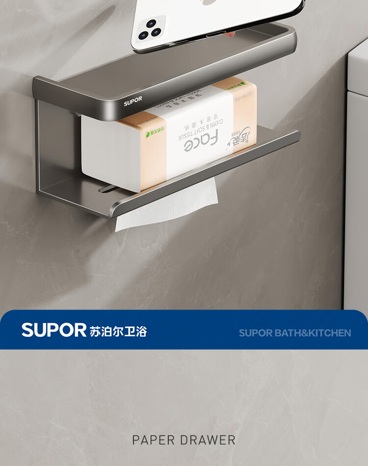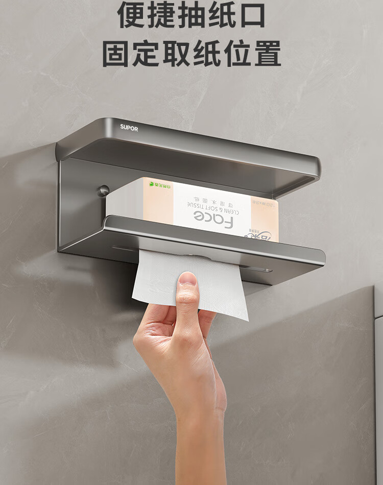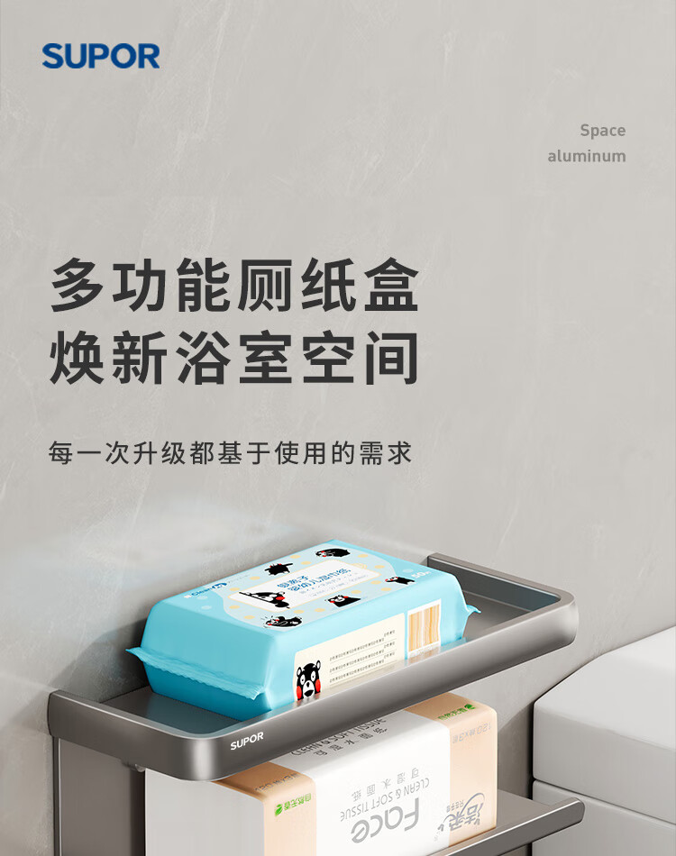 苏泊尔浴室墙上置物架卫生间毛巾挂架免打孔壁挂卫浴厕所浴巾架挂件套装 枪灰|太空铝|围边置物抽纸架
