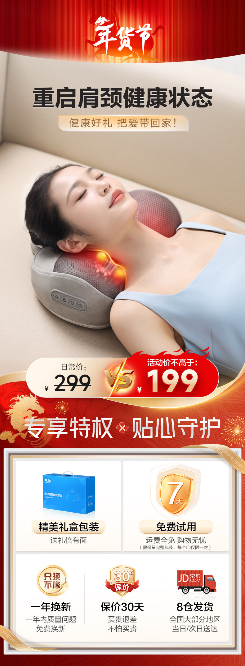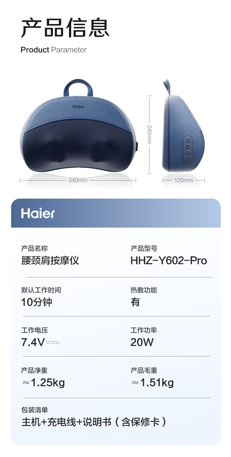 海尔(Haier)颈椎按摩器腰部按摩仪按摩枕头颈部肩颈背部按摩靠垫腿足底全身生日情人节礼物女友HHZ-Y602Z-Pro