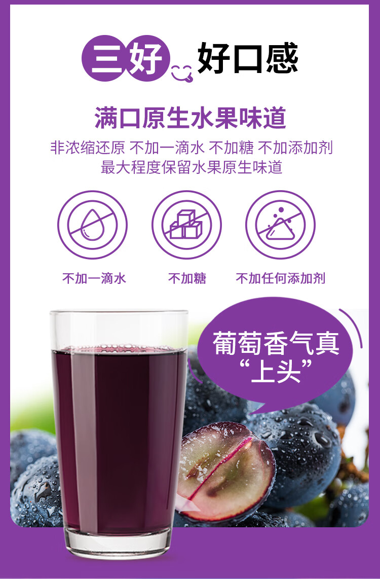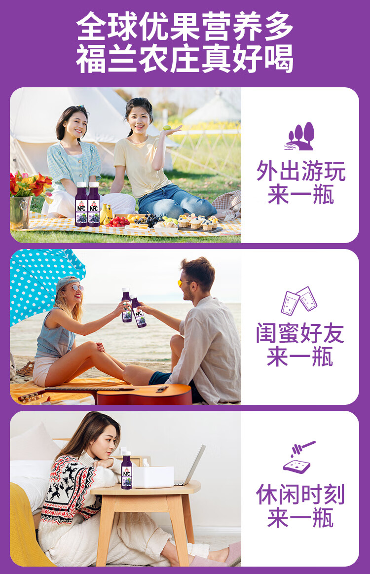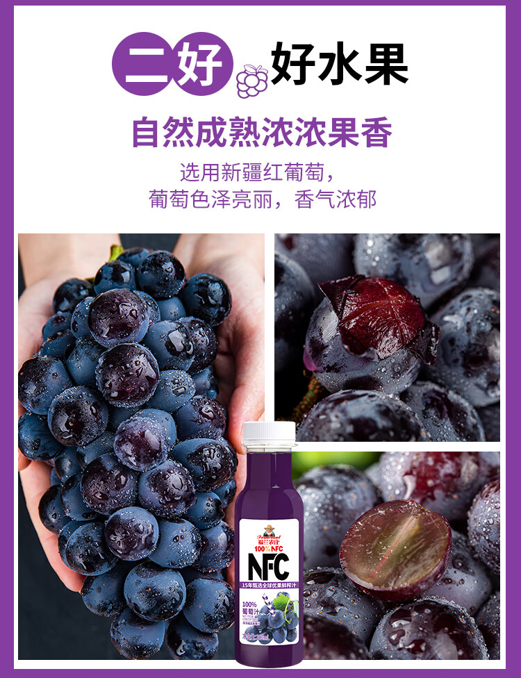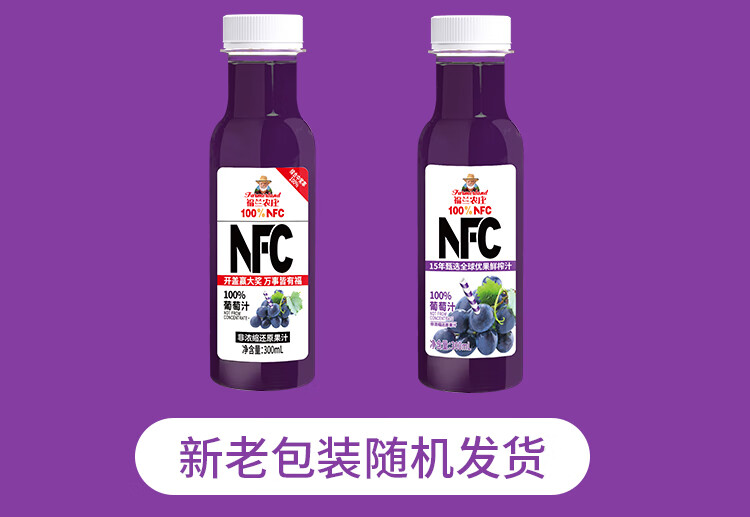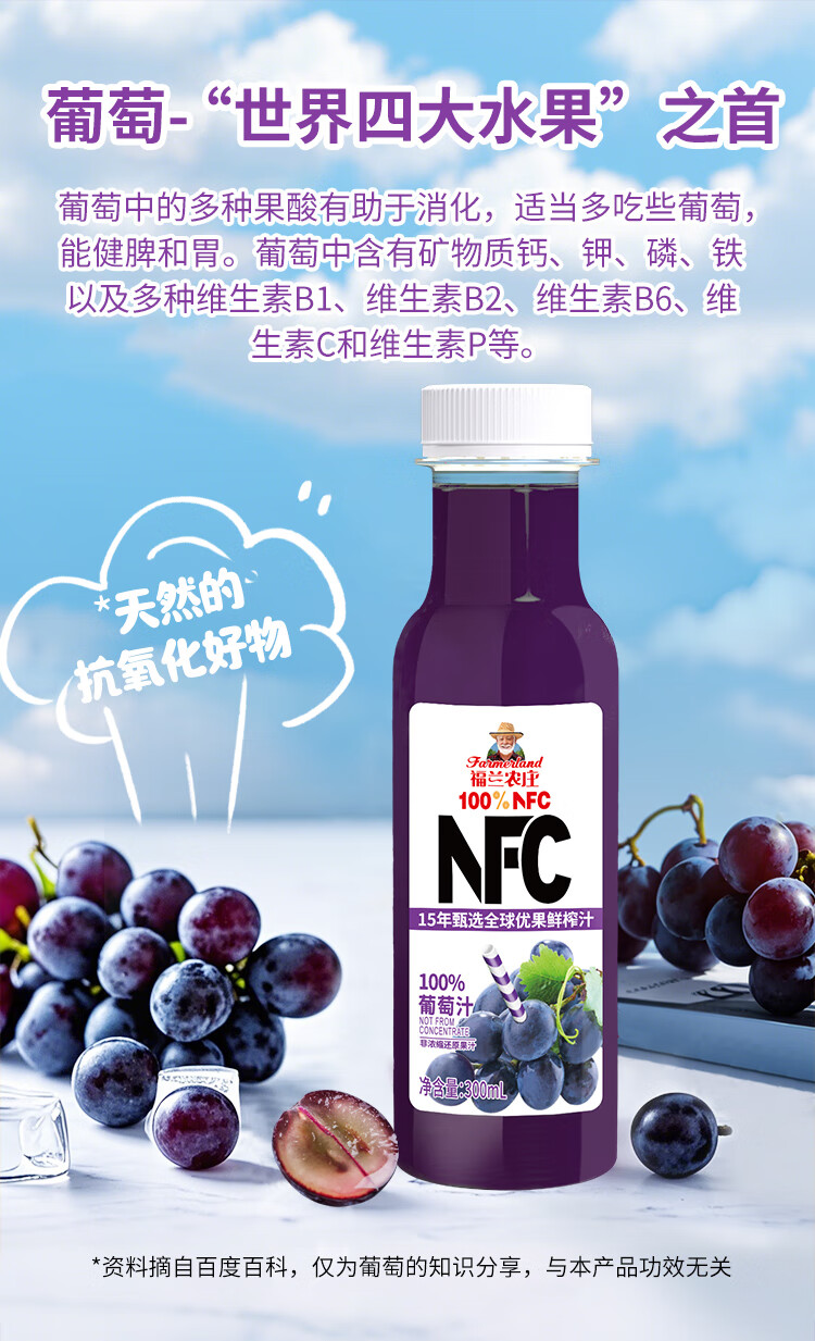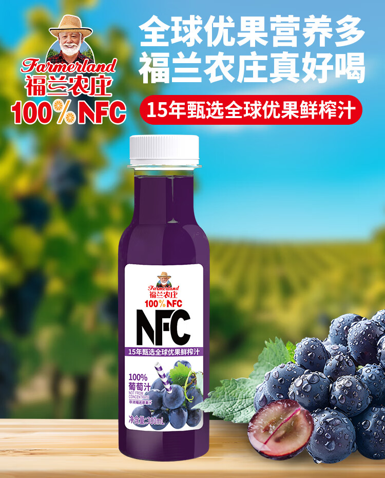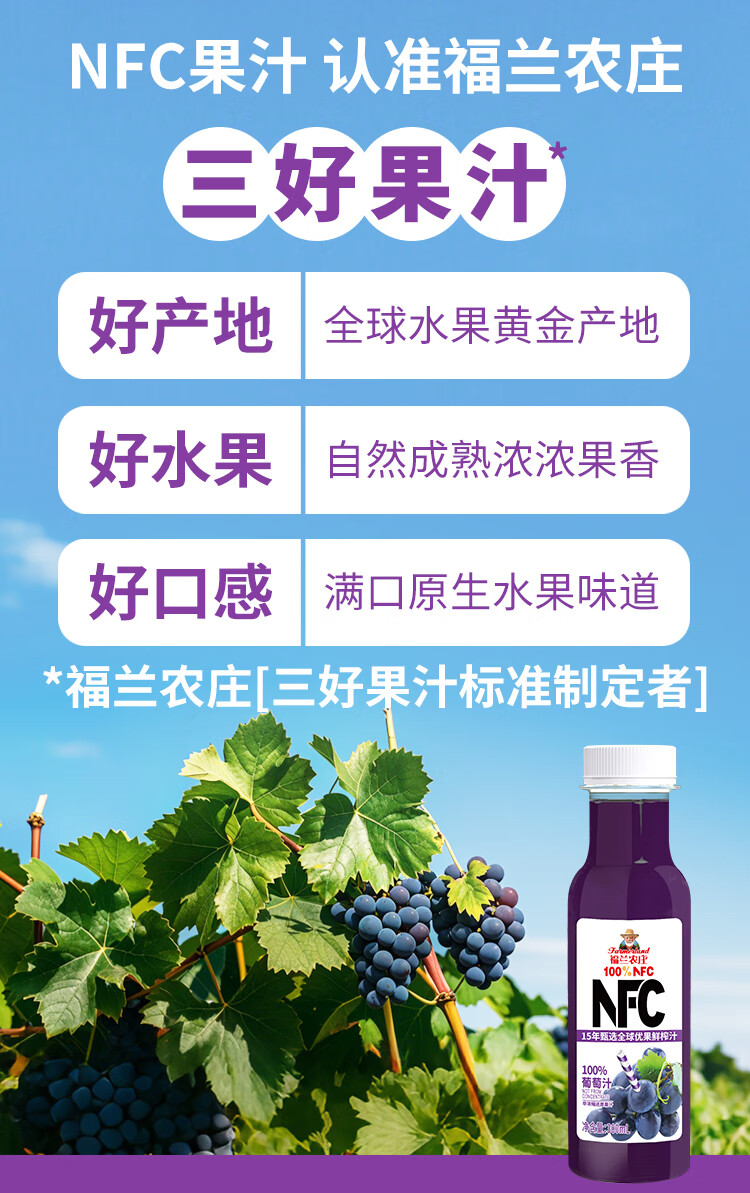 福兰农庄100%NFC鲜榨果汁配料表干净0脂肪饮料 NFC葡萄汁300ml*10瓶礼盒装