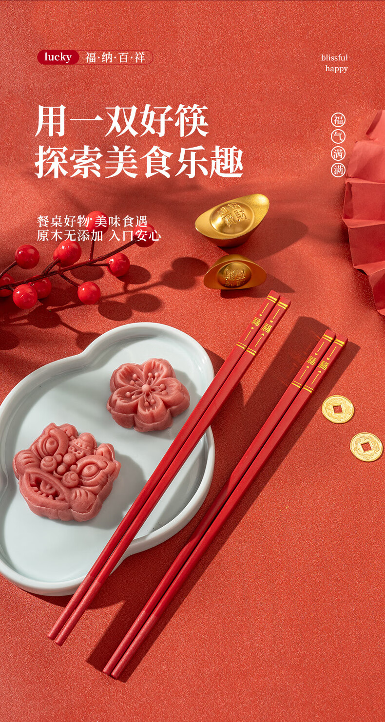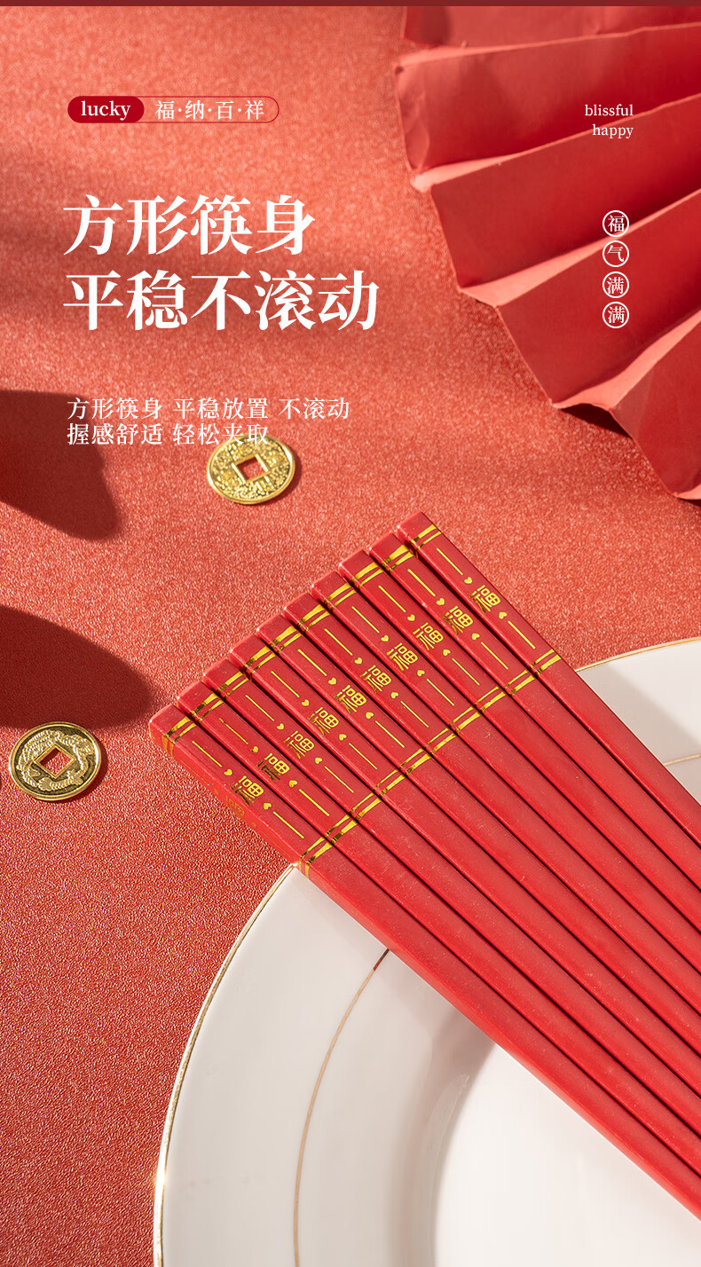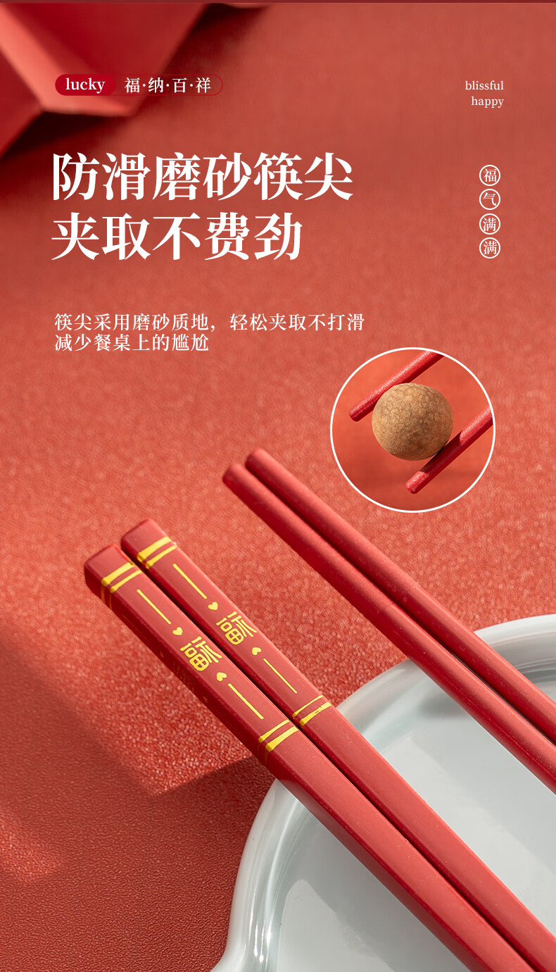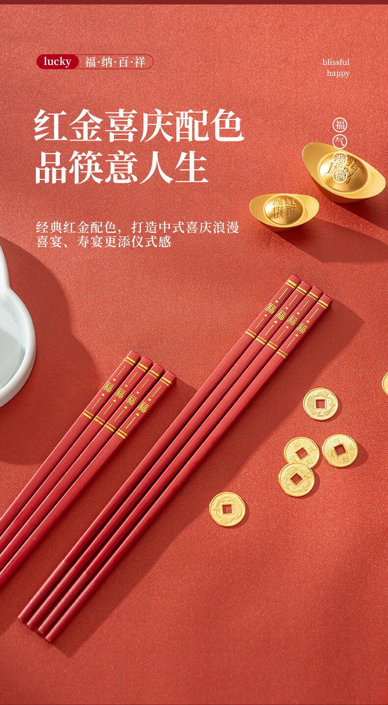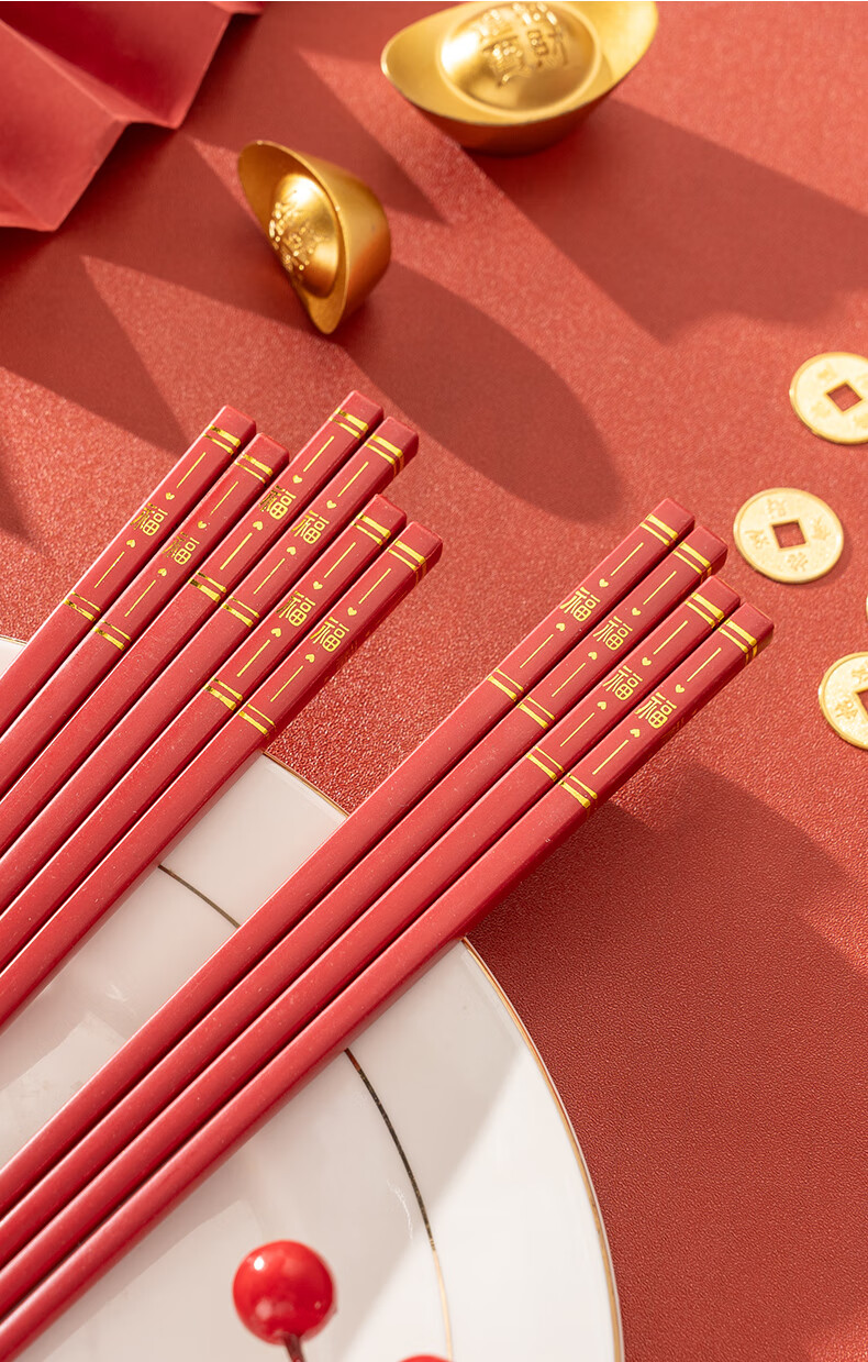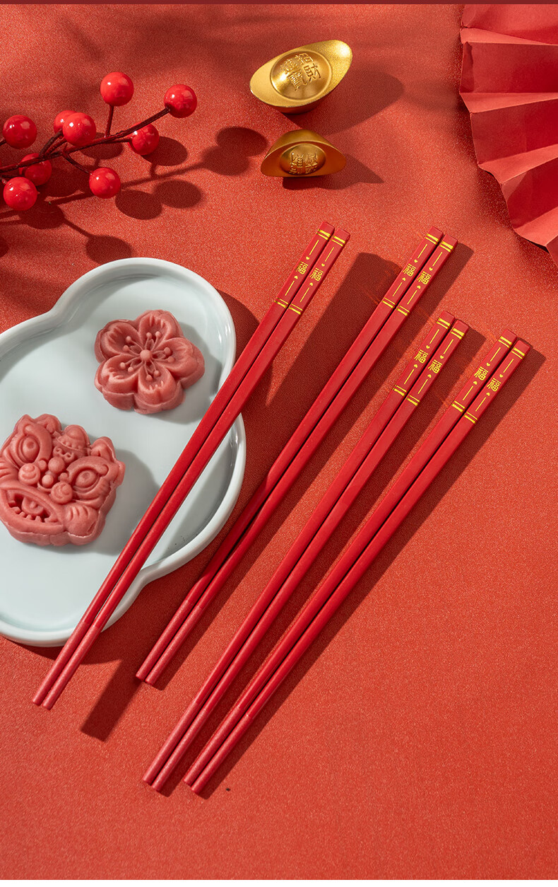 广意中式筷子家用红色过年防霉耐高温家庭装婚庆结婚喜庆筷 新年福运筷子- 10双