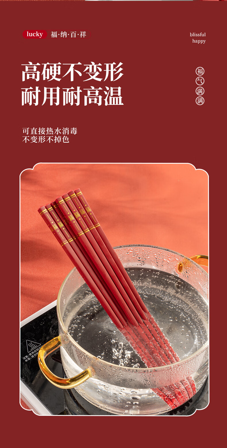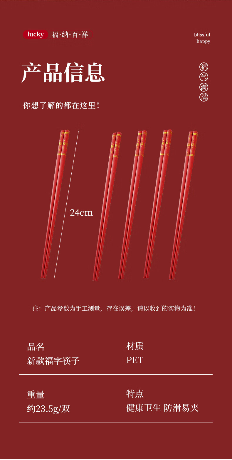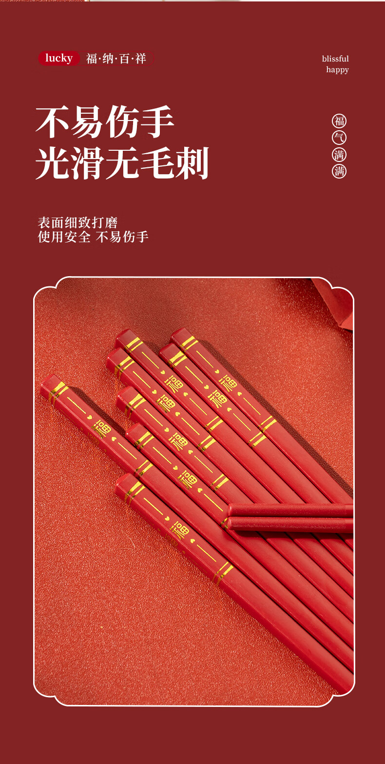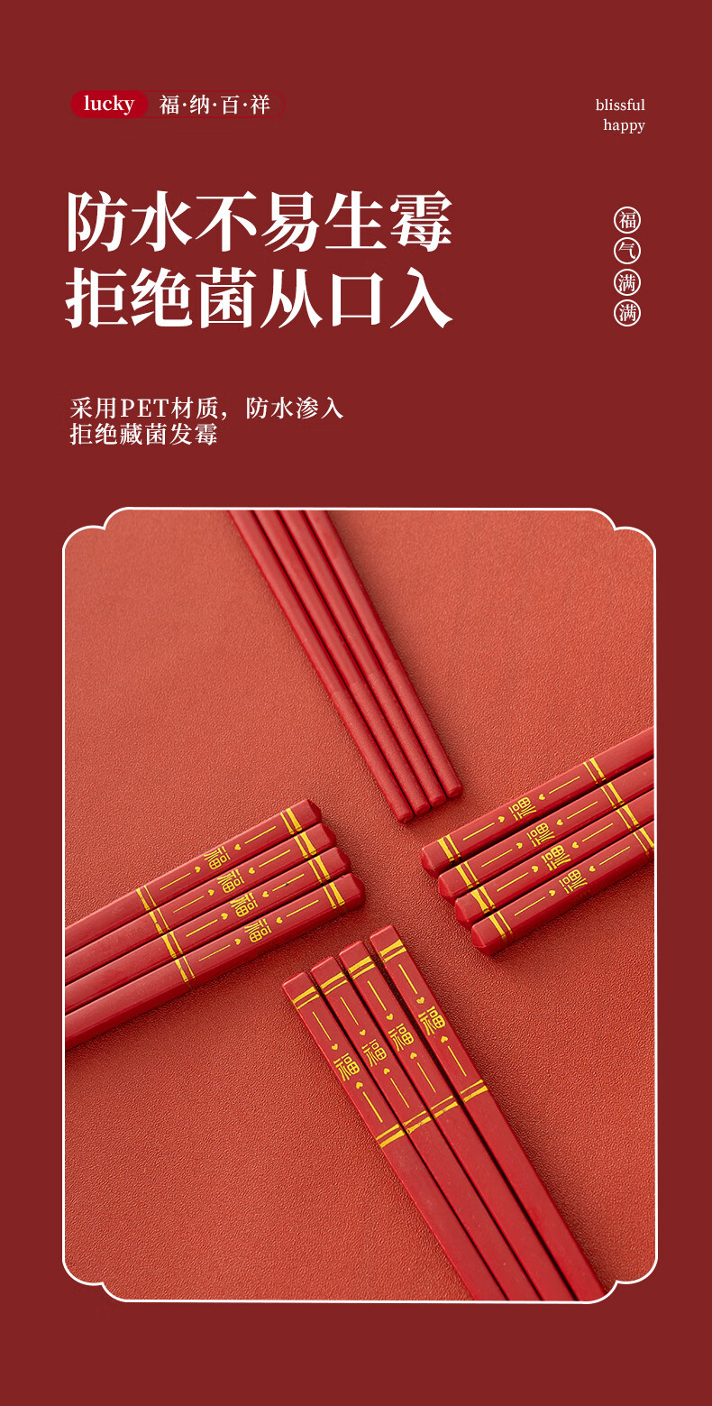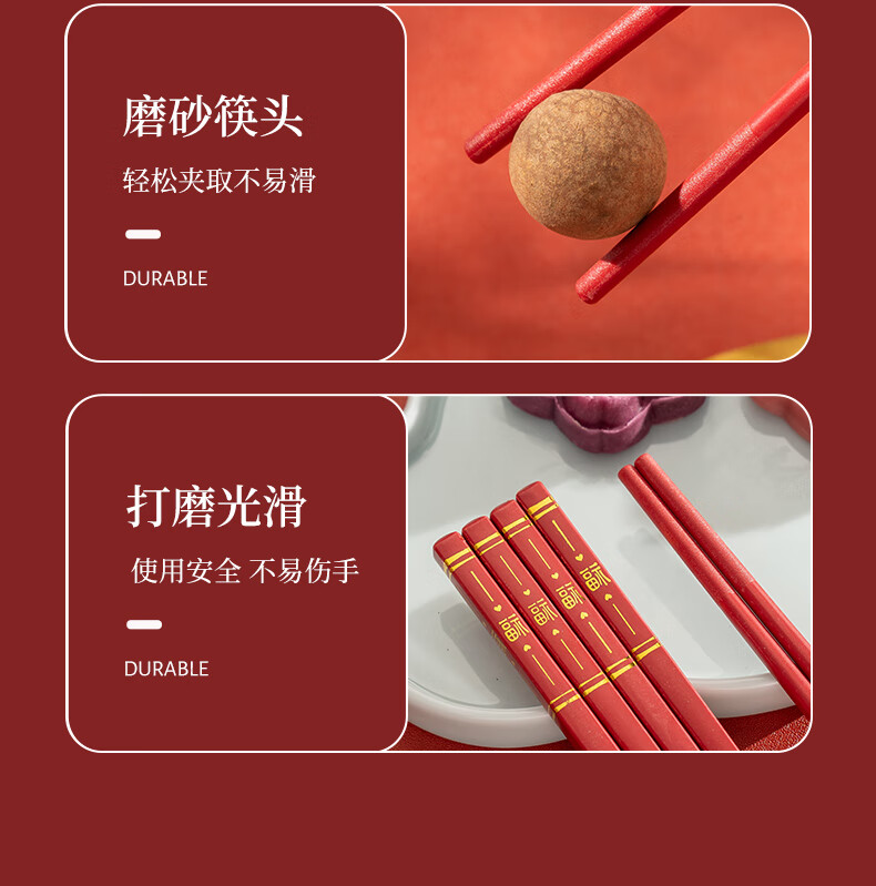 广意中式筷子家用红色过年防霉耐高温家庭装婚庆结婚喜庆筷 新年福运筷子- 10双
