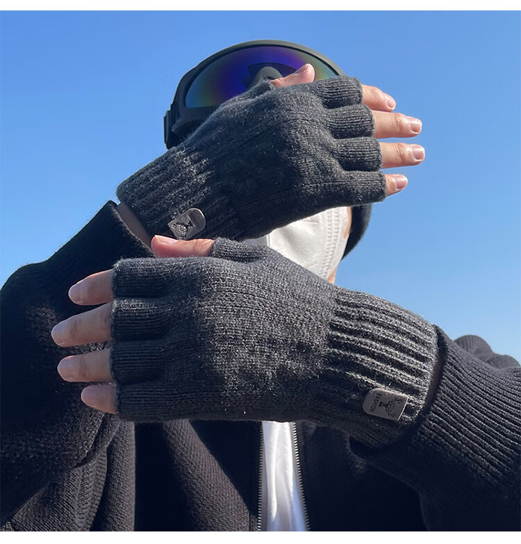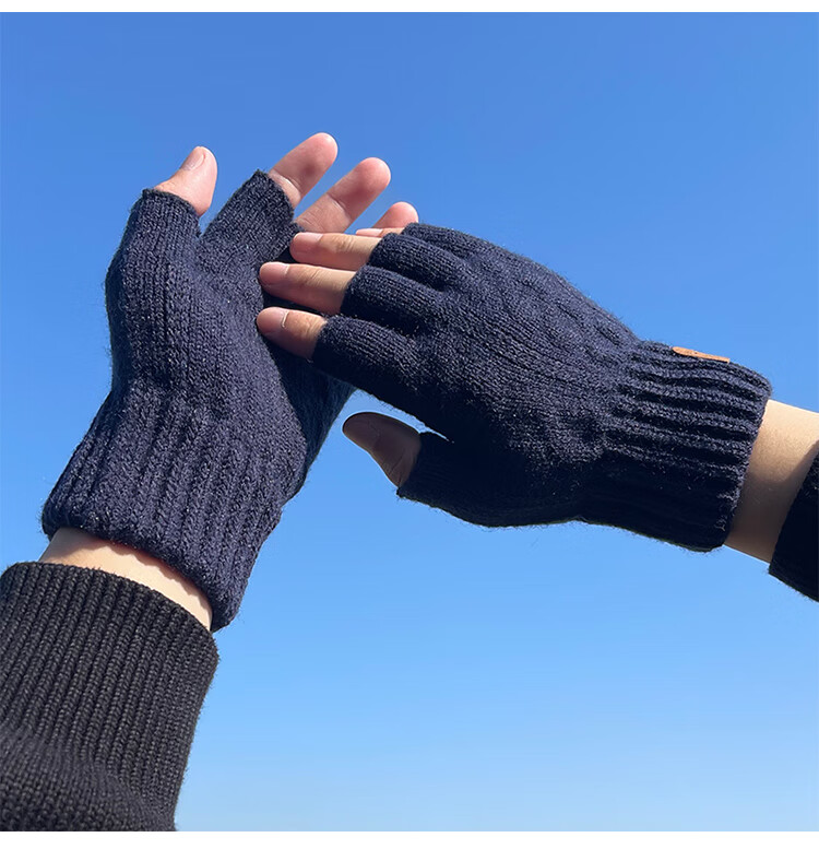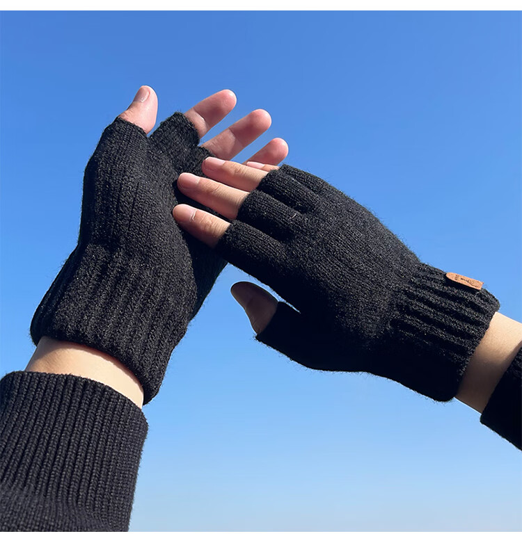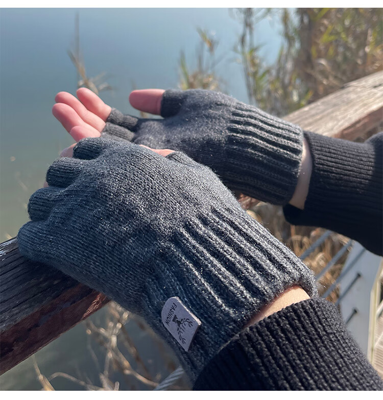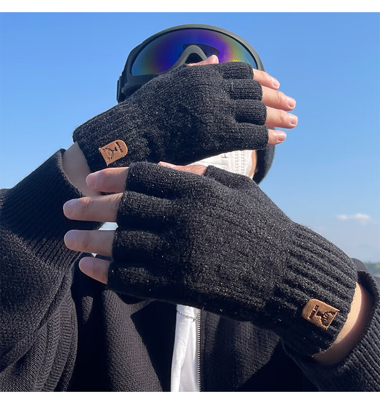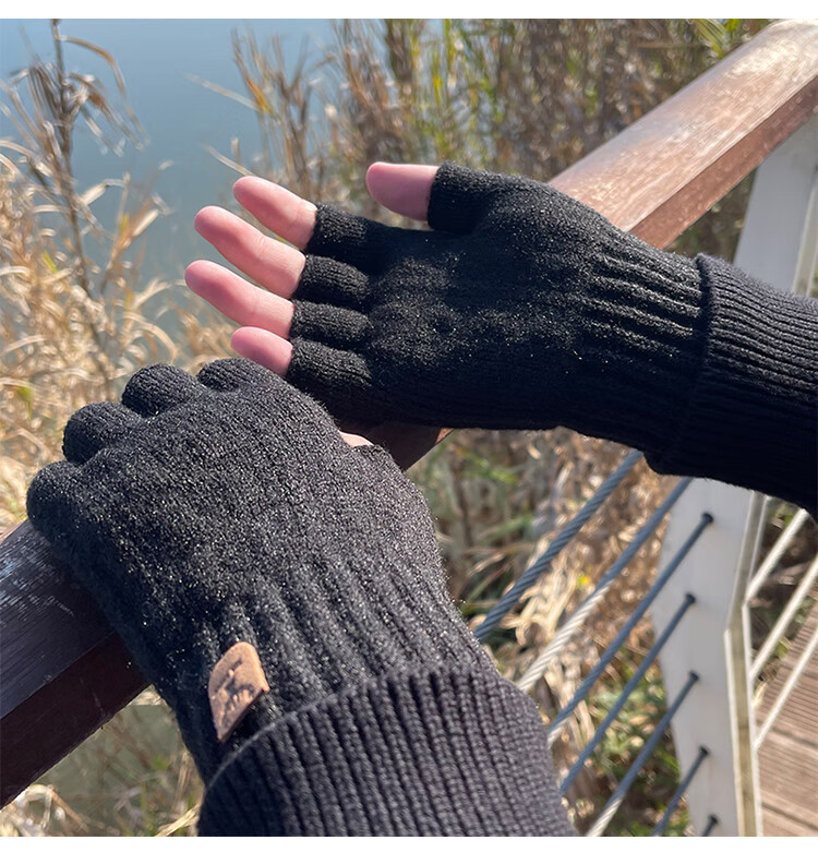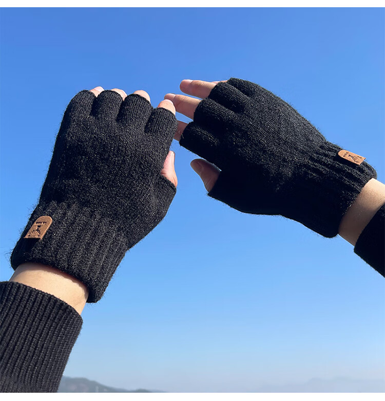 半指手套男露指冬季半截无指骑行开车毛线针织漏指头防寒保暖 黑色-鹿角贴标半指 无规格