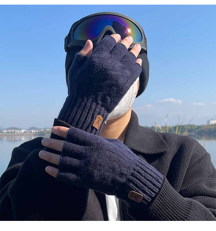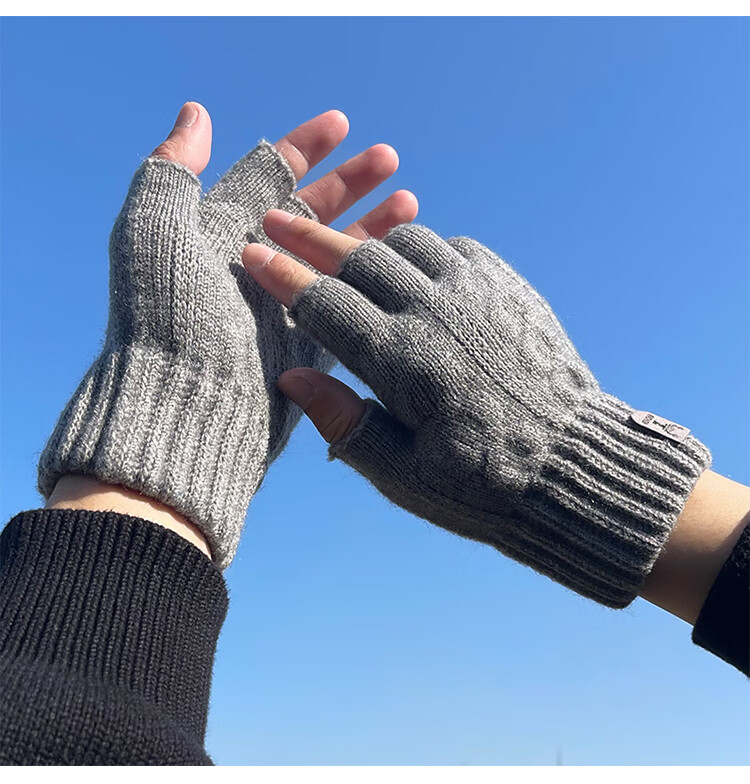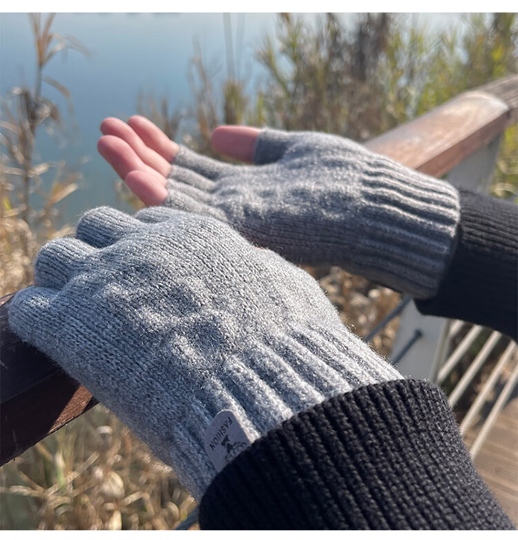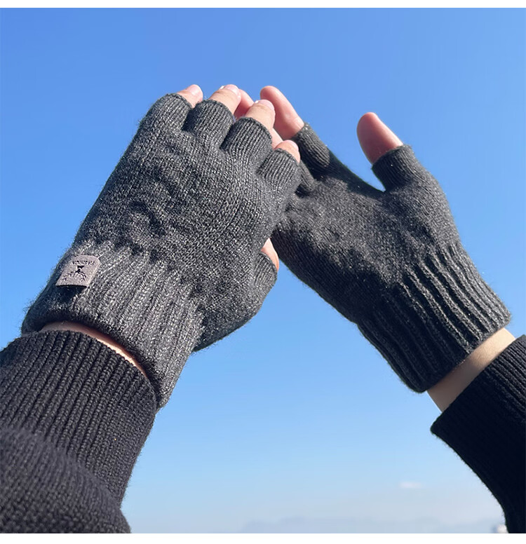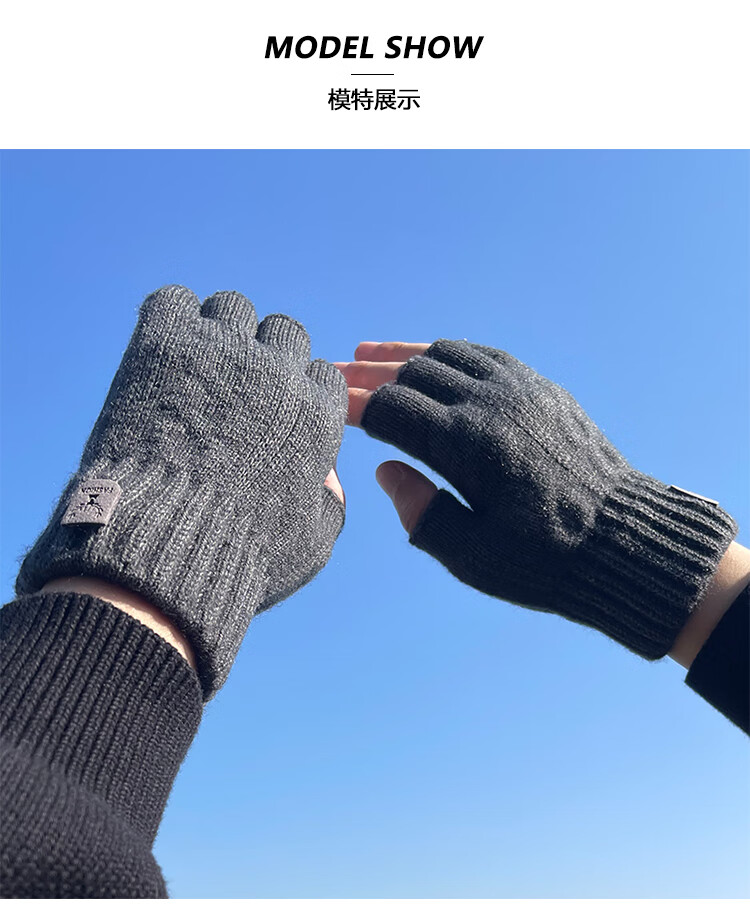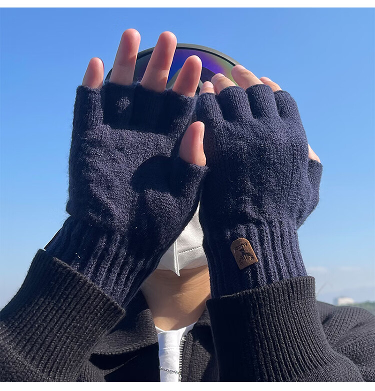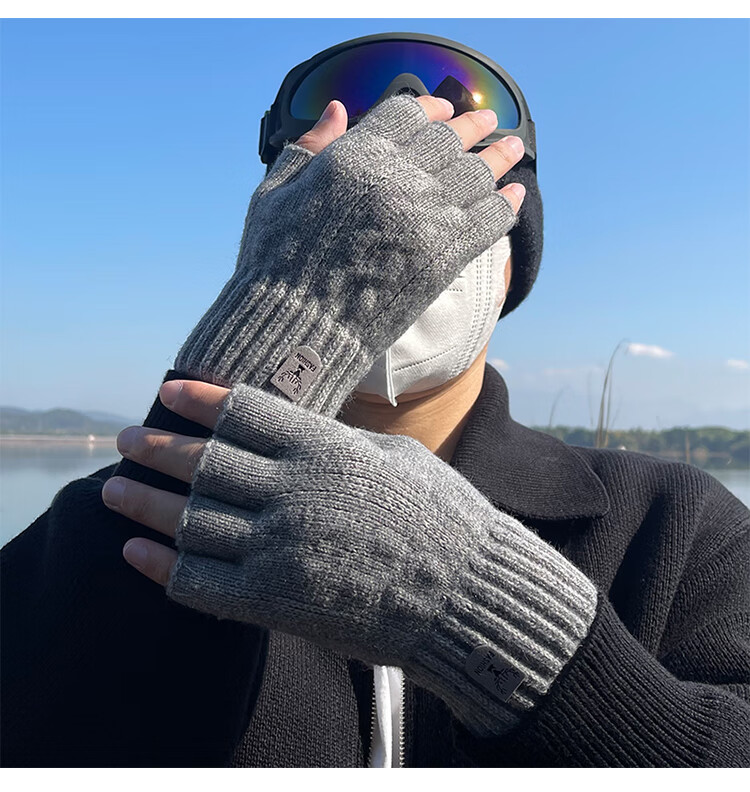 半指手套男露指冬季半截无指骑行开车毛线针织漏指头防寒保暖 黑色-鹿角贴标半指 无规格