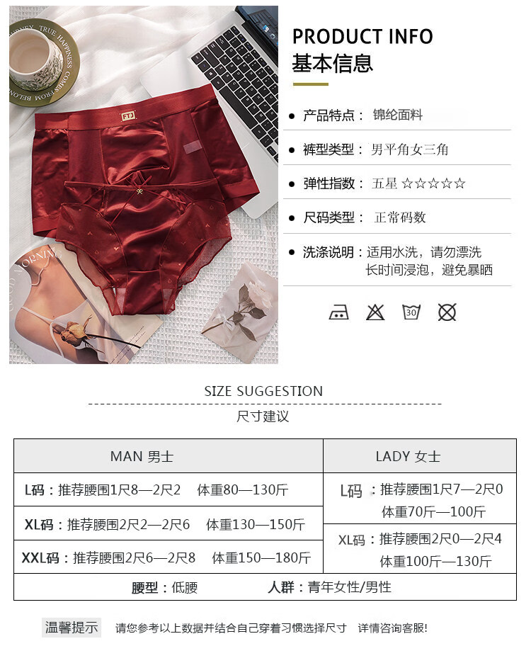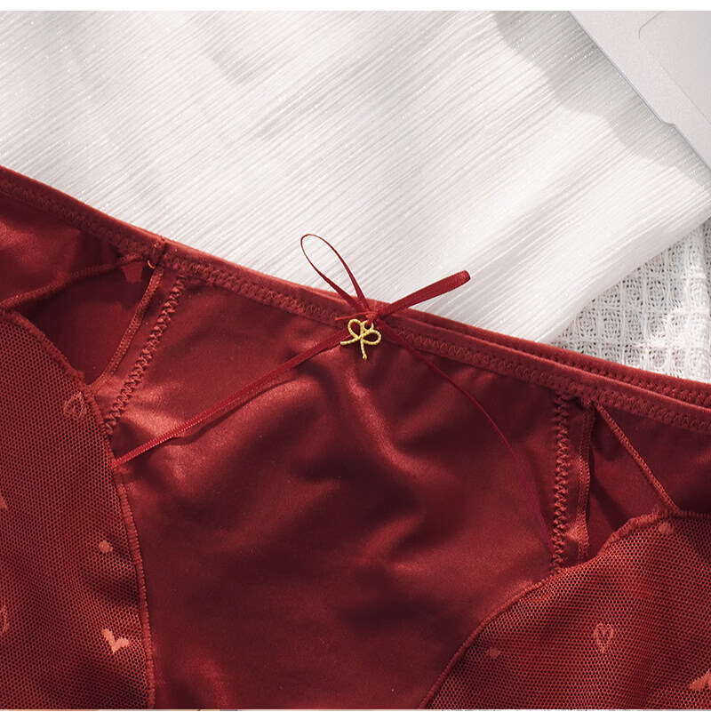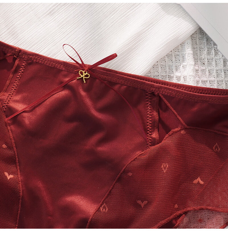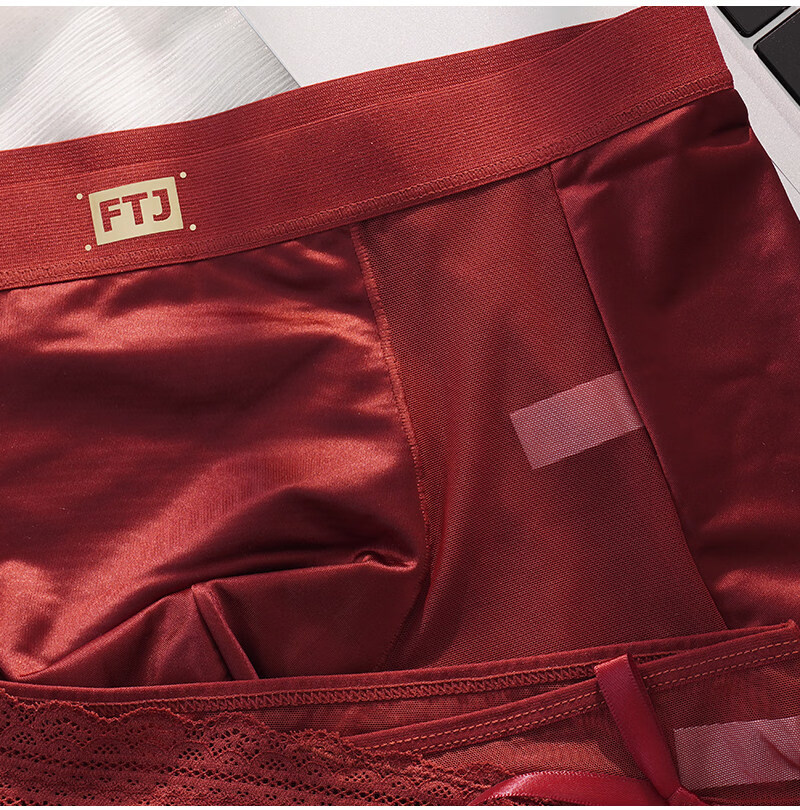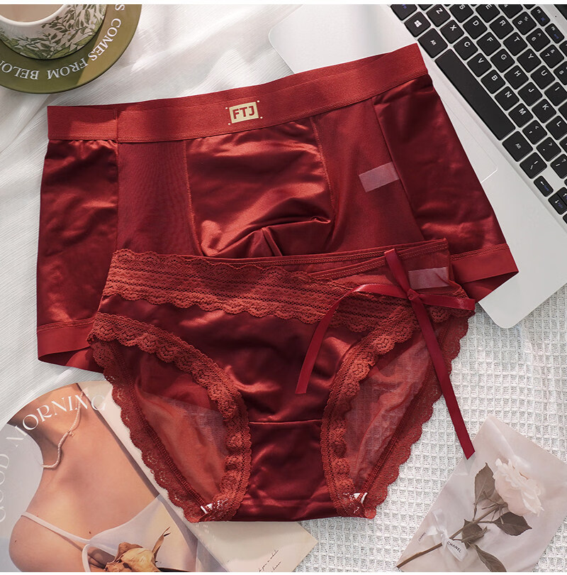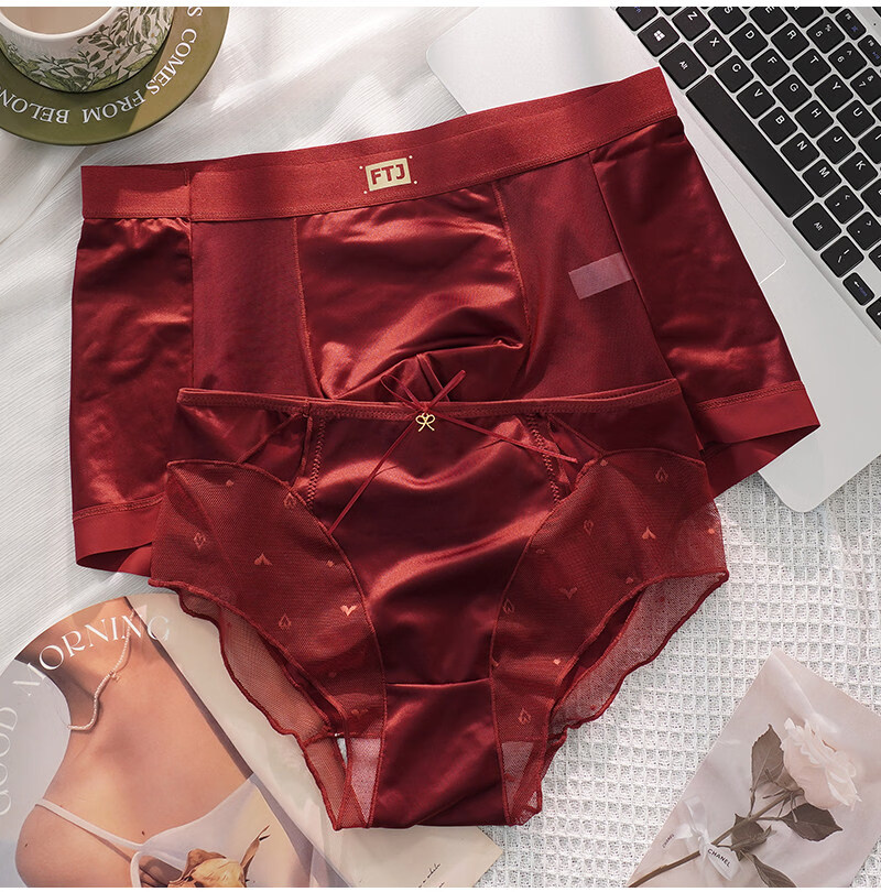 羅亨士情侣内裤红色一男一女生冰丝蕾丝性感双人诱惑情趣夫妻房事底裤衩 侧大蝴蝶结 2条 2XL 男+女L码
