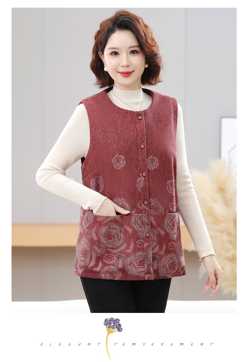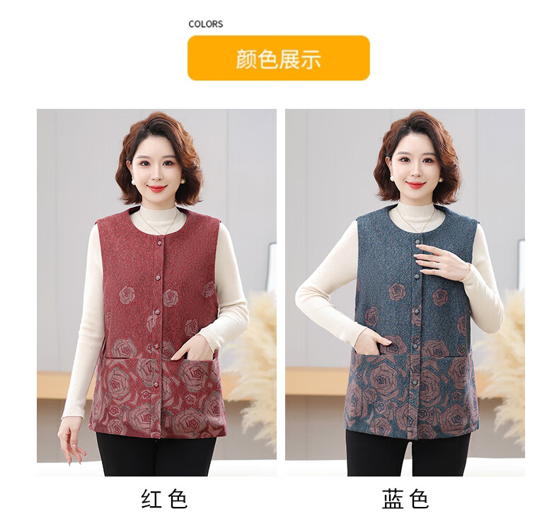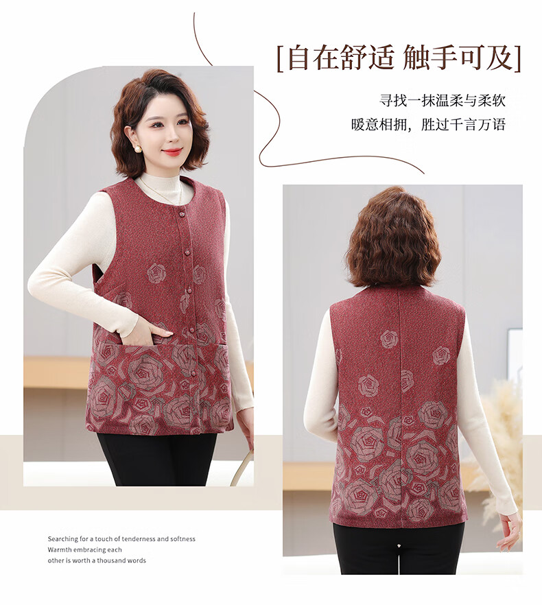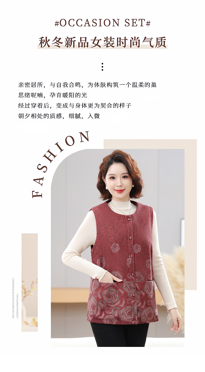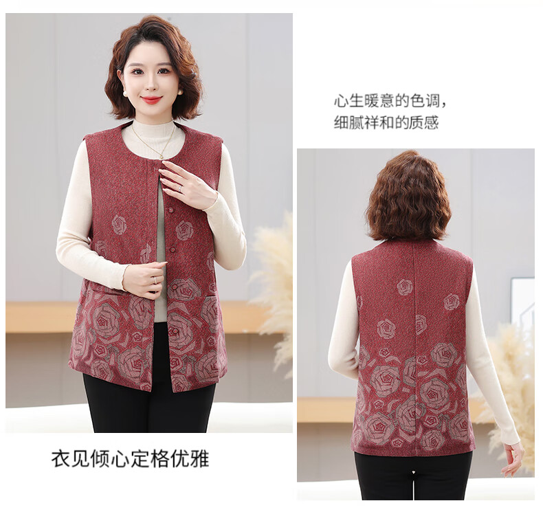 榄舍大码妈妈圆领马甲女秋装加厚款坎肩外套中老年胖太太加肥保暖马夹 红色 7XL (建议210-235斤)