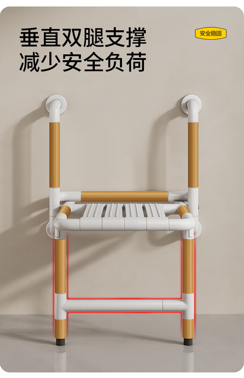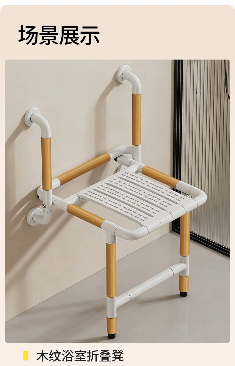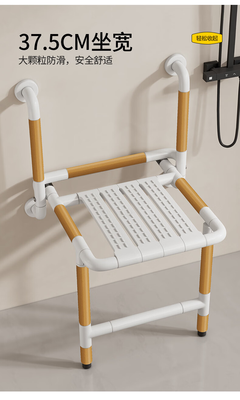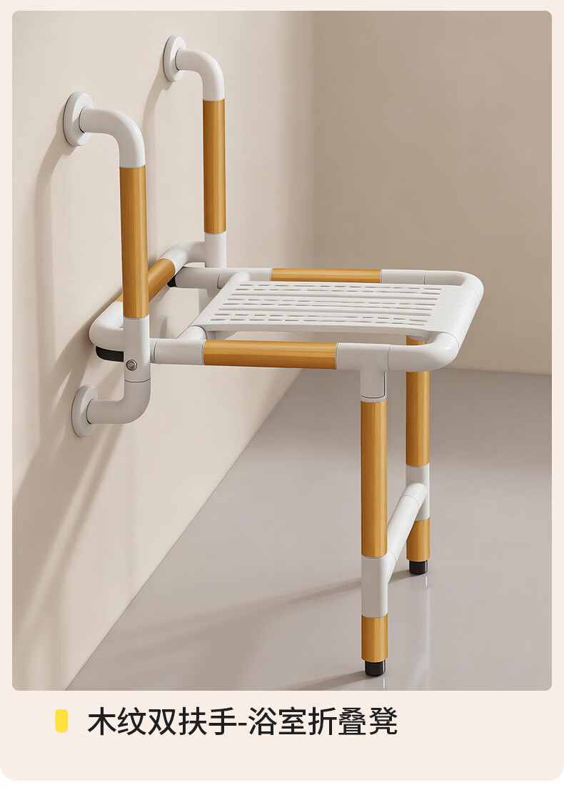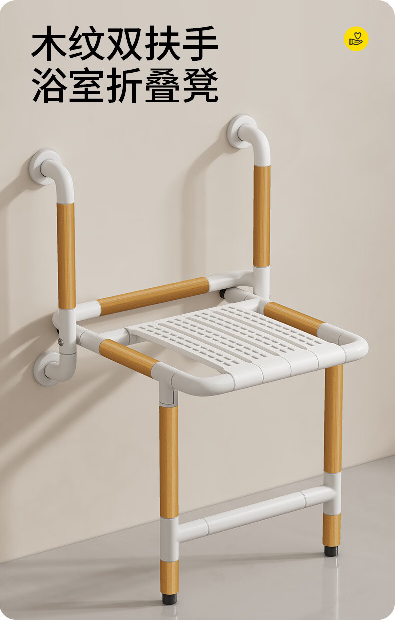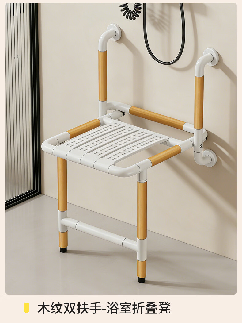 家文化(JIAWENHUA)老人浴室折叠凳双扶手残疾人专用洗澡椅孕妇防滑淋浴间壁挂式凳子 37.5CM宽双扶手折叠-木纹色洗澡椅