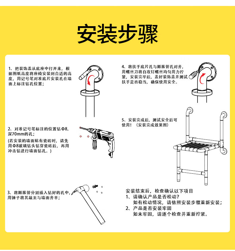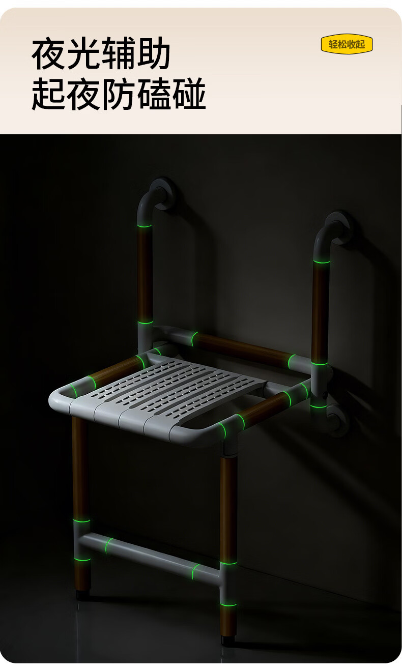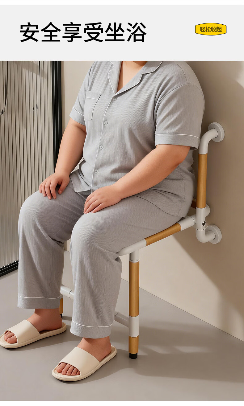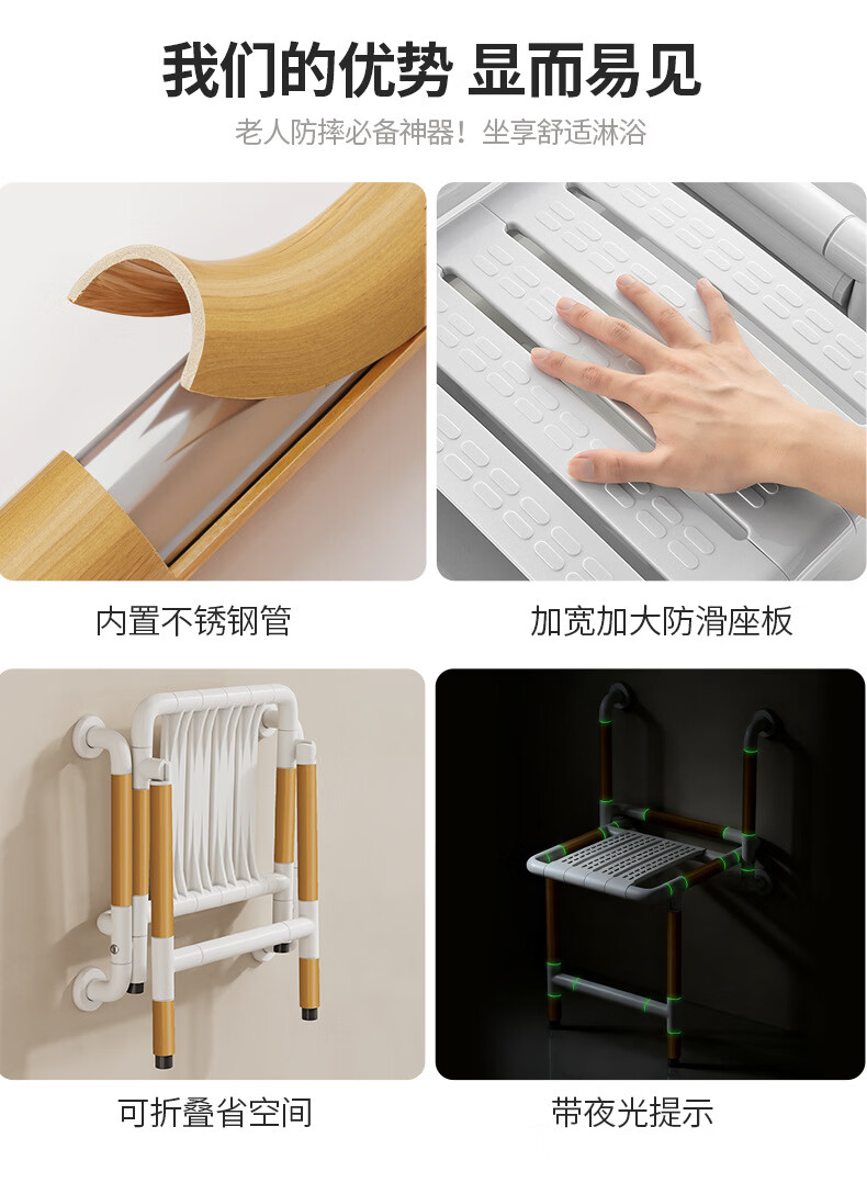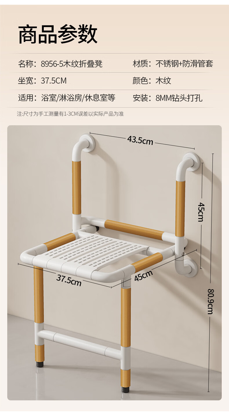 家文化(JIAWENHUA)老人浴室折叠凳双扶手残疾人专用洗澡椅孕妇防滑淋浴间壁挂式凳子 37.5CM宽双扶手折叠-木纹色洗澡椅