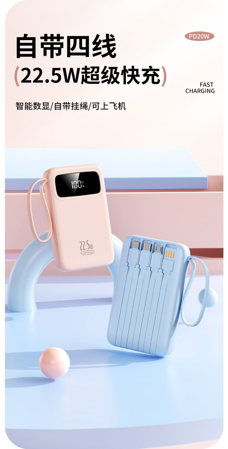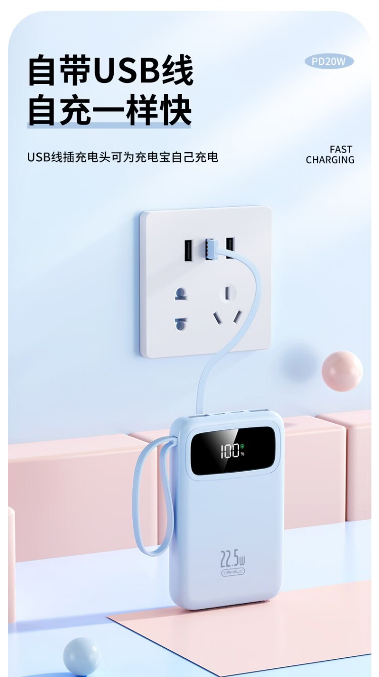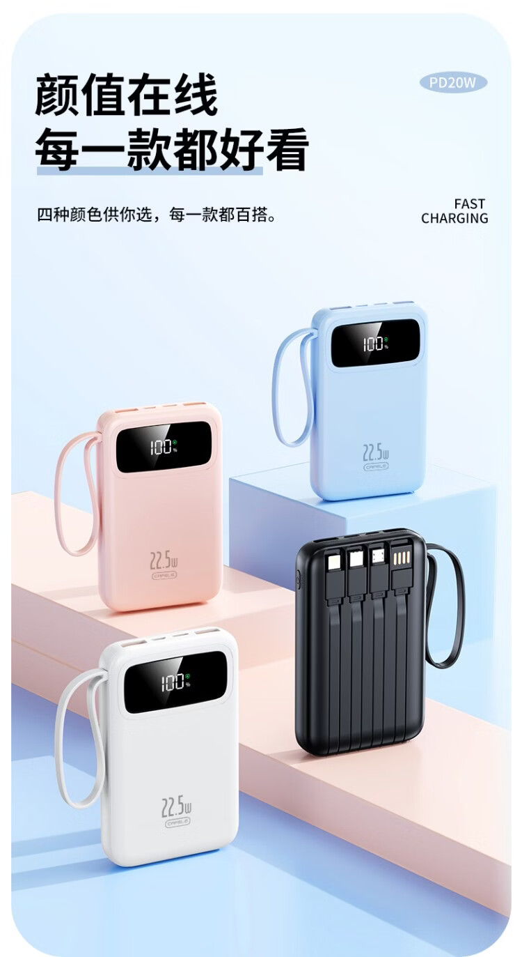 卡斐乐充电宝3C认证可上飞机20000毫安超大容量22.5W超级快充自带四线小巧便携适用安卓小米苹果VIVO 曜夜黑【至臻版|超级快充】提速999% 20000毫安【自带4线|国家3C认证】