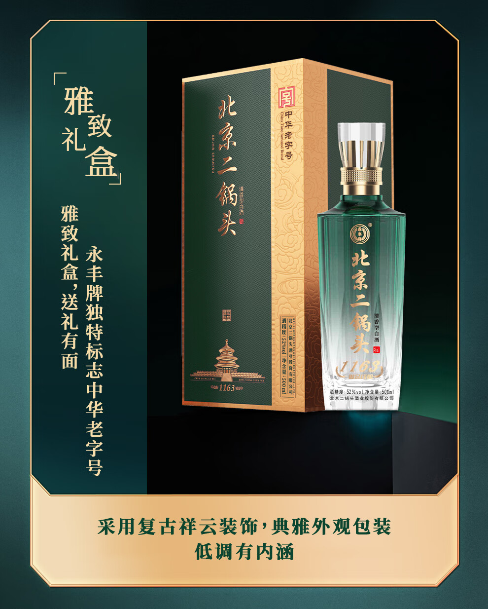 永丰牌北京二锅头 白酒礼盒 52度粮食酒 清香型白酒 自喝送礼聚会聚餐C 52度 500mL 2瓶 【北京二锅头 御品佳酿2瓶配礼袋】