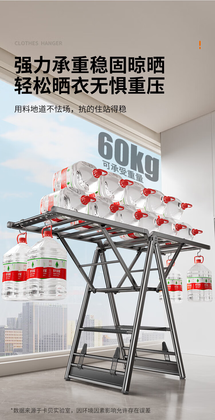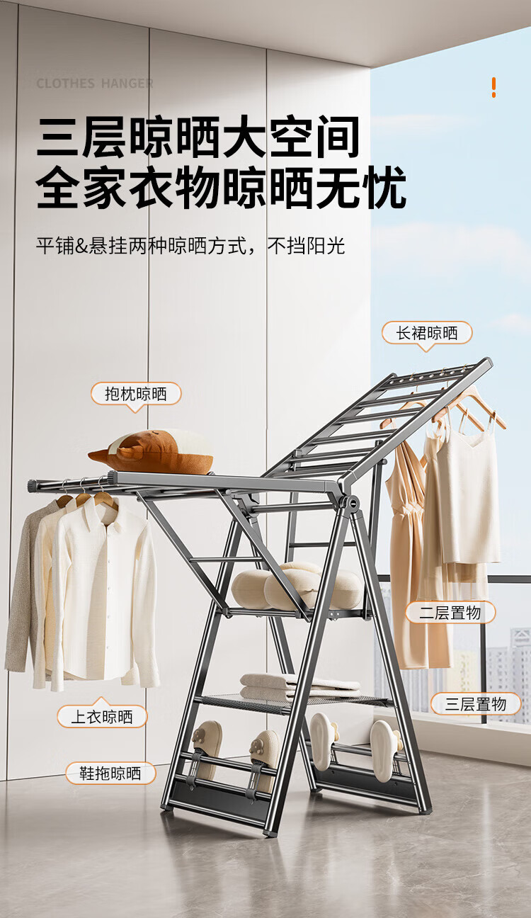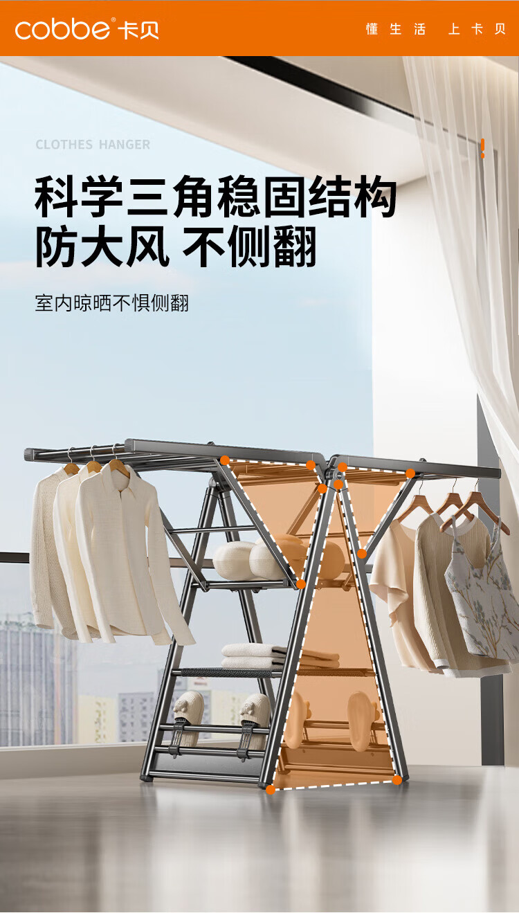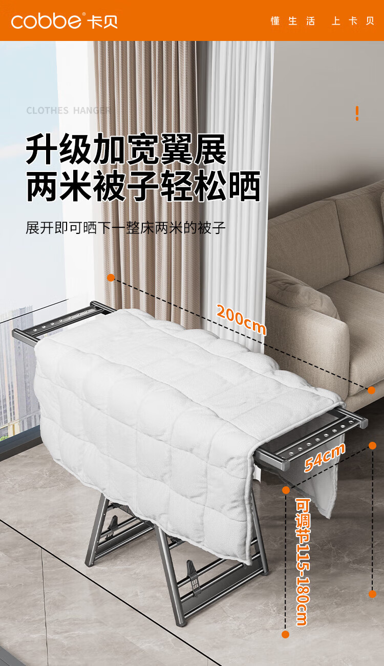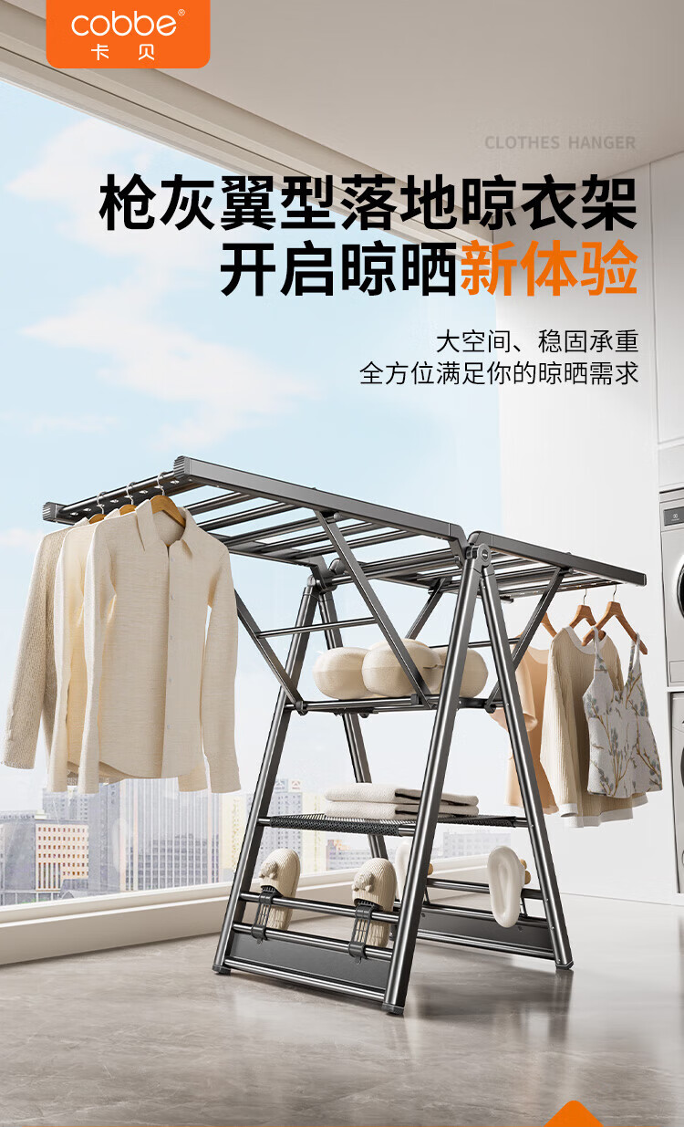 卡贝(cobbe)落地晾衣架折叠凉晒衣架挂衣服家用室内宿舍阳台晒被子铝合金衣杆 纳米灰【2.0M加粗加厚】