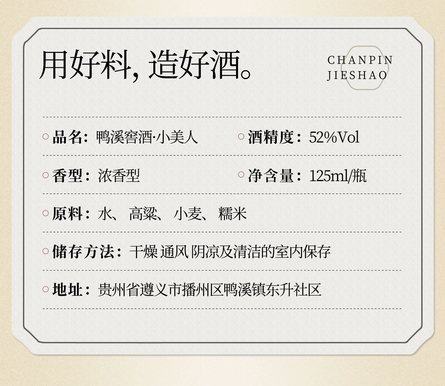 鸭溪窖酒 小美人 52度浓香型白酒 纯粮食酒 自饮小酌摆柜小酒 52度 125mL 1瓶