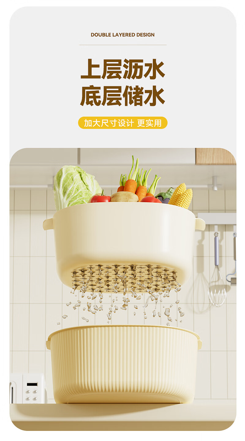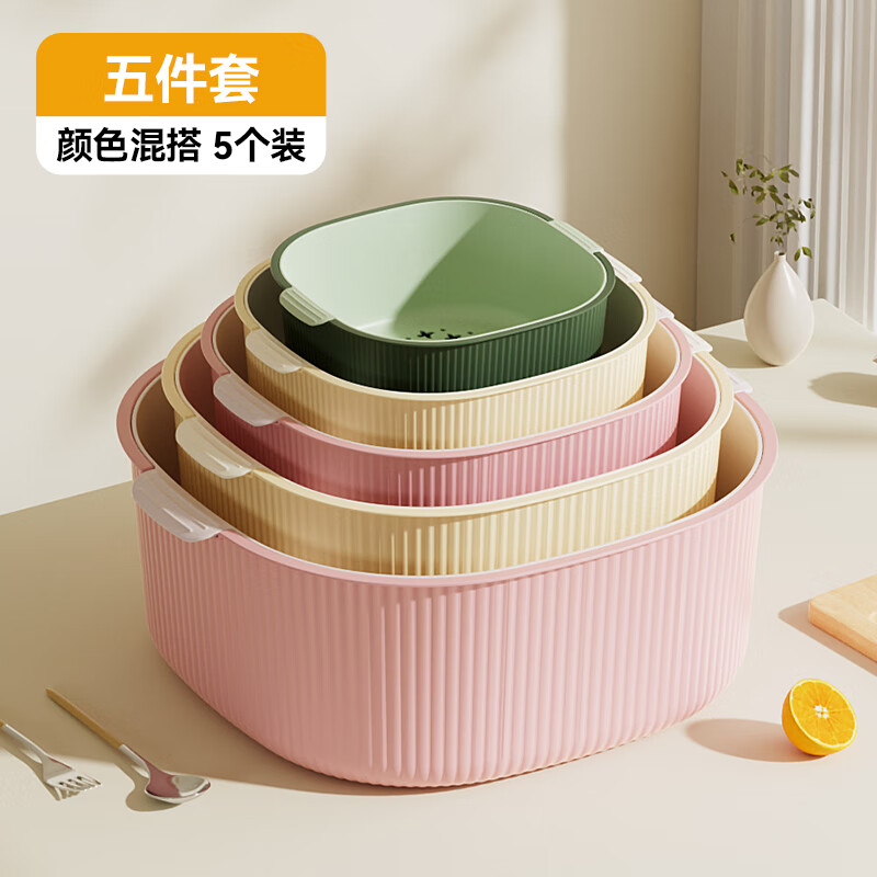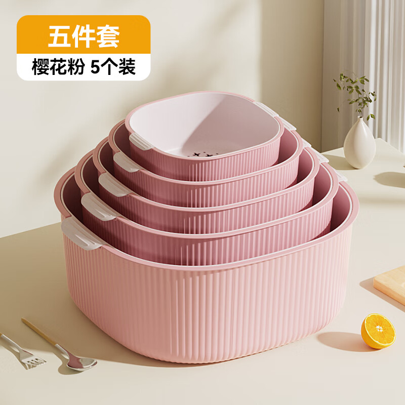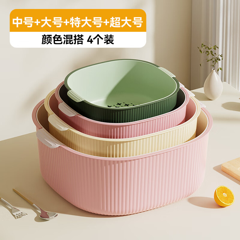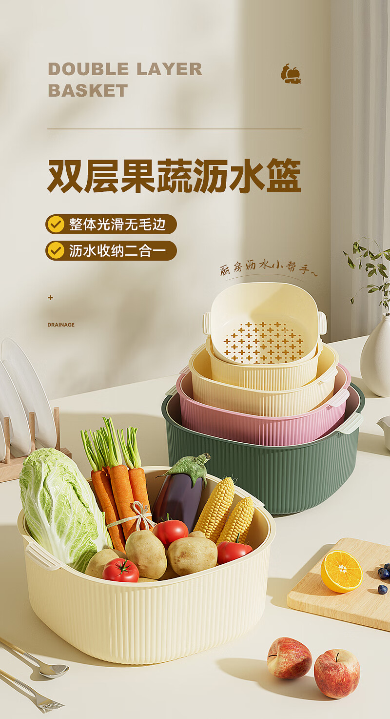 双层洗菜沥水篮厨房洗菜盆家用塑料镂空篮子易清洗方便收纳省空间 淡粉色-撞色【超大】双层沥水篮 双层沥水盆【pp材质】