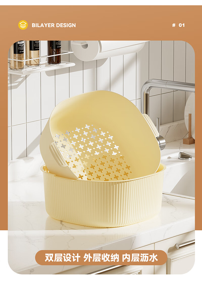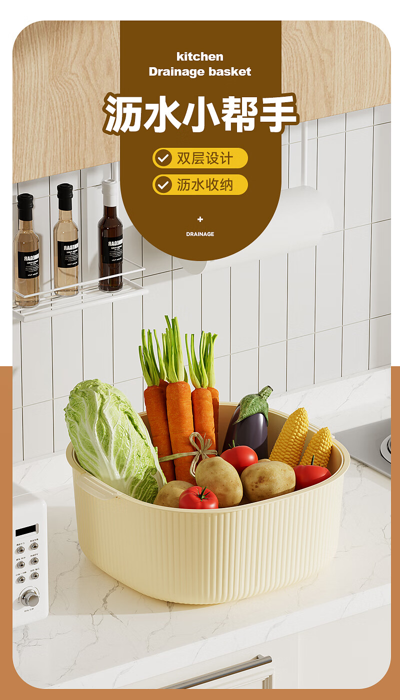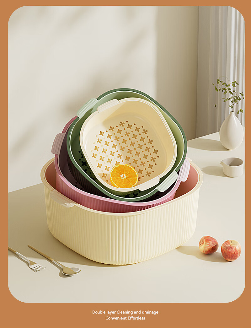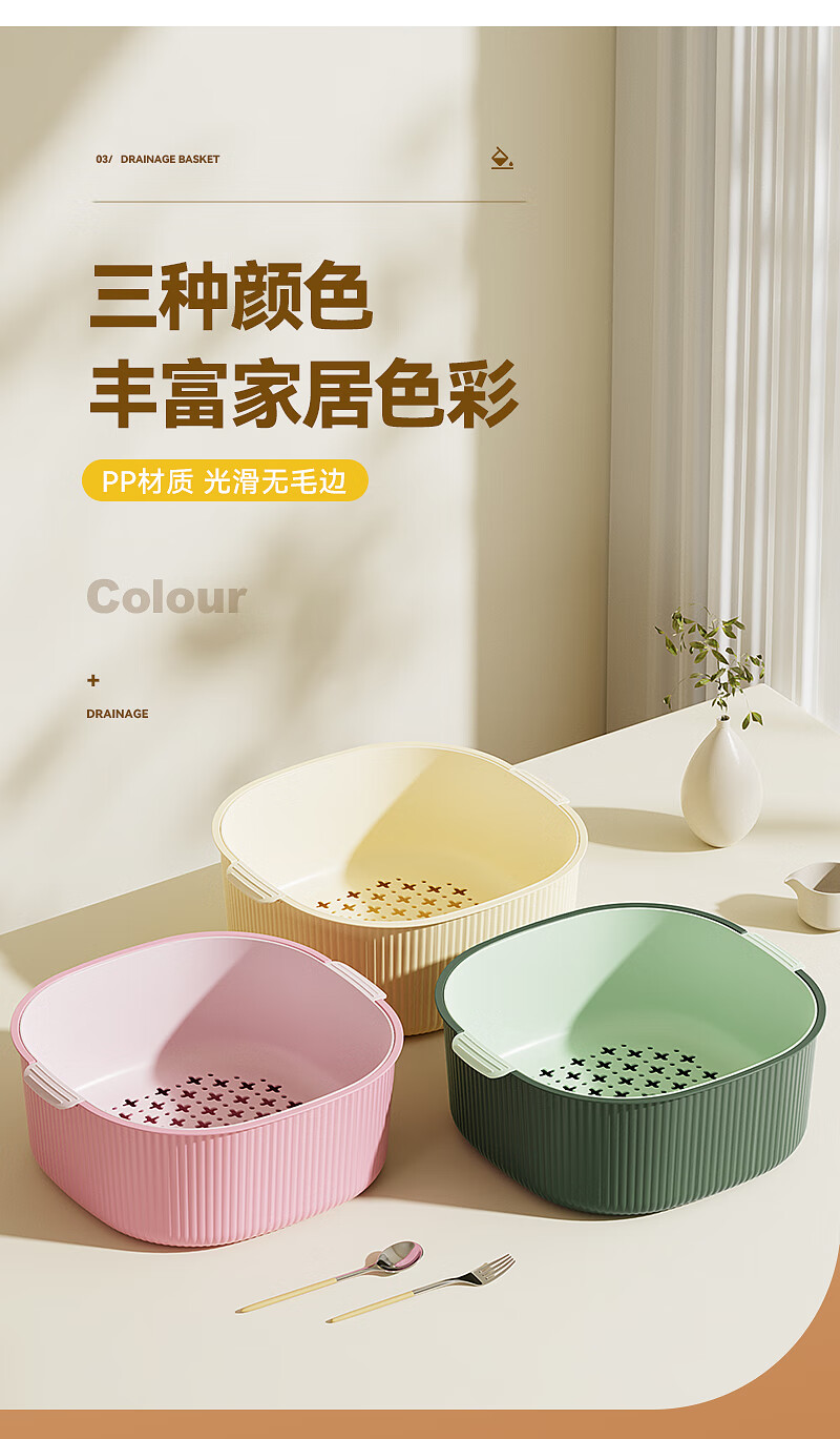 双层洗菜沥水篮厨房洗菜盆家用塑料镂空篮子易清洗方便收纳省空间 淡粉色-撞色【超大】双层沥水篮 双层沥水盆【pp材质】