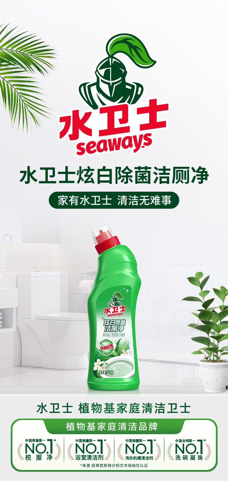 水卫士炫白除菌洁厕净马桶清洁剂洁厕液厕所清洁杀菌除垢祛味去尿渍尿垢 【免刷洗】洁厕净500g*3瓶