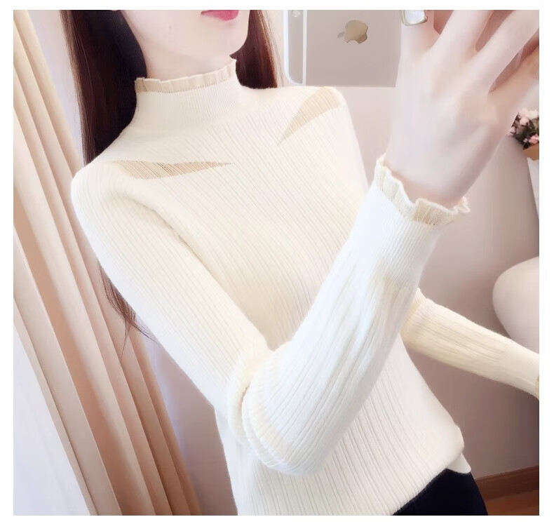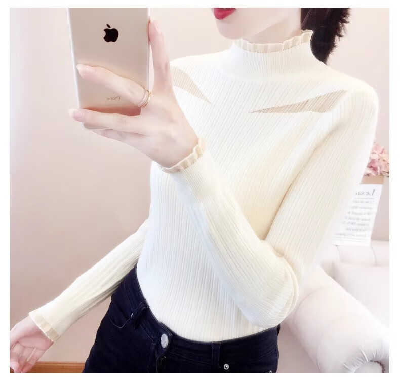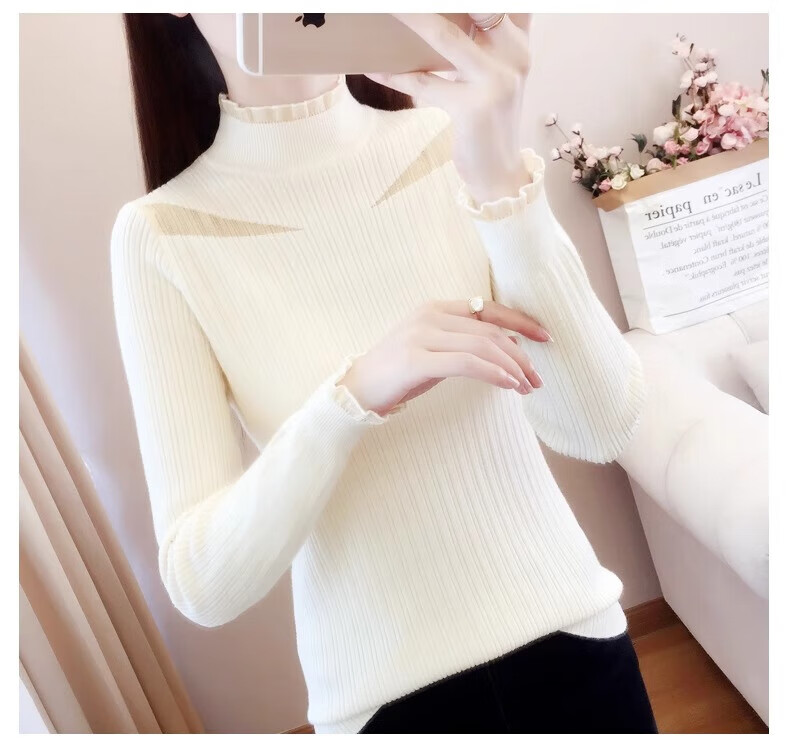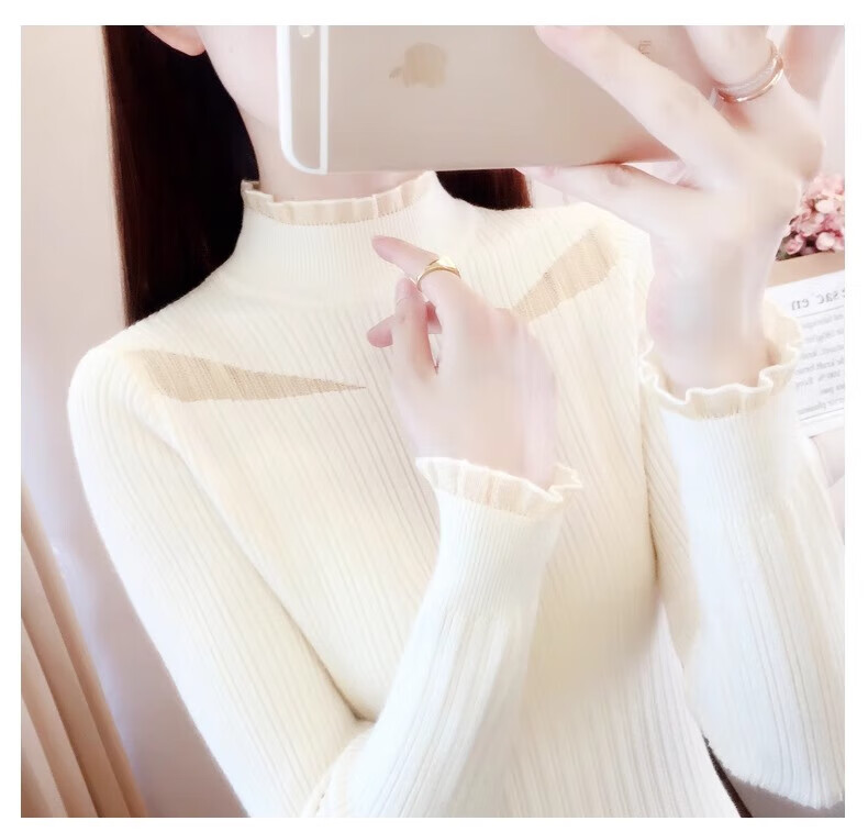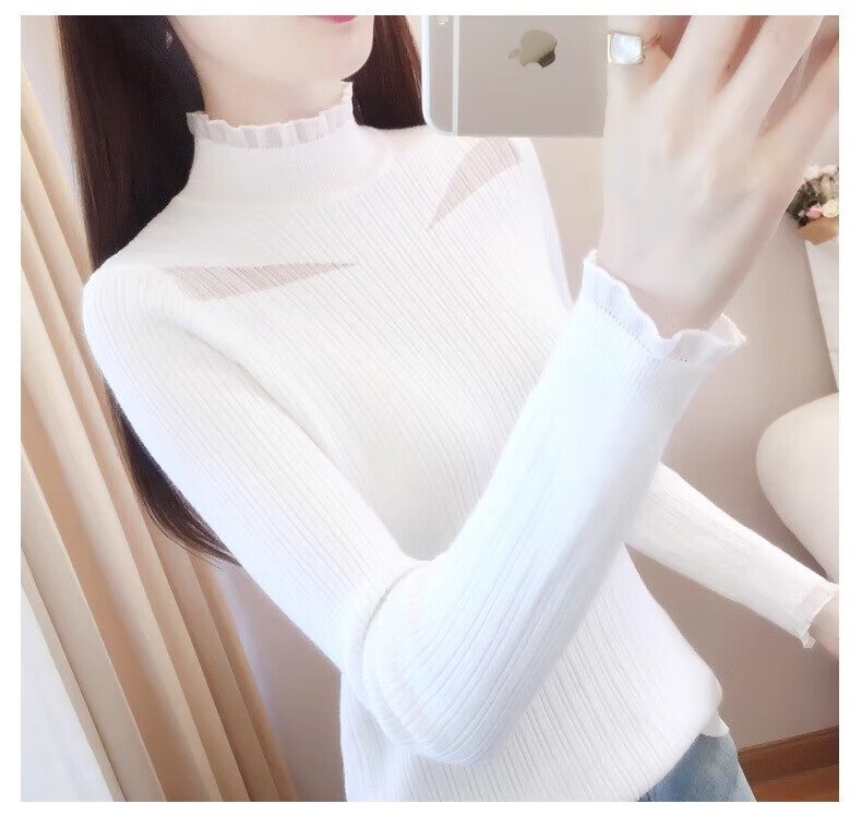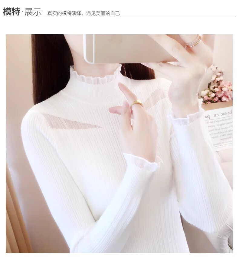 香影芬半高领蕾丝网纱拼接毛衣打底衫女秋冬2025新款内搭修身针织衫上衣 白色 XL (建议115-125斤)