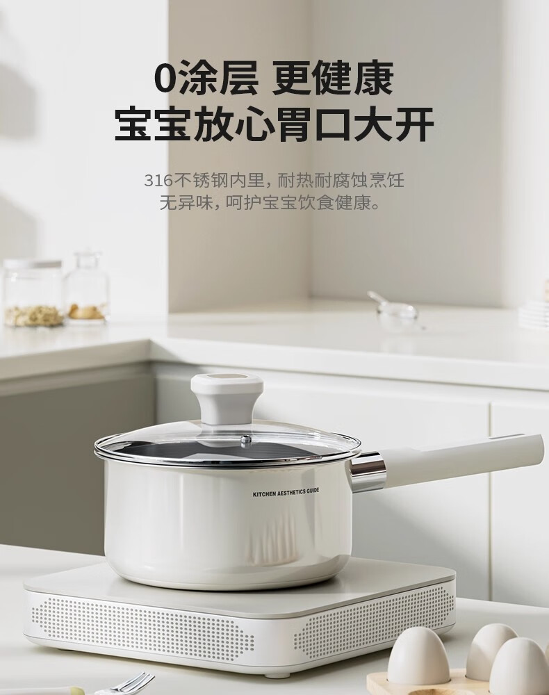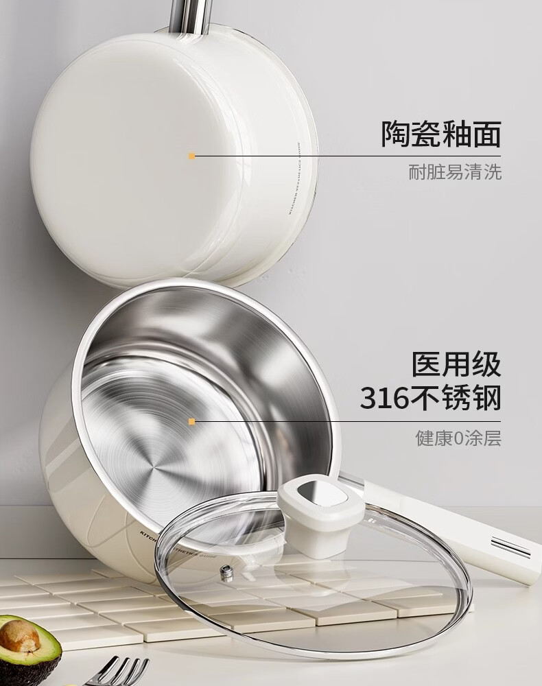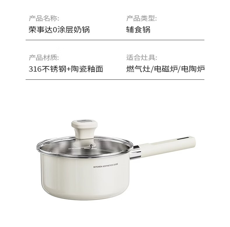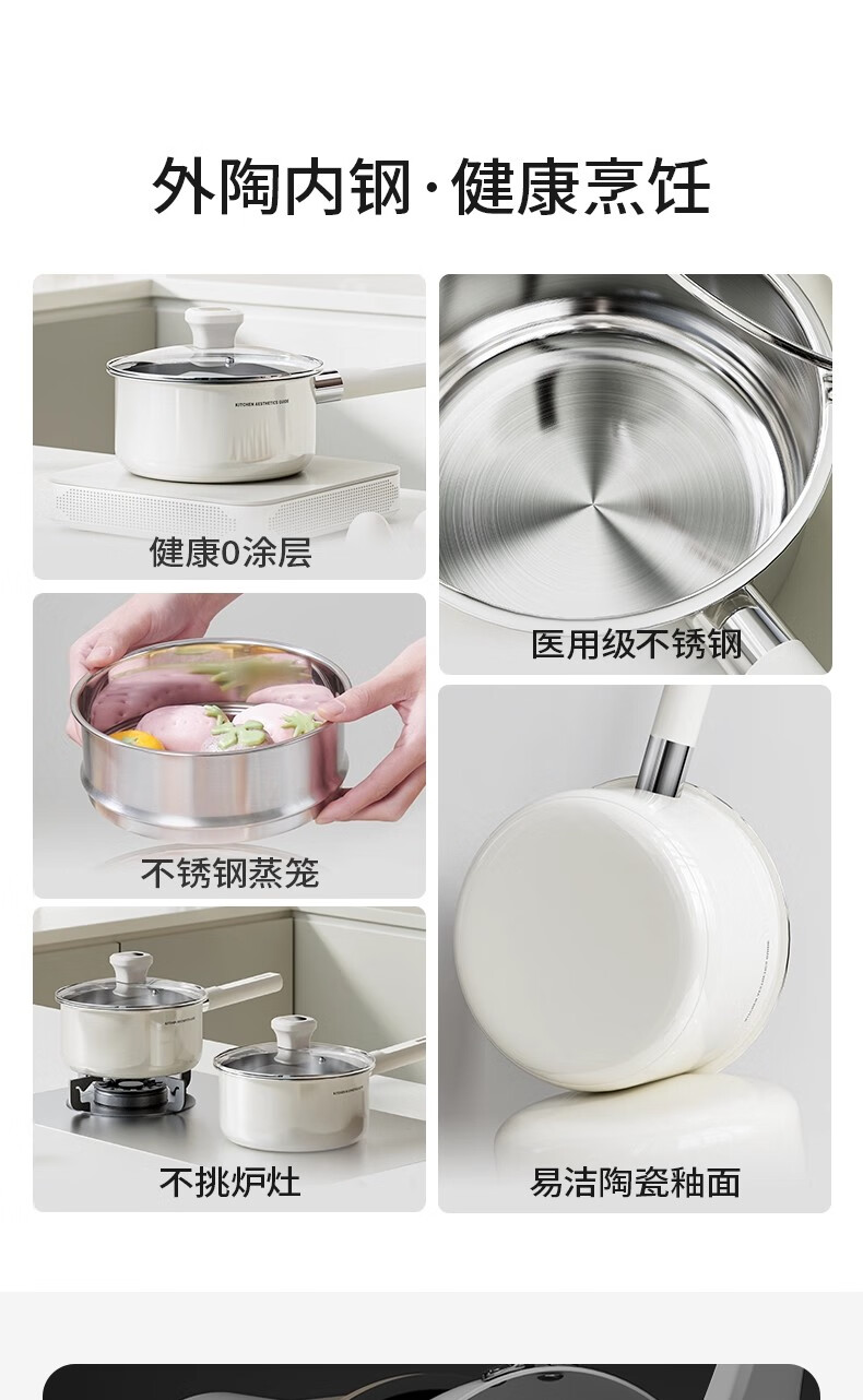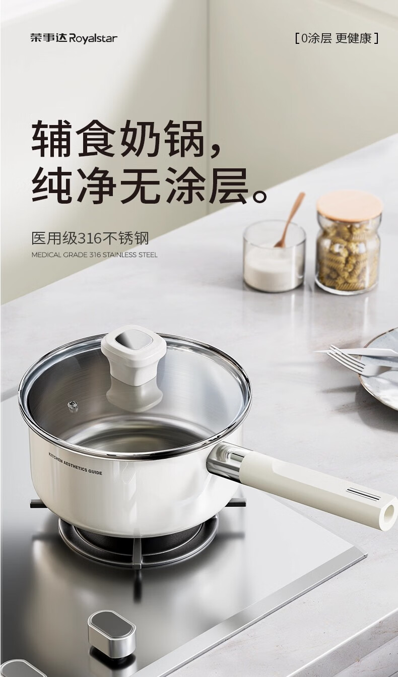 荣事达无涂层奶锅316不锈钢陶瓷婴儿宝宝辅食锅煮面热奶一体汤锅 陶钢奶锅+蒸屉【真·316不锈钢】 18cm