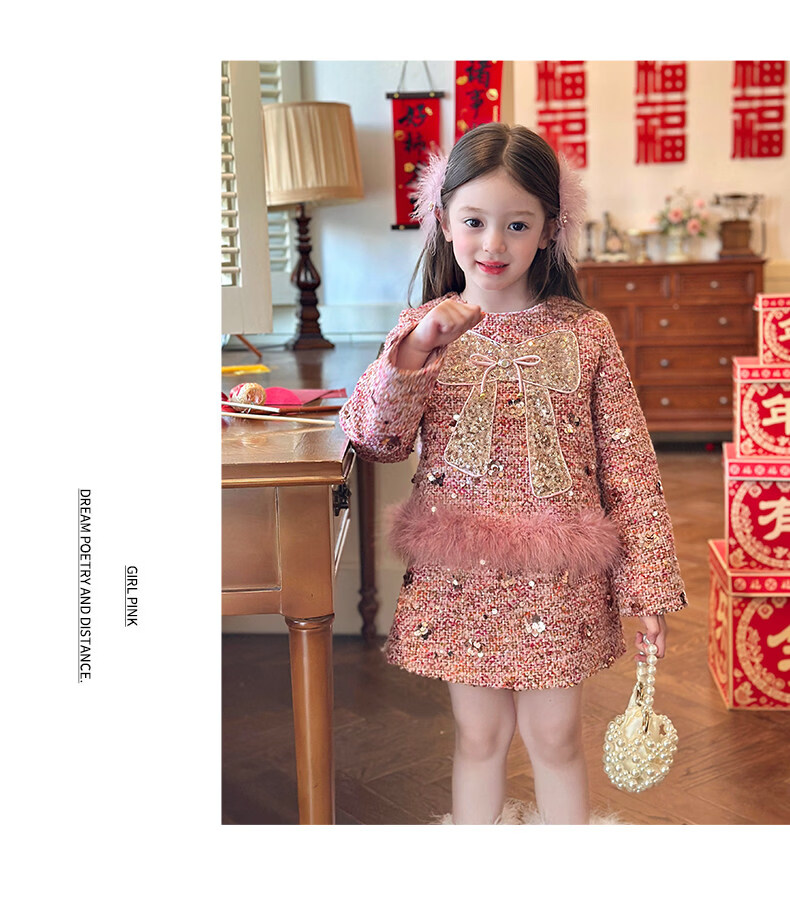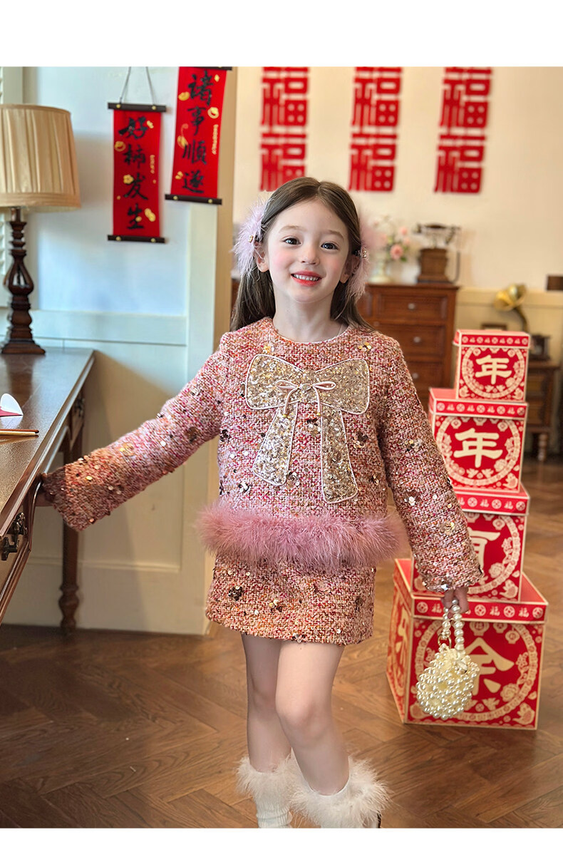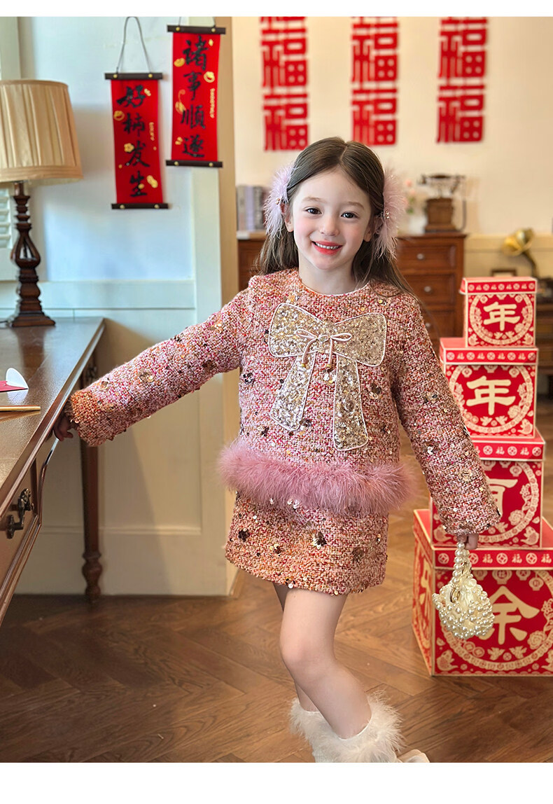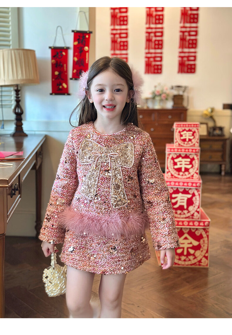 栀了成长记童装女童小香风套装2025冬季儿童蝴蝶结亮片夹棉两件套 粉色 套装 110 cm