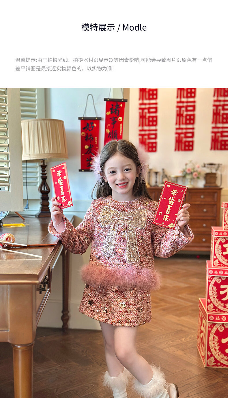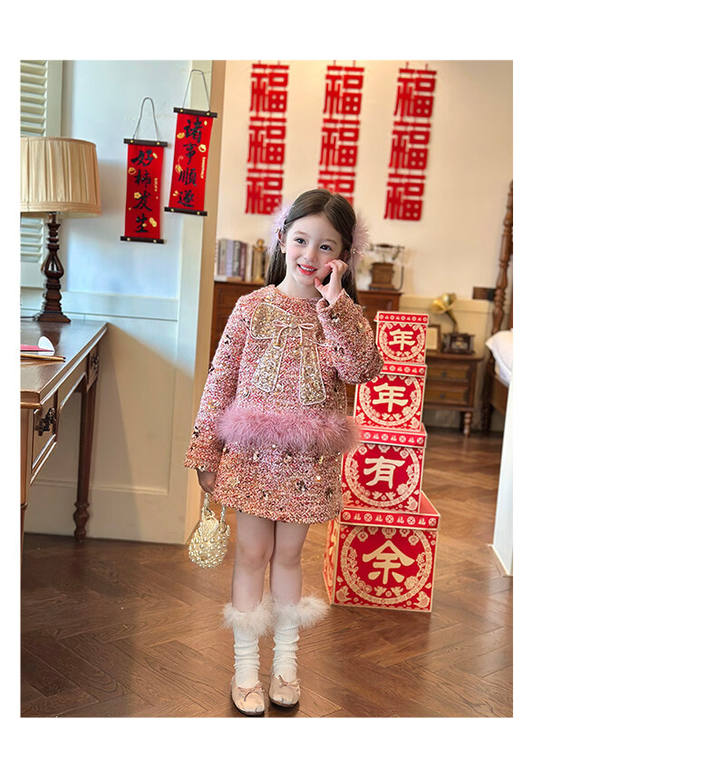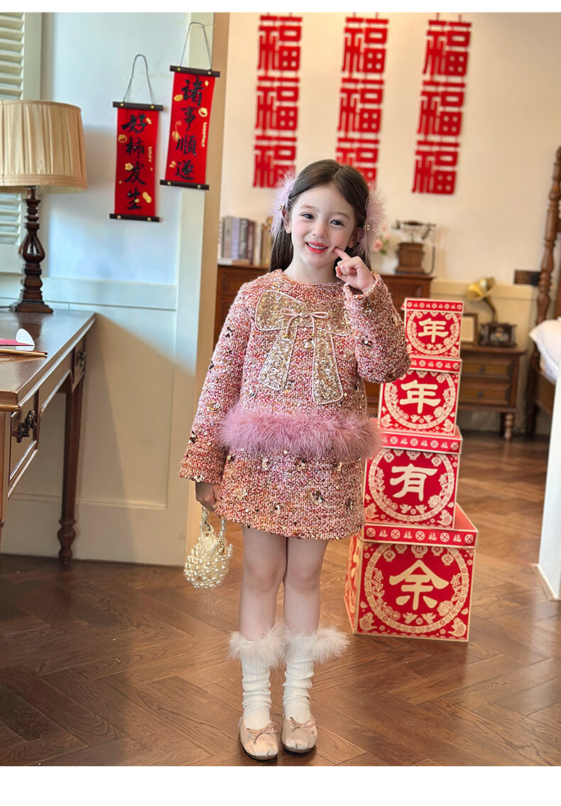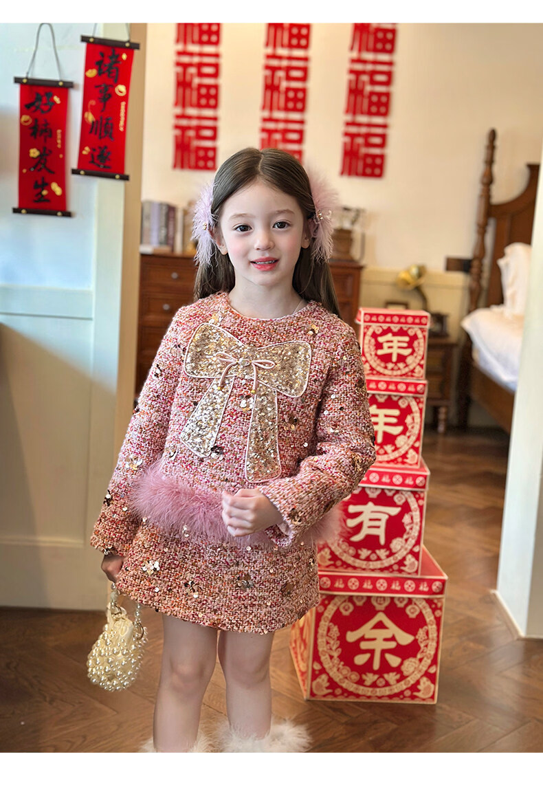 栀了成长记女童装红色小香风亮片套装2025冬季儿童加厚新年两件套 红色 100 cm