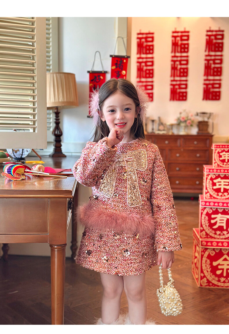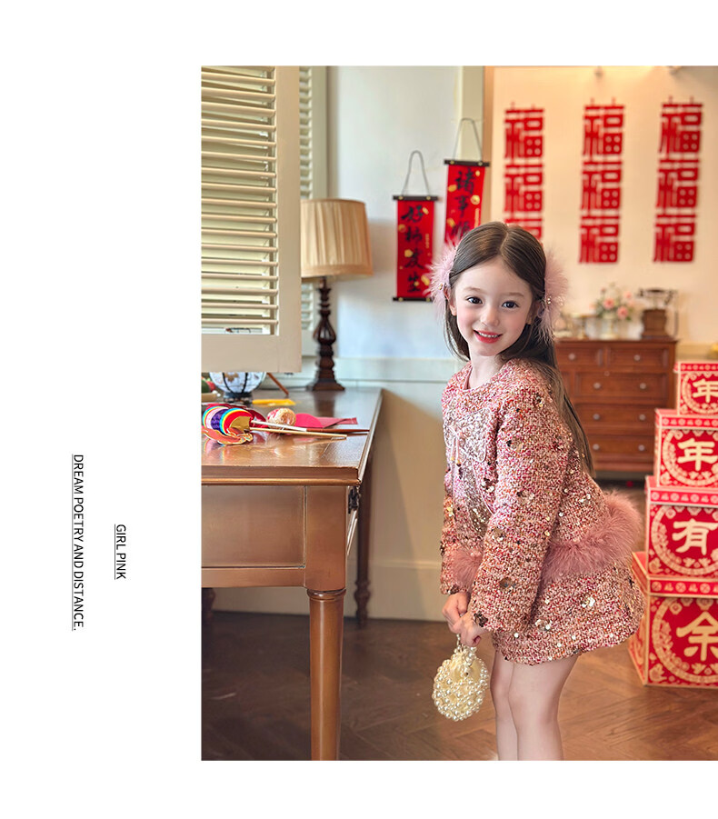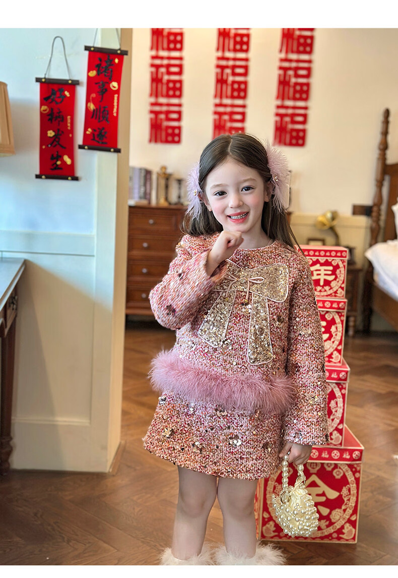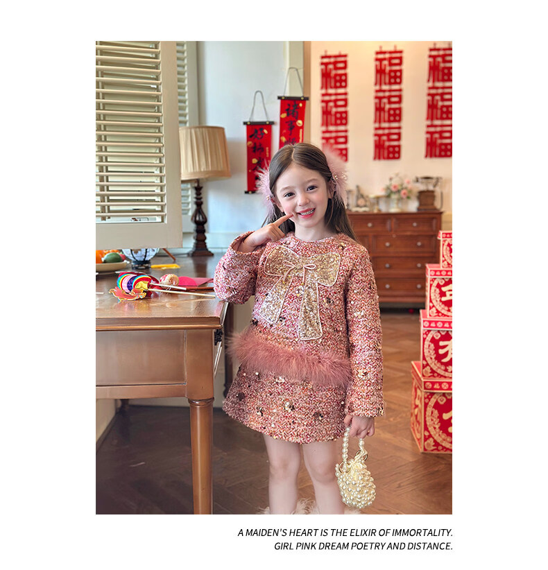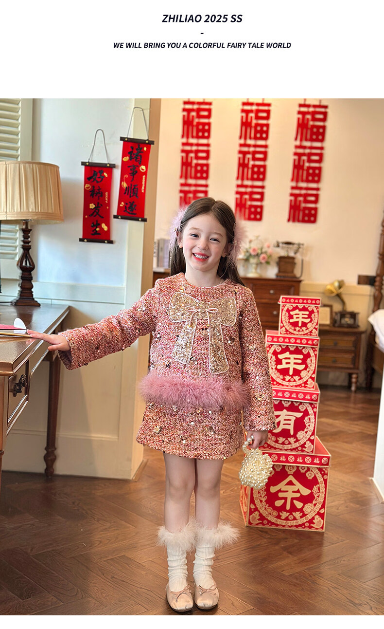 栀了成长记女童装红色小香风亮片套装2025冬季儿童加厚新年两件套 红色 100 cm