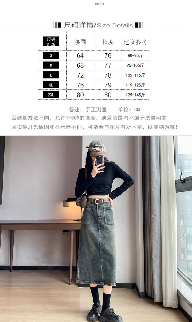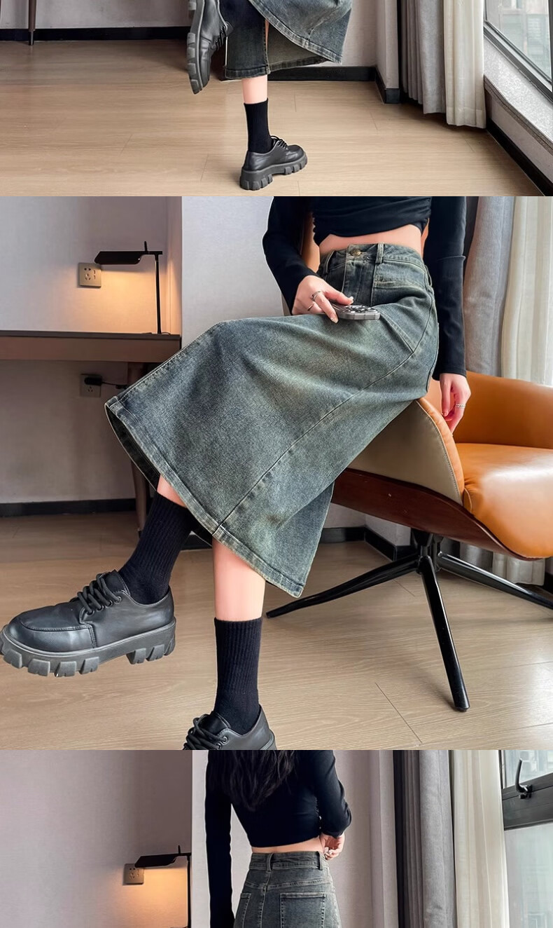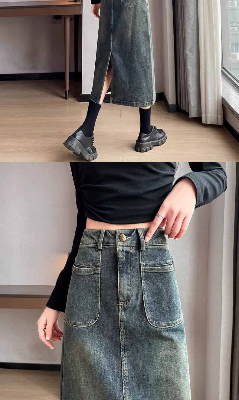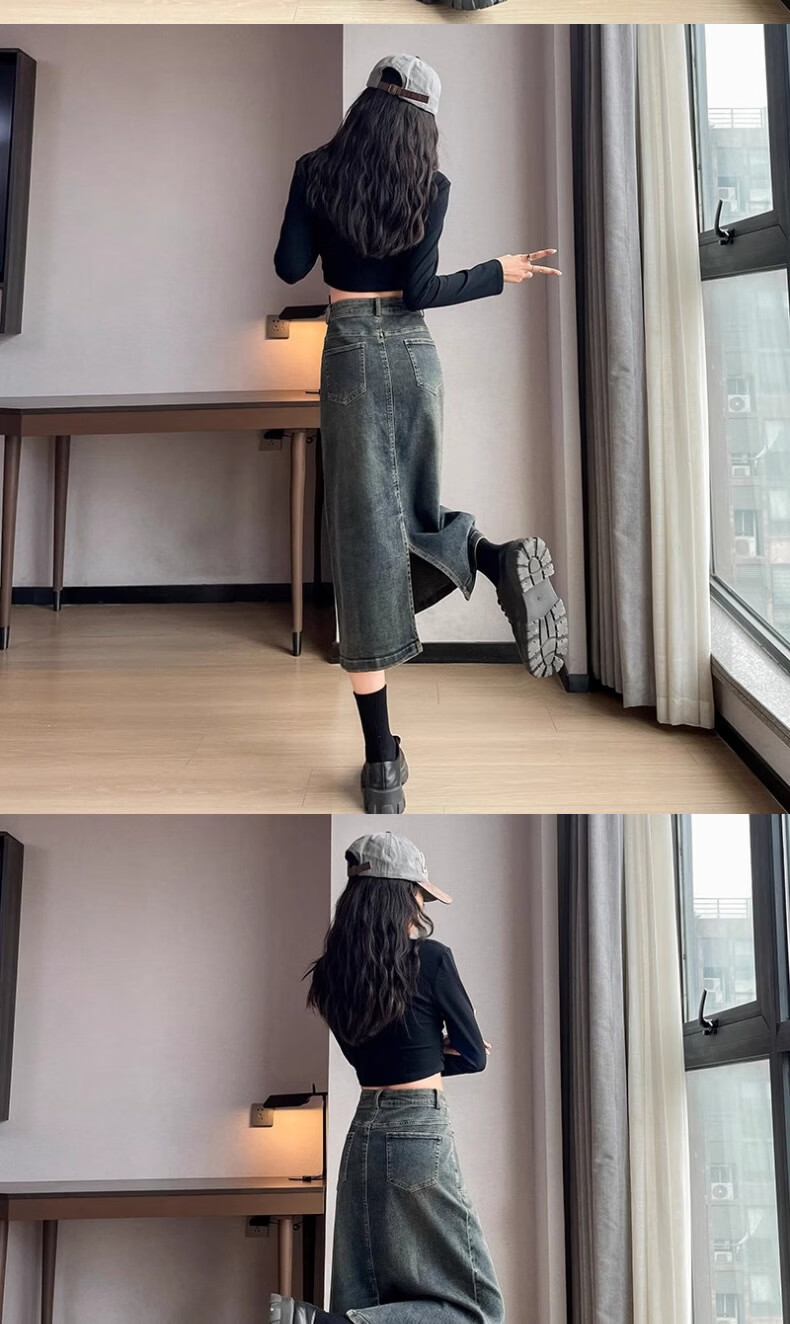 WAMLBN2026春夏季新款复古高腰牛仔裙女开叉显瘦半裙中长款a字半身裙 水泥灰 L