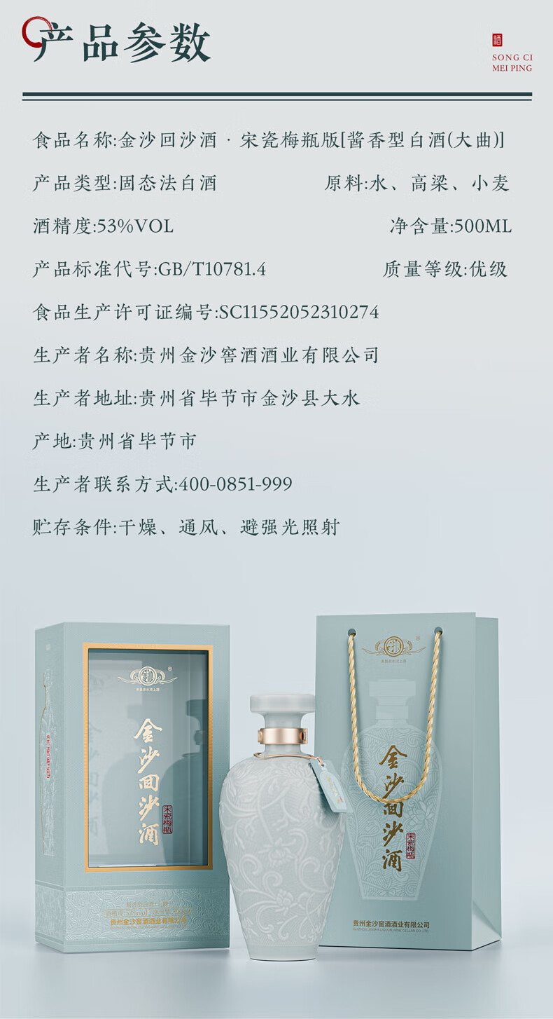 金沙回沙酒 宋瓷梅瓶 53度酱香型白酒纯粮坤沙 博物馆联名 宴请送礼 53%vol 500mL 1瓶