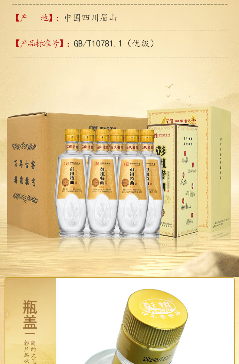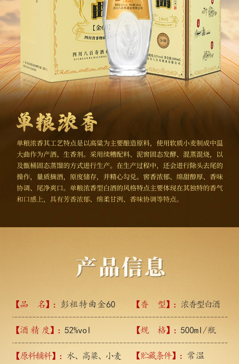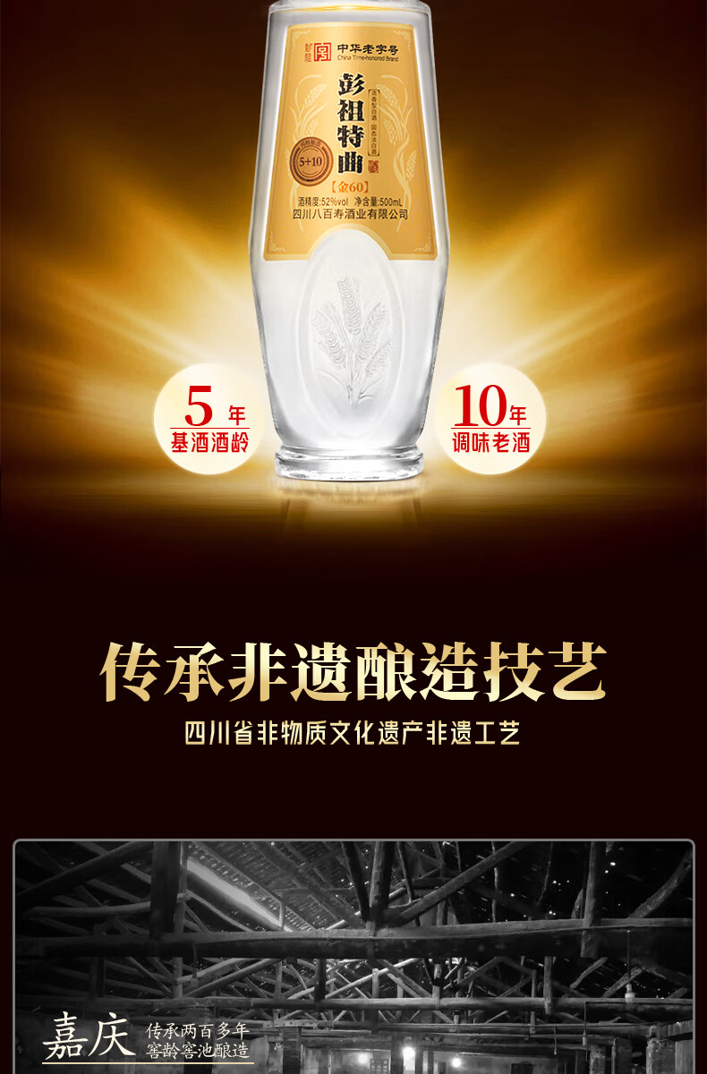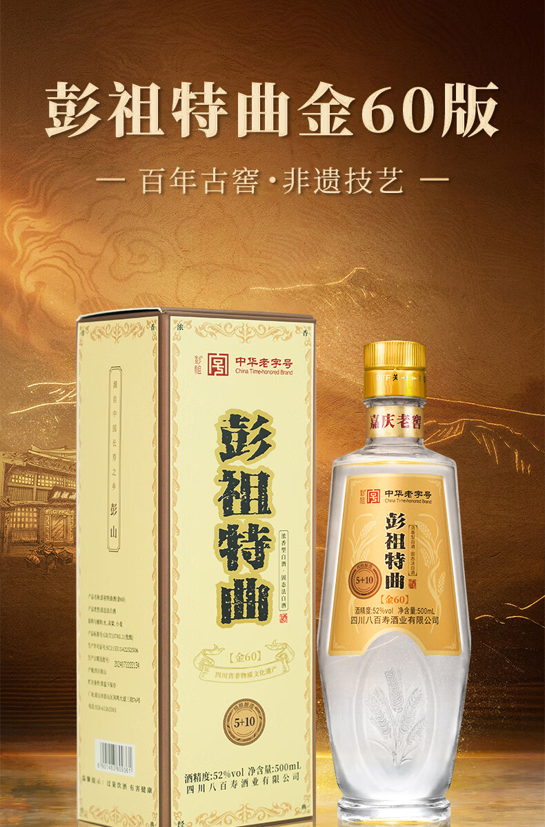 彭祖特曲金60 52度浓香型固态法纯粮优级白酒500ml中华老字号非遗技艺 52%vol 500mL 6瓶 整箱(送手提袋)