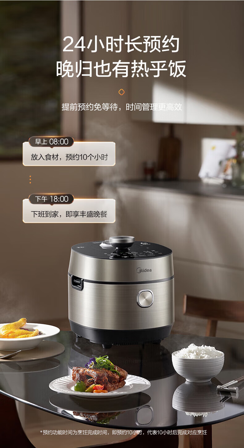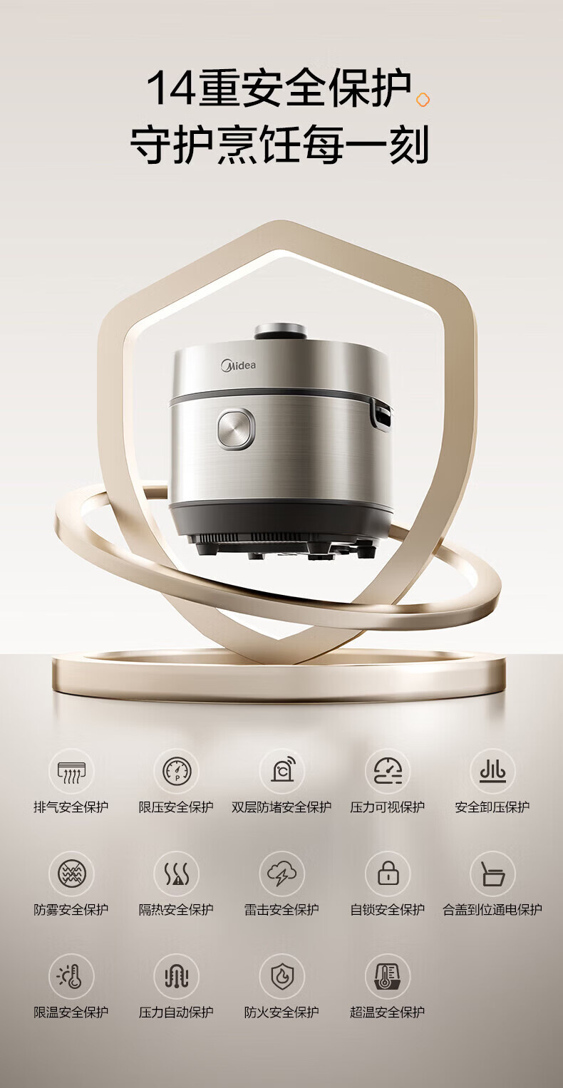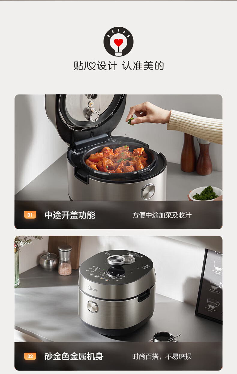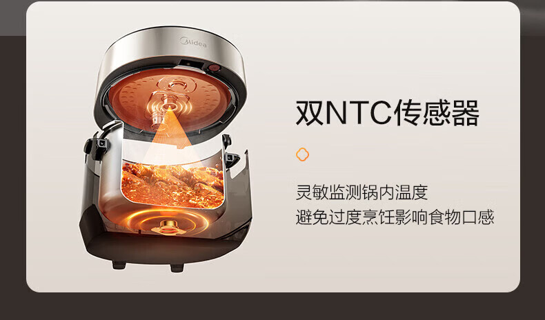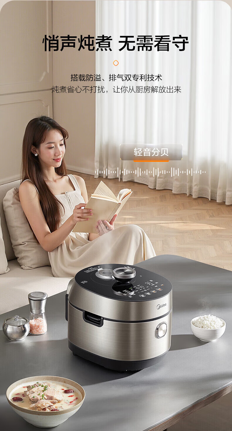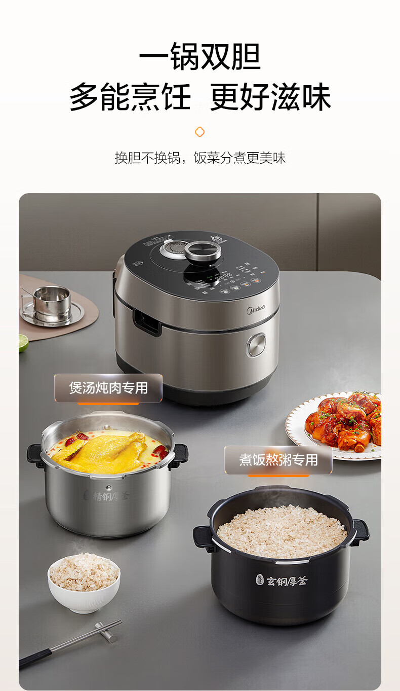 美的(Midea)低脂浓香电压力锅 家用大容量5L低音排气2200W智能预约超高压112KPa可调高压锅双内胆0涂层电饭煲 【0涂层+双内胆+自动排气】 5L