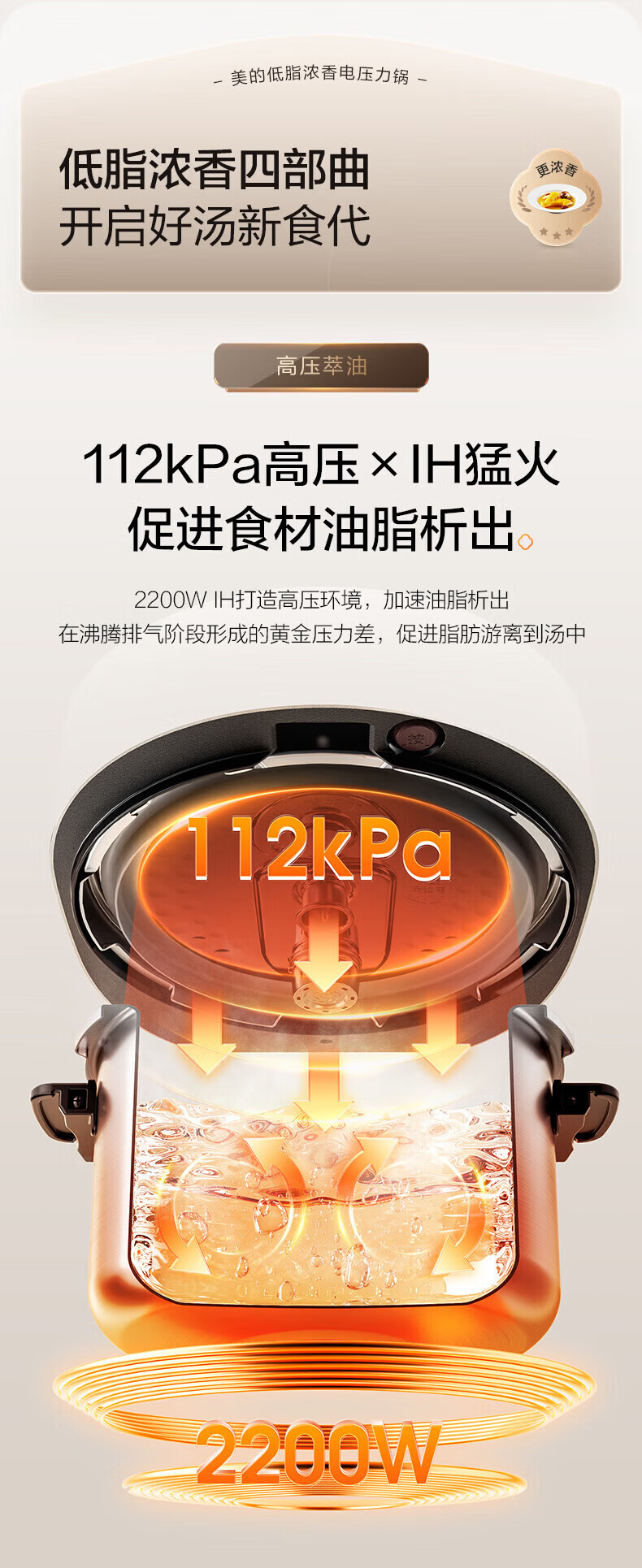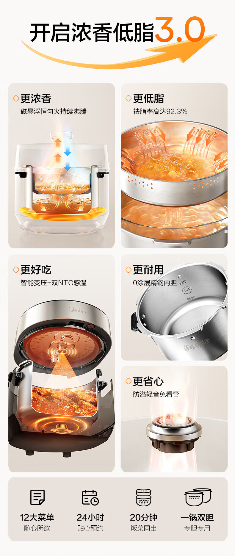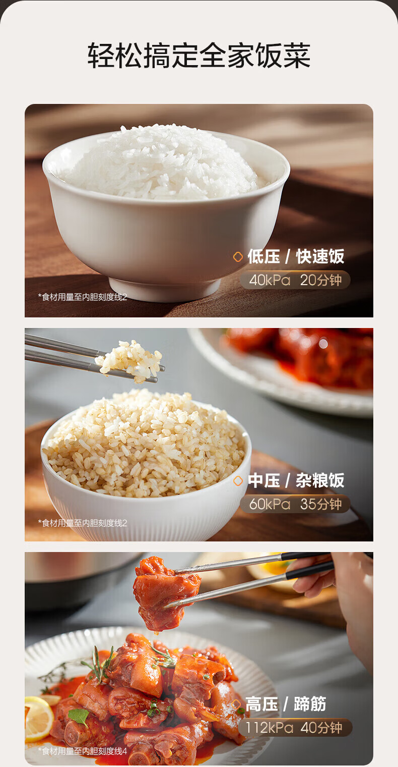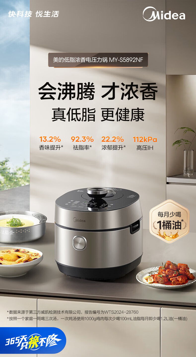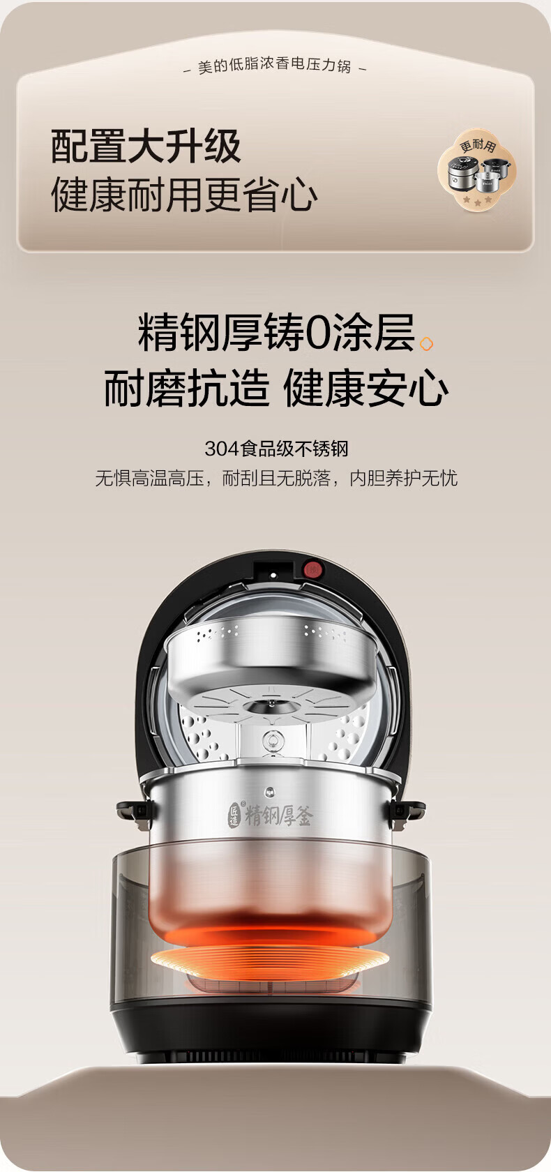 美的(Midea)低脂浓香电压力锅 家用大容量5L低音排气2200W智能预约超高压112KPa可调高压锅双内胆0涂层电饭煲 【0涂层+双内胆+自动排气】 5L