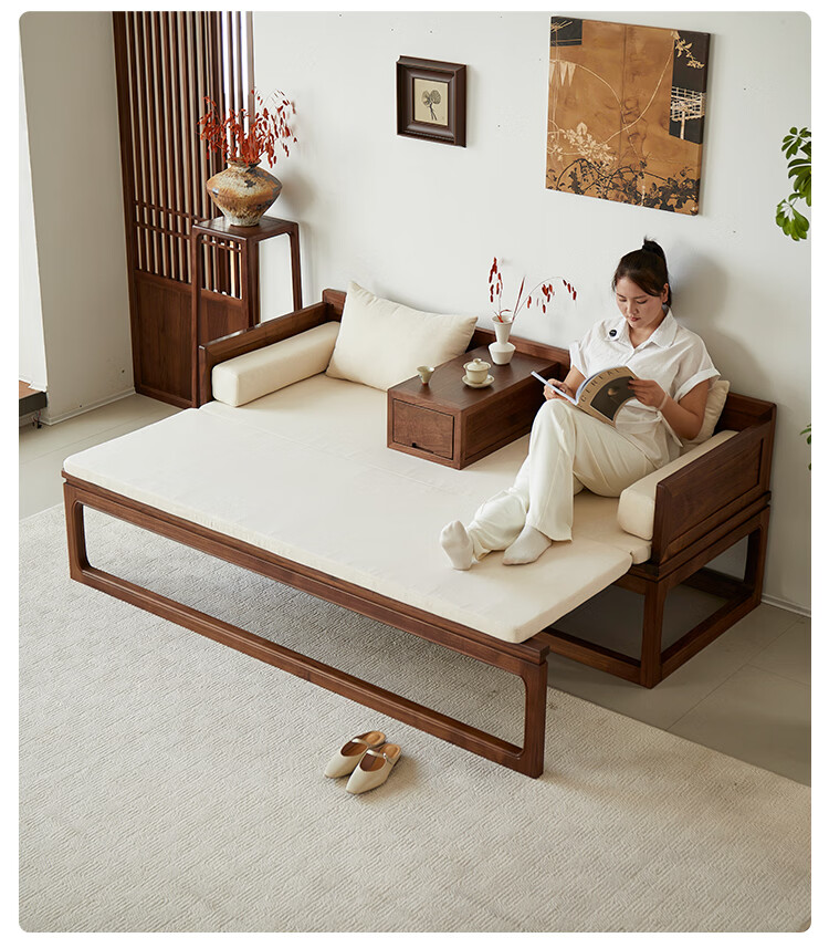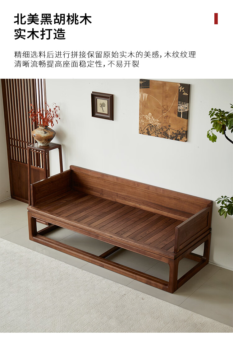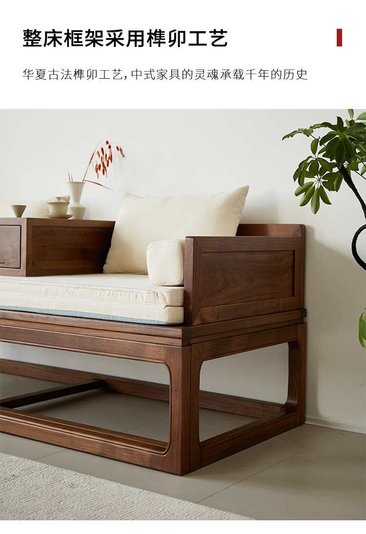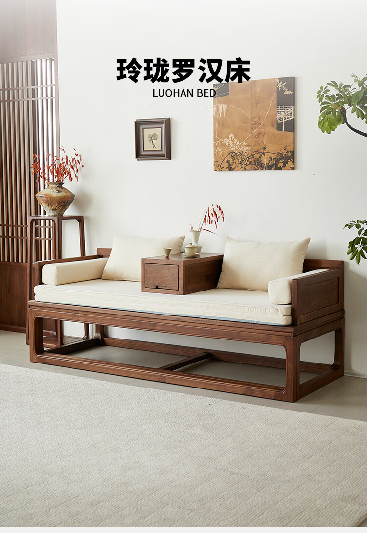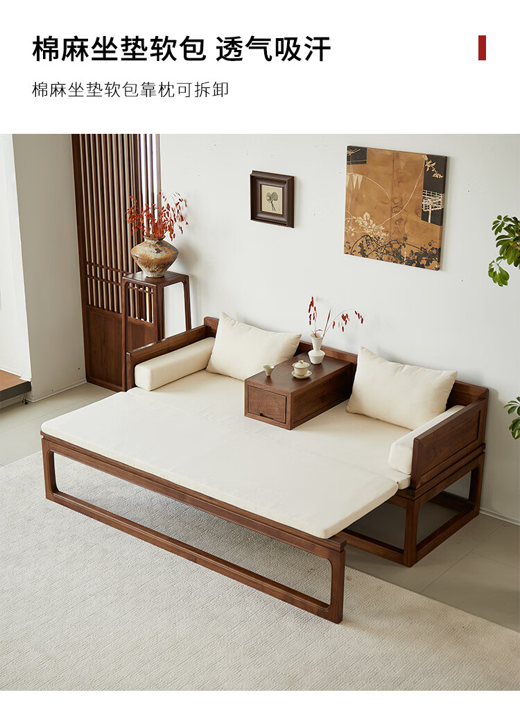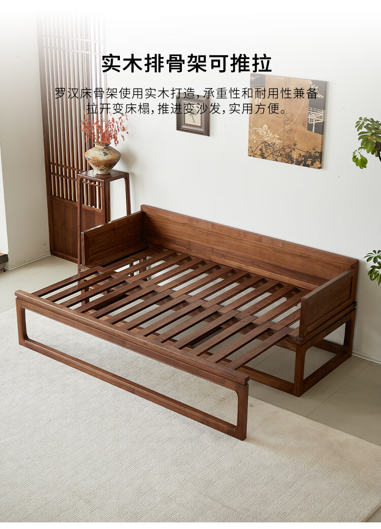 梵而罗汉床实木沙发床北美黑胡桃新中式坐卧两用推拉式布艺罗汉沙发 玲珑罗汉床【两用-推拉式】