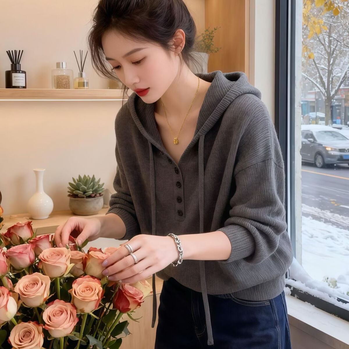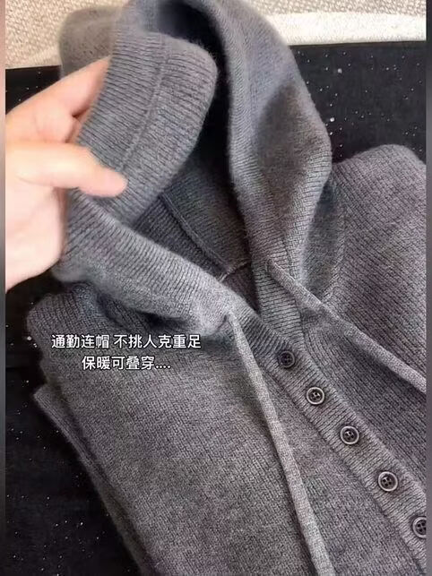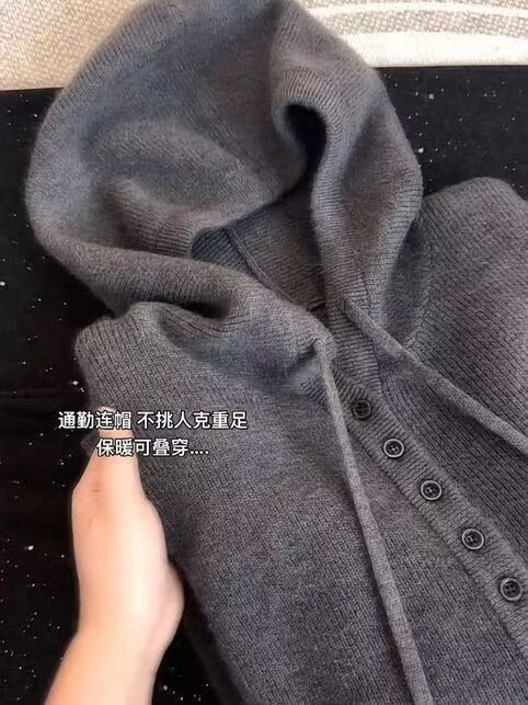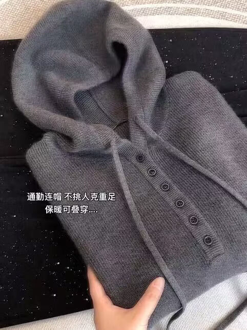 【商场品质】秋冬韩系连帽纽扣设计长袖针织衫女通勤保暖大码上衣 灰色 L 【建议120-140斤】