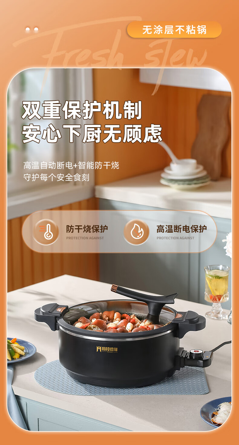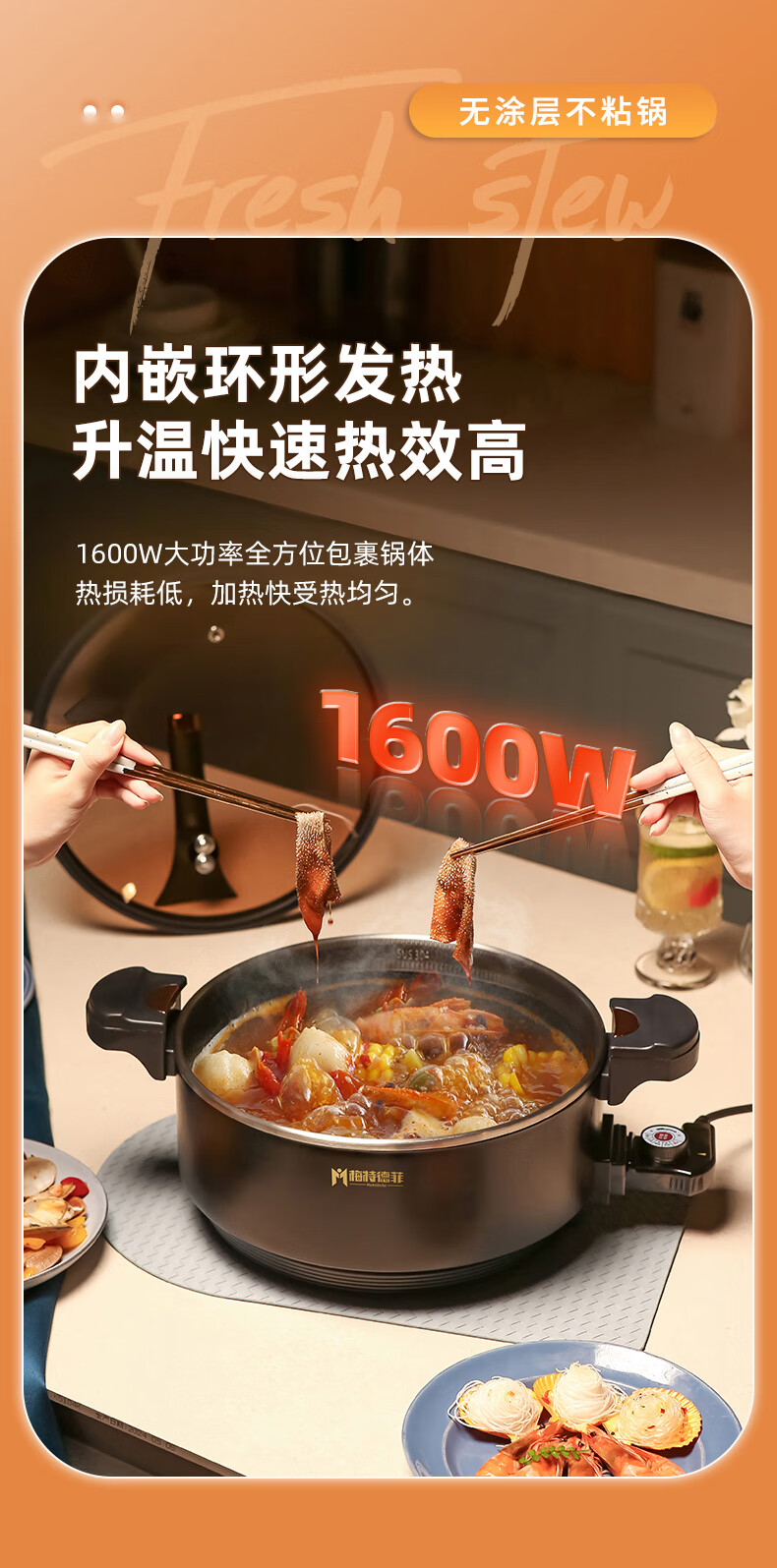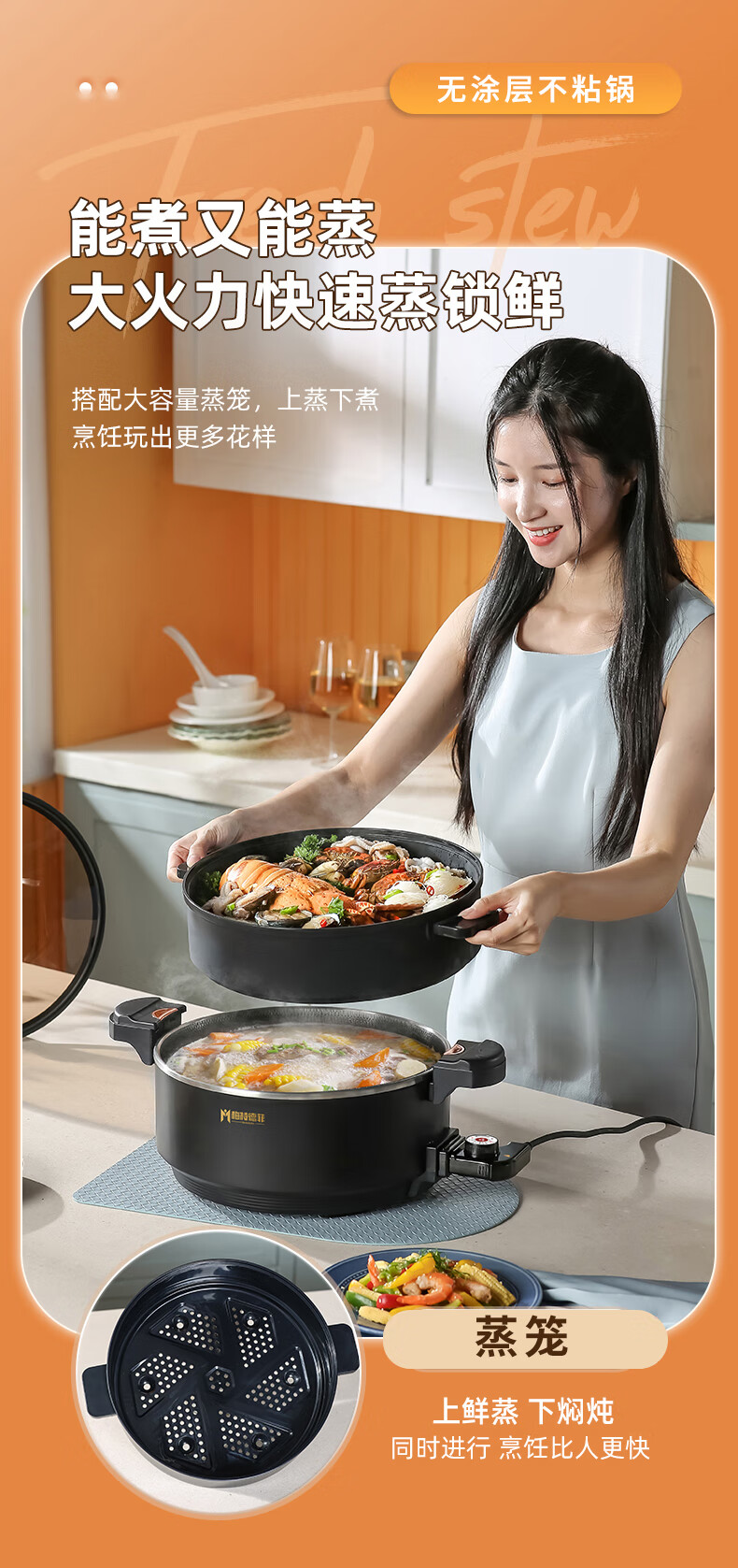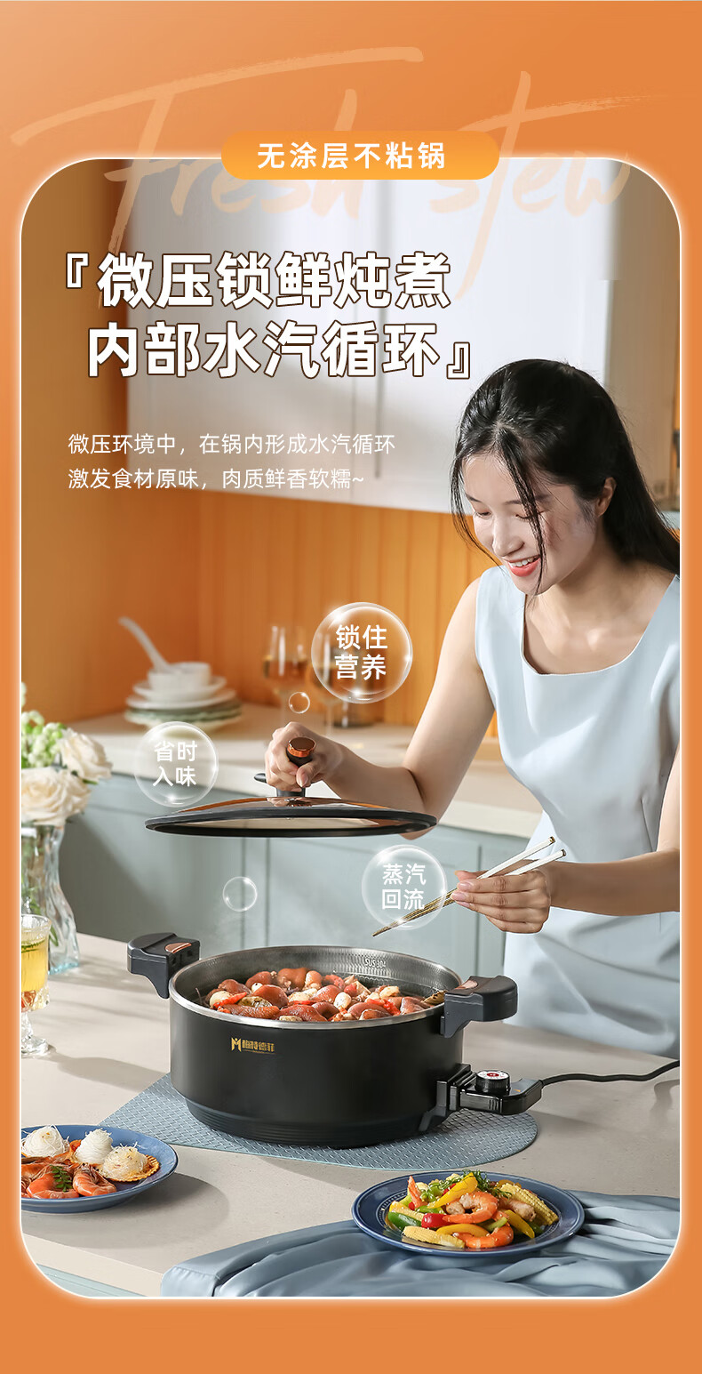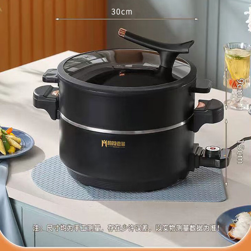 梅特德菲蜂窝晶刻电子微压锅不粘锅电火锅电煮锅家用电炒锅蒸锅多功能一体锅 【奢华黑】30cm口径适合1-4人 6L 【1600W功率】加热快省电耐用